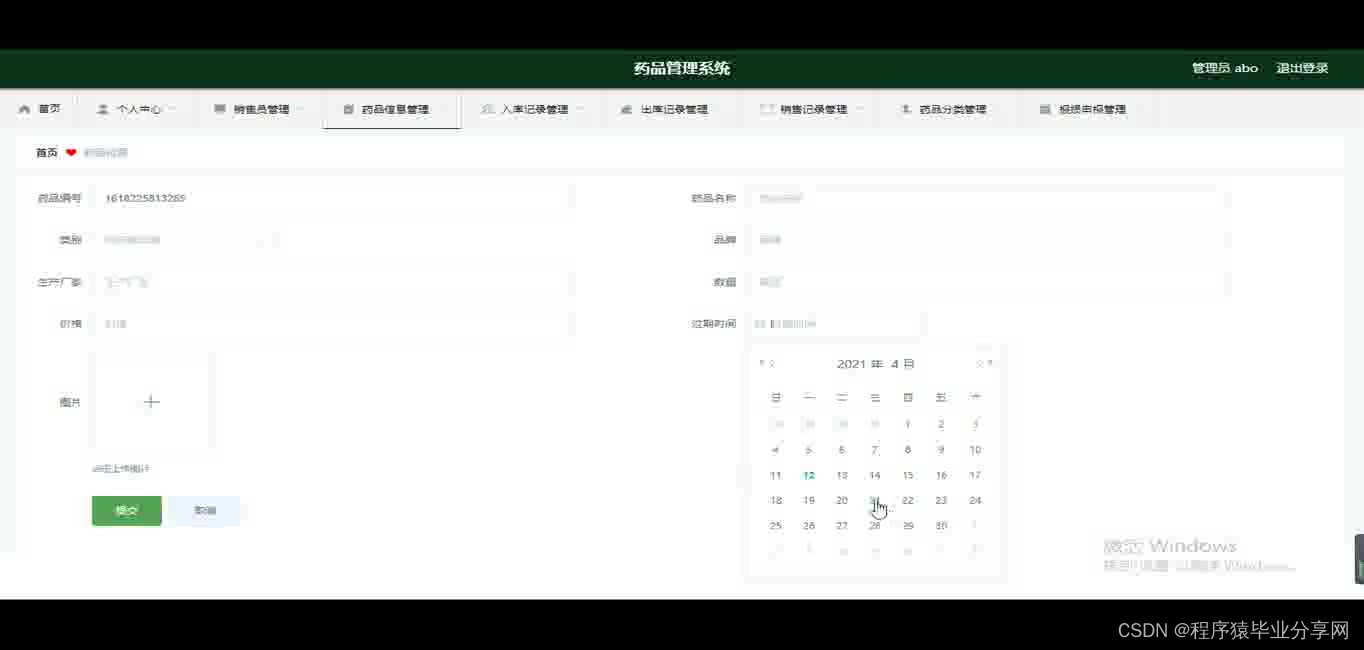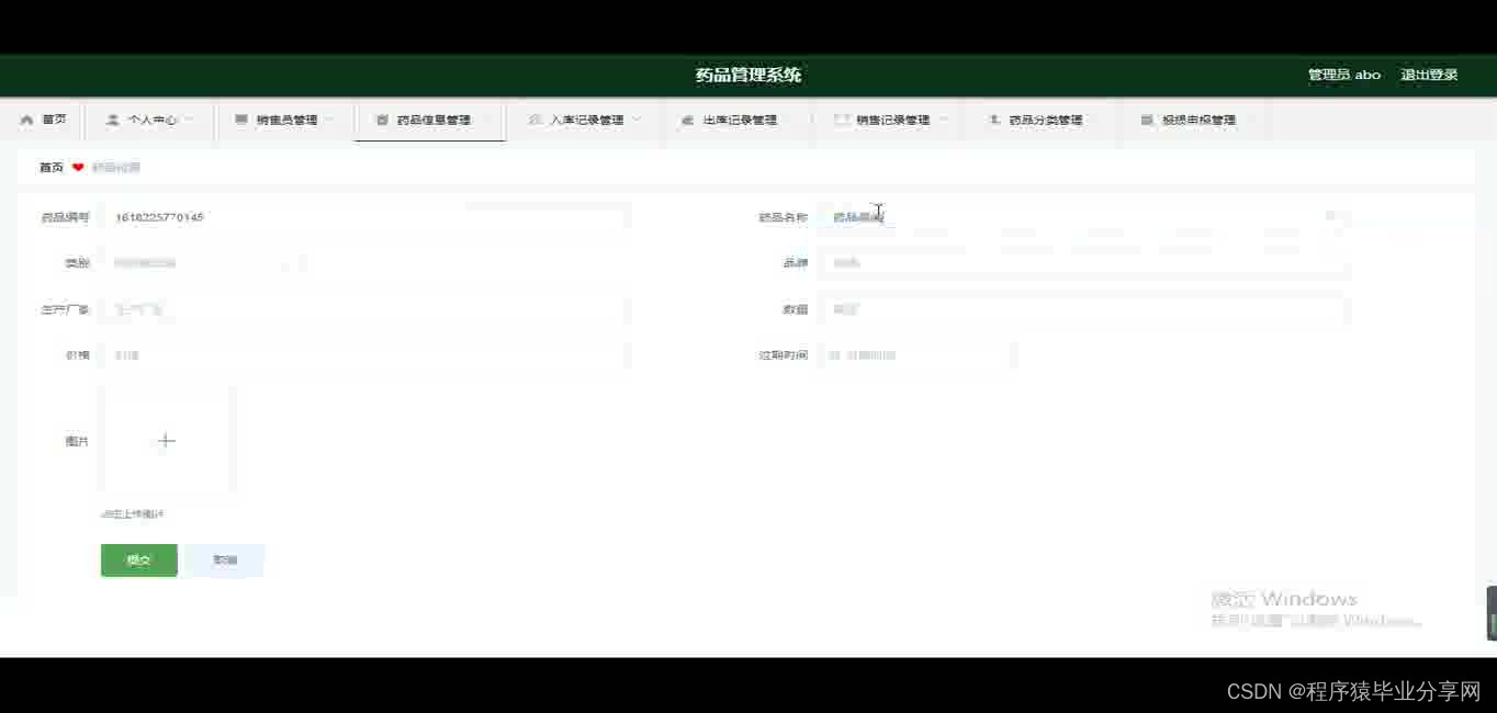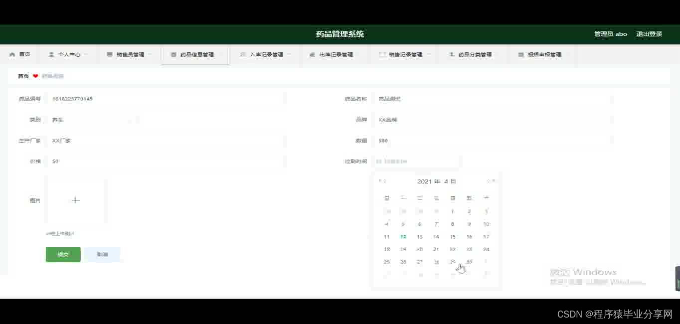 The drug management system is coded in the Java language in the Eclipse environment, and Mysql is used to create a data table to save the data generated by the system. The system can provide information display and corresponding services. Its administrator can count the sales of drugs, export the records of drug entry and exit, manage drugs and report damage information. The salesperson manages the medicines, sells them, puts them in, leaves the warehouse, and reports damages.