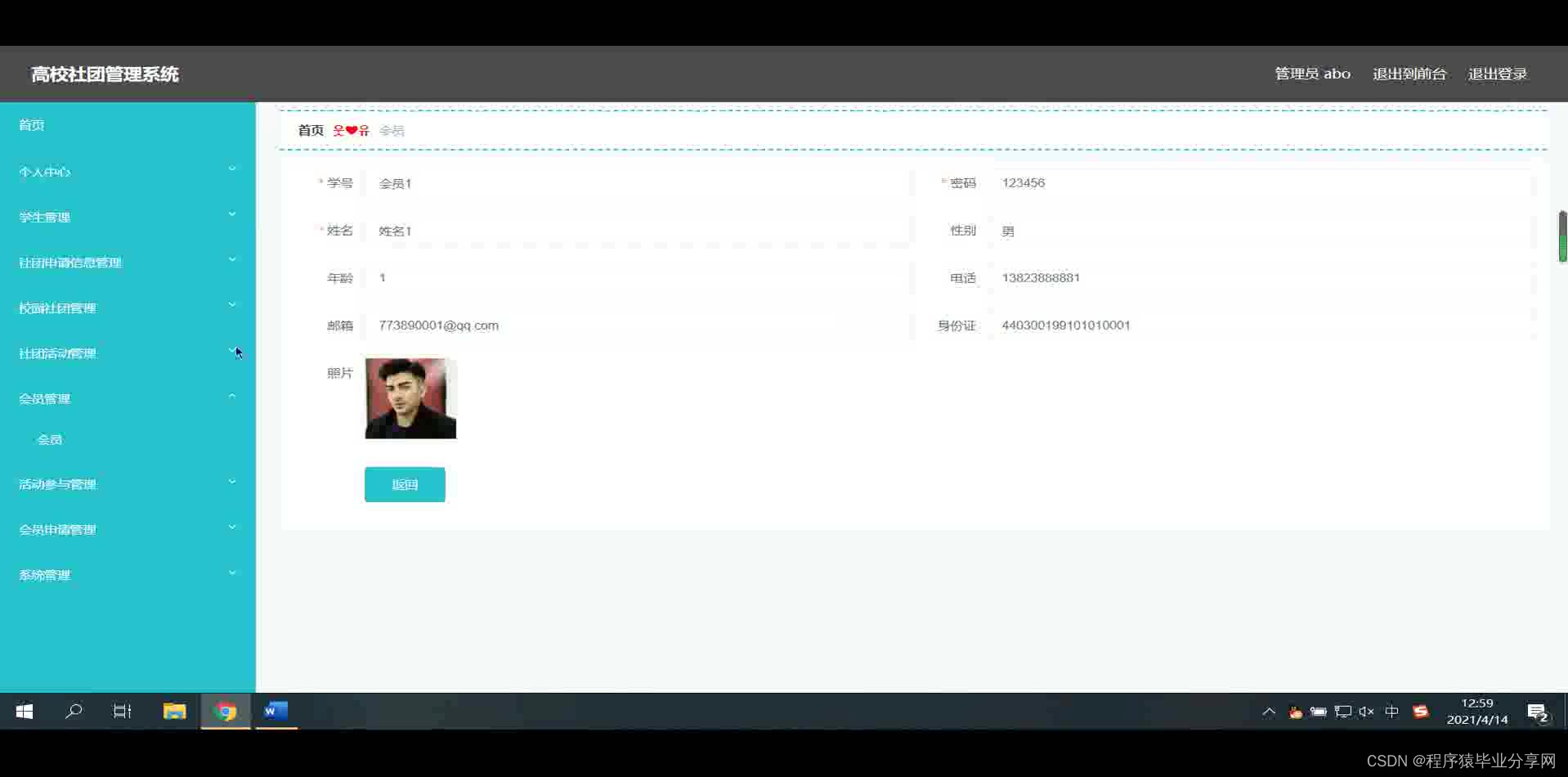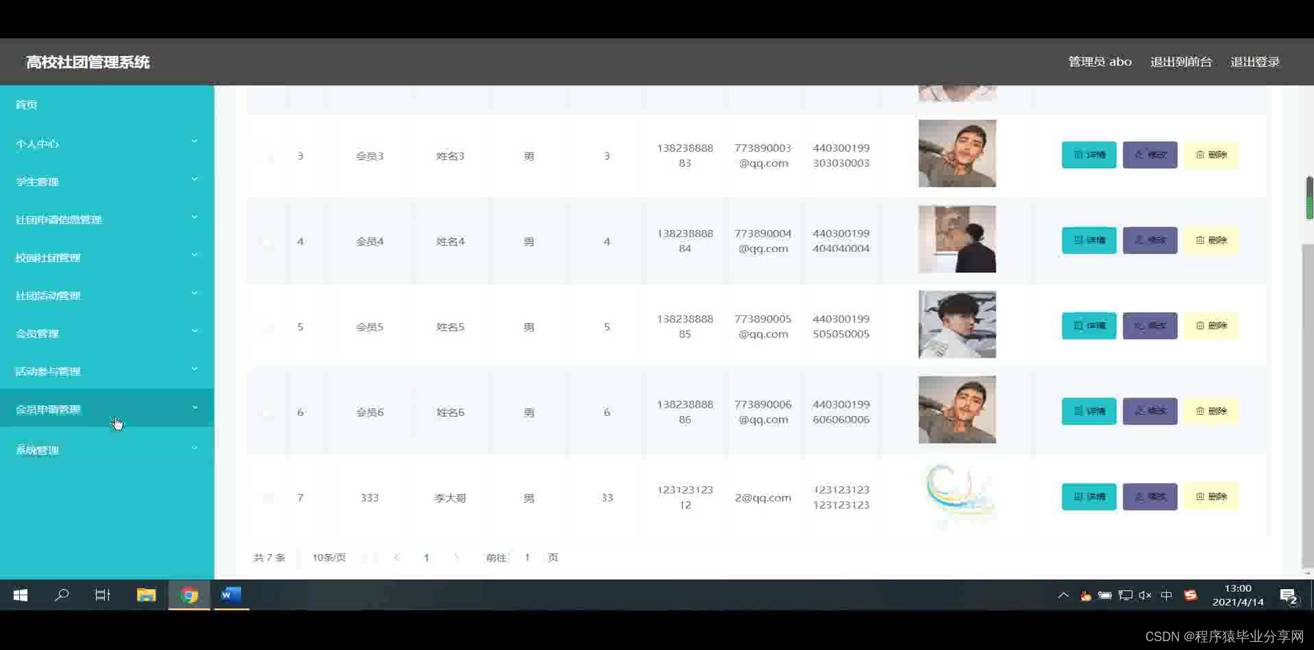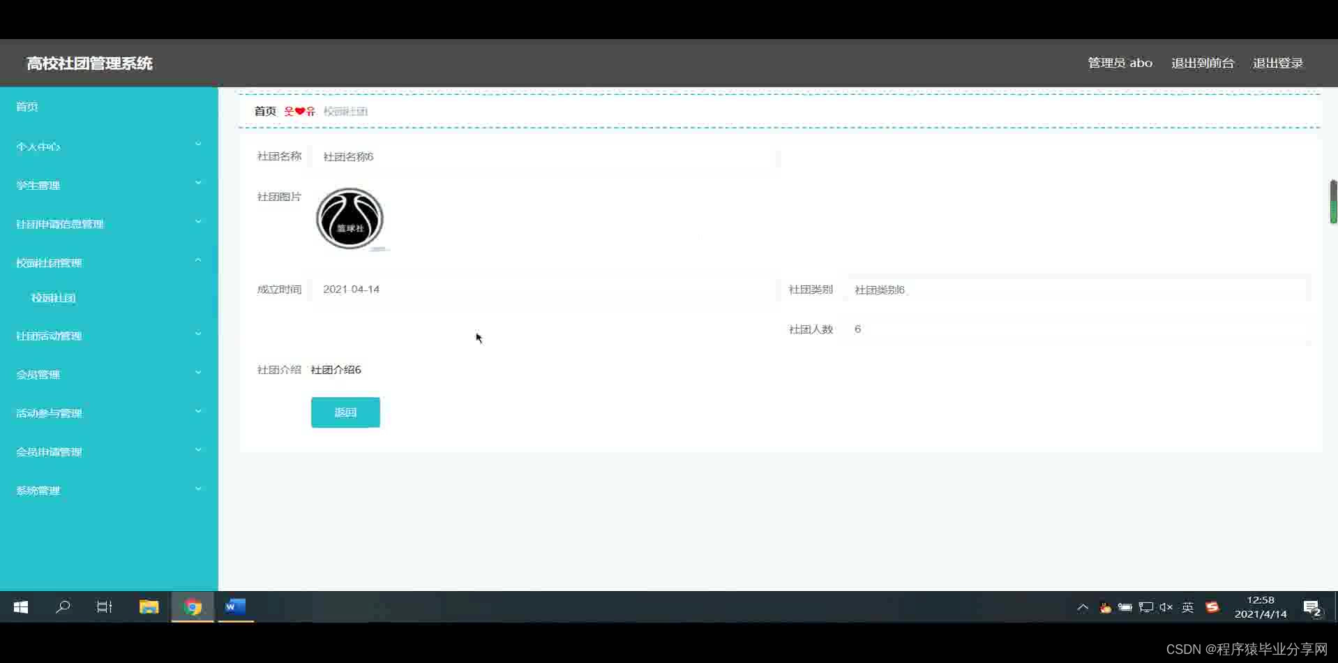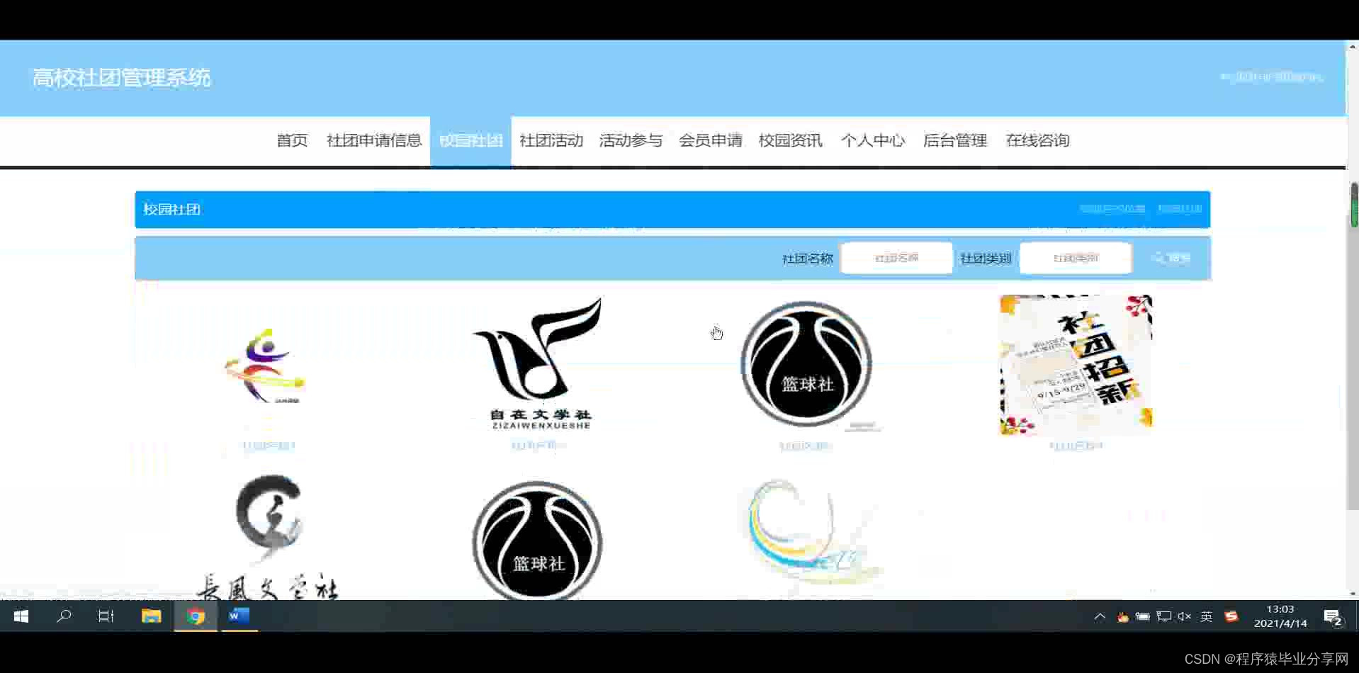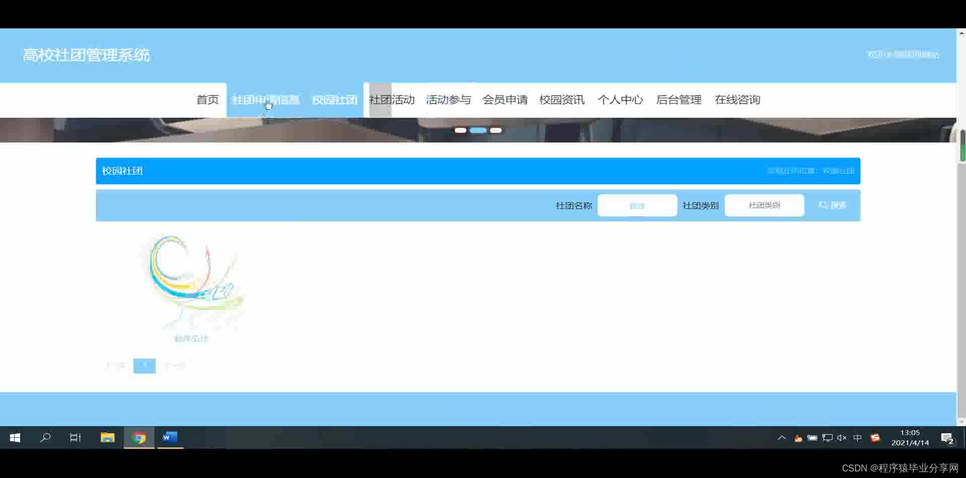 本系统以Java为开发技术,实现高校社团管理系统。高校社团管理系统的主要实现功能包括:管理员:首页、个人中心、学生管理、社团申请信息管理、校园社团管理、社团活动管理、会员管理、活动参与管理、会员申请管理、系统管理,会员;首页、个人中心、社团申请信息管理、校园社团管理、社团活动管理、活动参与管理,学生;首页、个人中心、校园社团管理、社团活动管理、会员申请管理,前台首页;首页、社团申请信息、校园社团、社团活动、活动参与、会员申请、校园资讯、个人中心、后台管理、在线资讯功能,基本上实现了整个高校社团管理系统的过程。