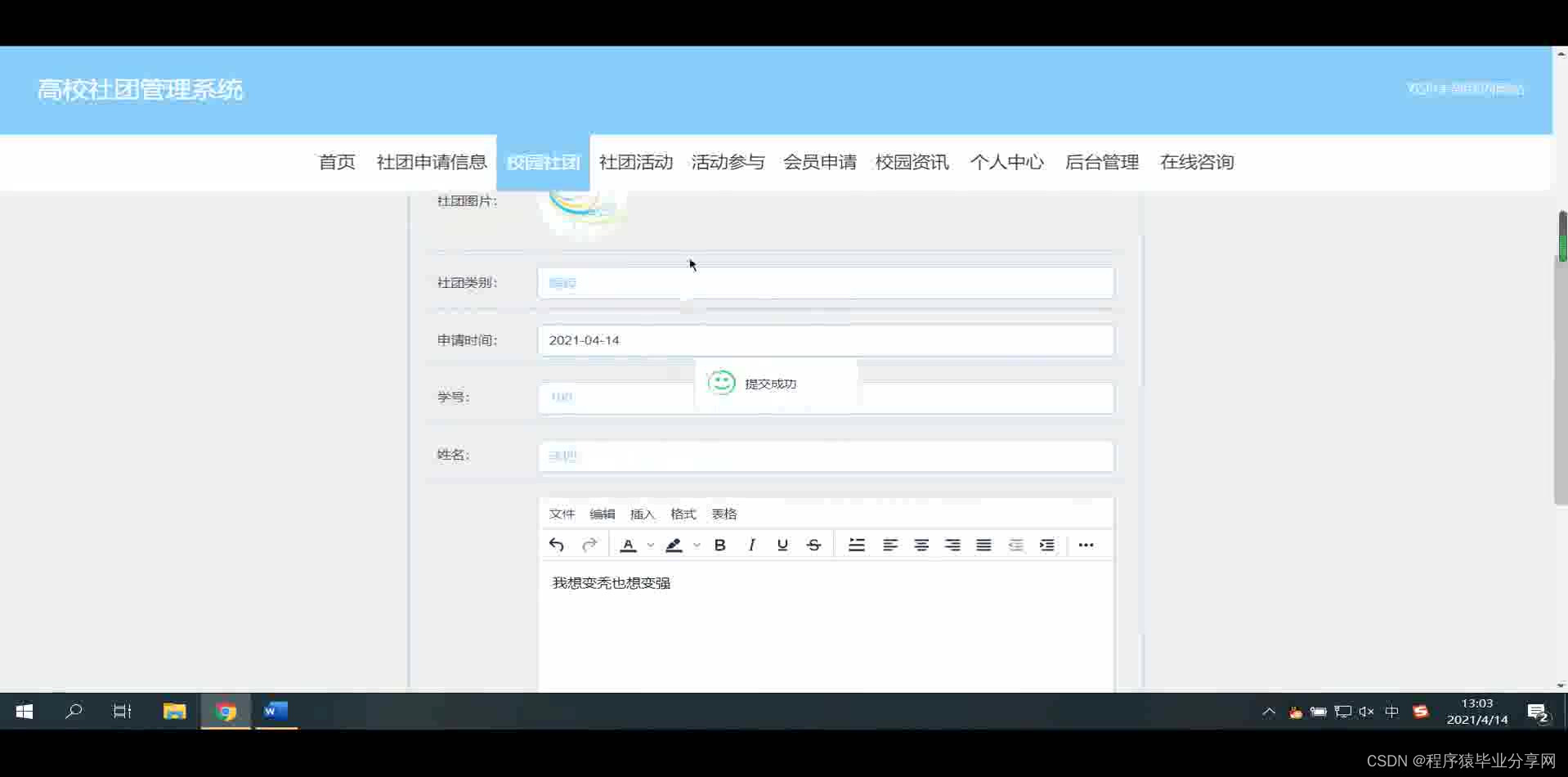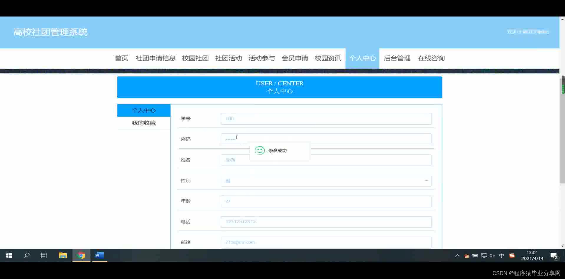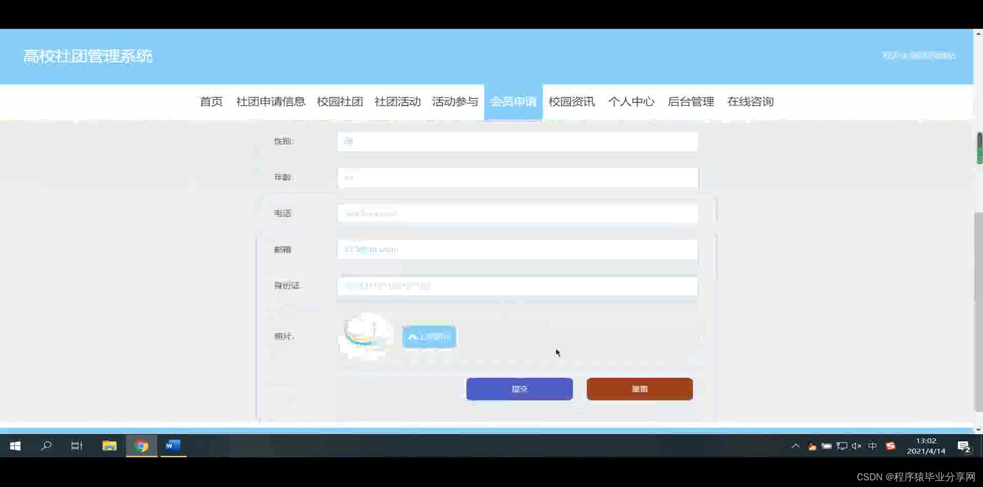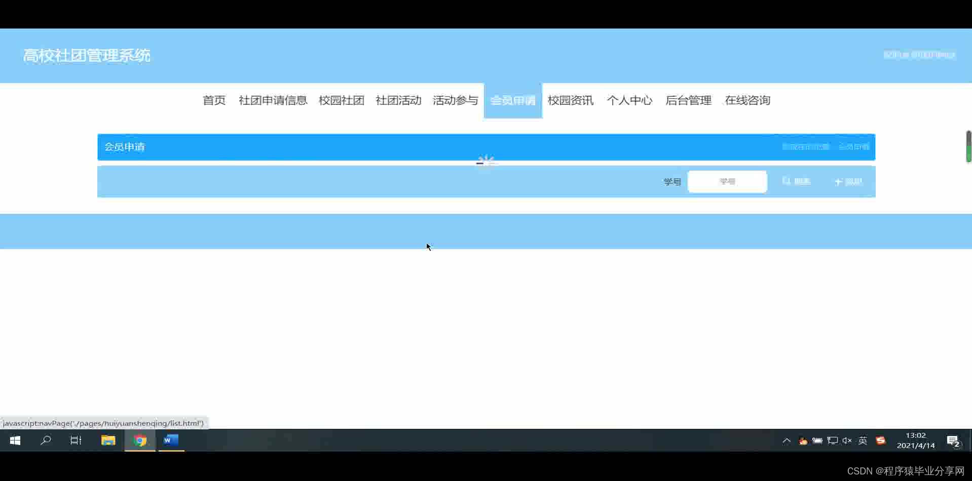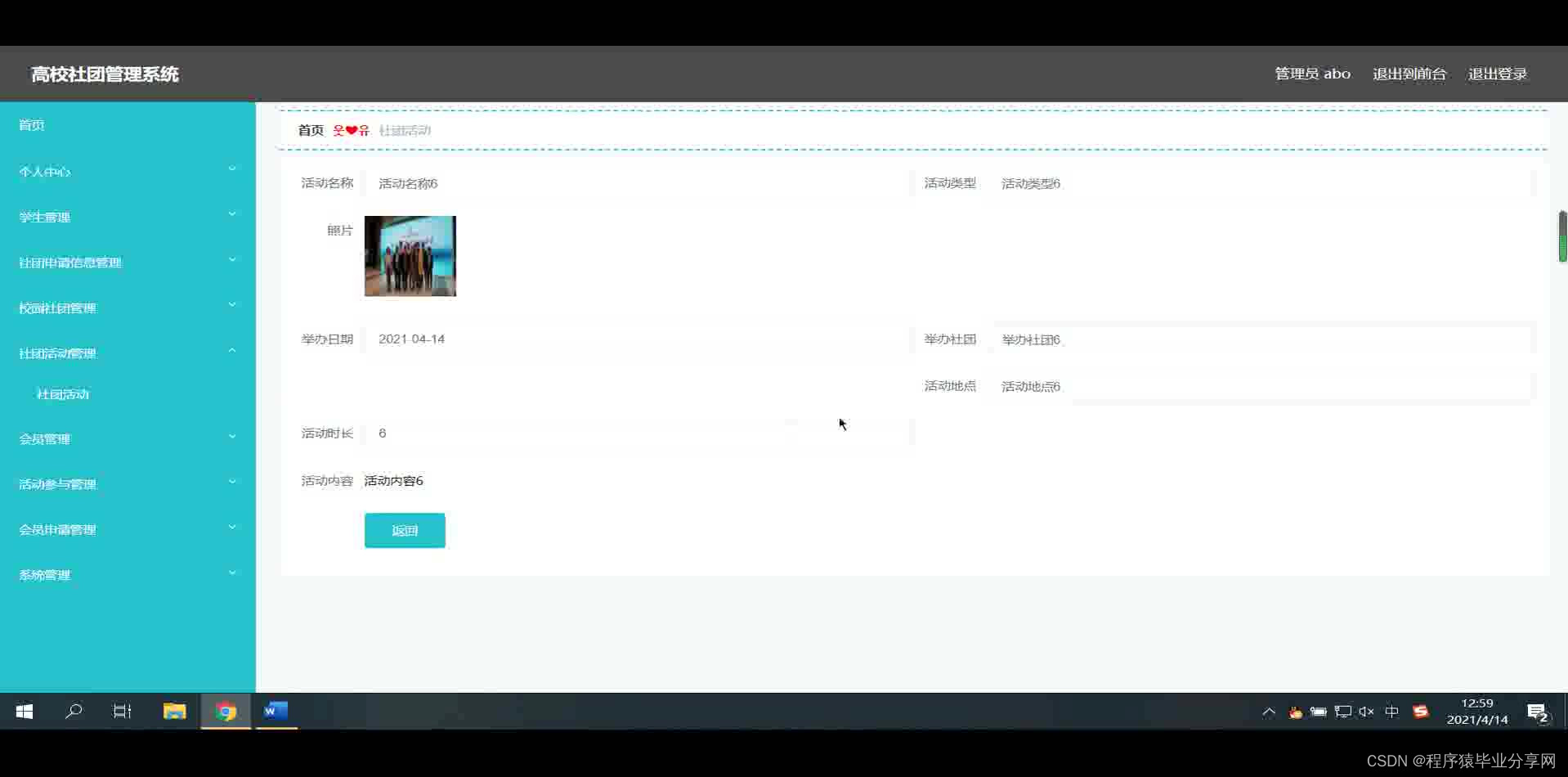 本系统以Java为开发技术,实现高校社团管理系统。高校社团管理系统的主要实现功能包括:管理员:首页、个人中心、学生管理、社团申请信息管理、校园社团管理、社团活动管理、会员管理、活动参与管理、会员申请管理、系统管理,会员;首页、个人中心、社团申请信息管理、校园社团管理、社团活动管理、活动参与管理,学生;首页、个人中心、校园社团管理、社团活动管理、会员申请管理,前台首页;首页、社团申请信息、校园社团、社团活动、活动参与、会员申请、校园资讯、个人中心、后台管理、在线资讯功能,基本上实现了整个高校社团管理系统的过程。