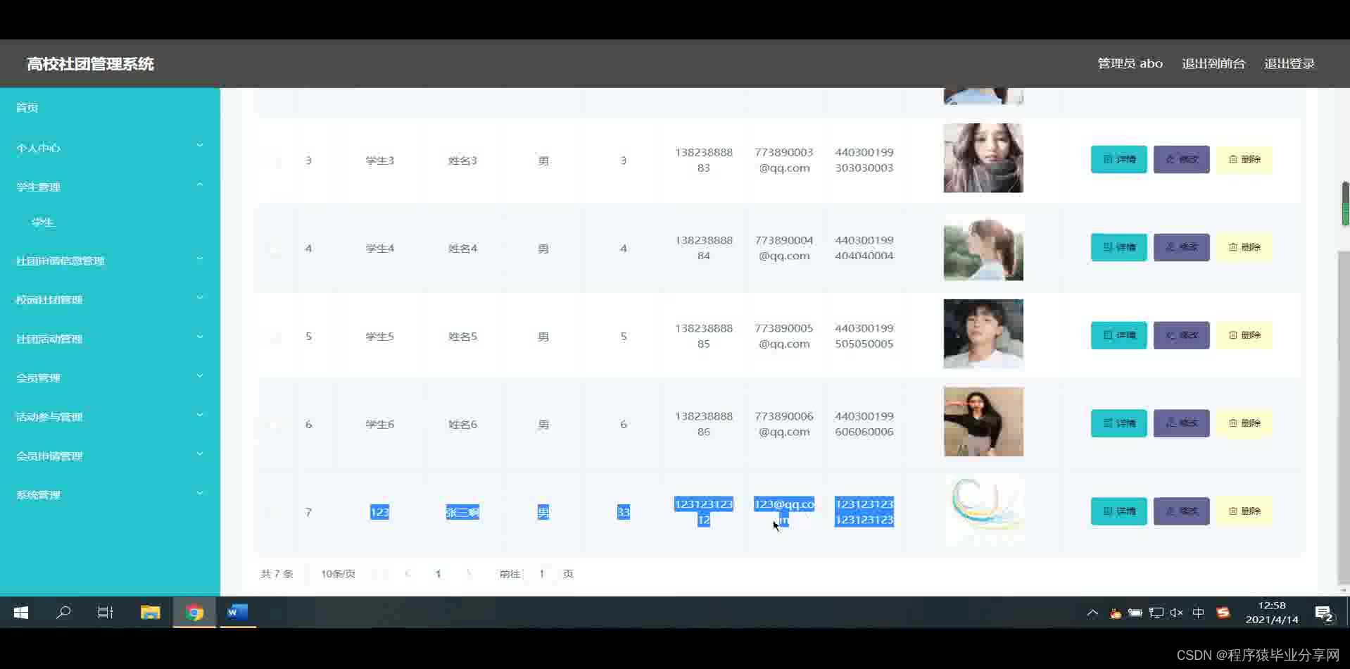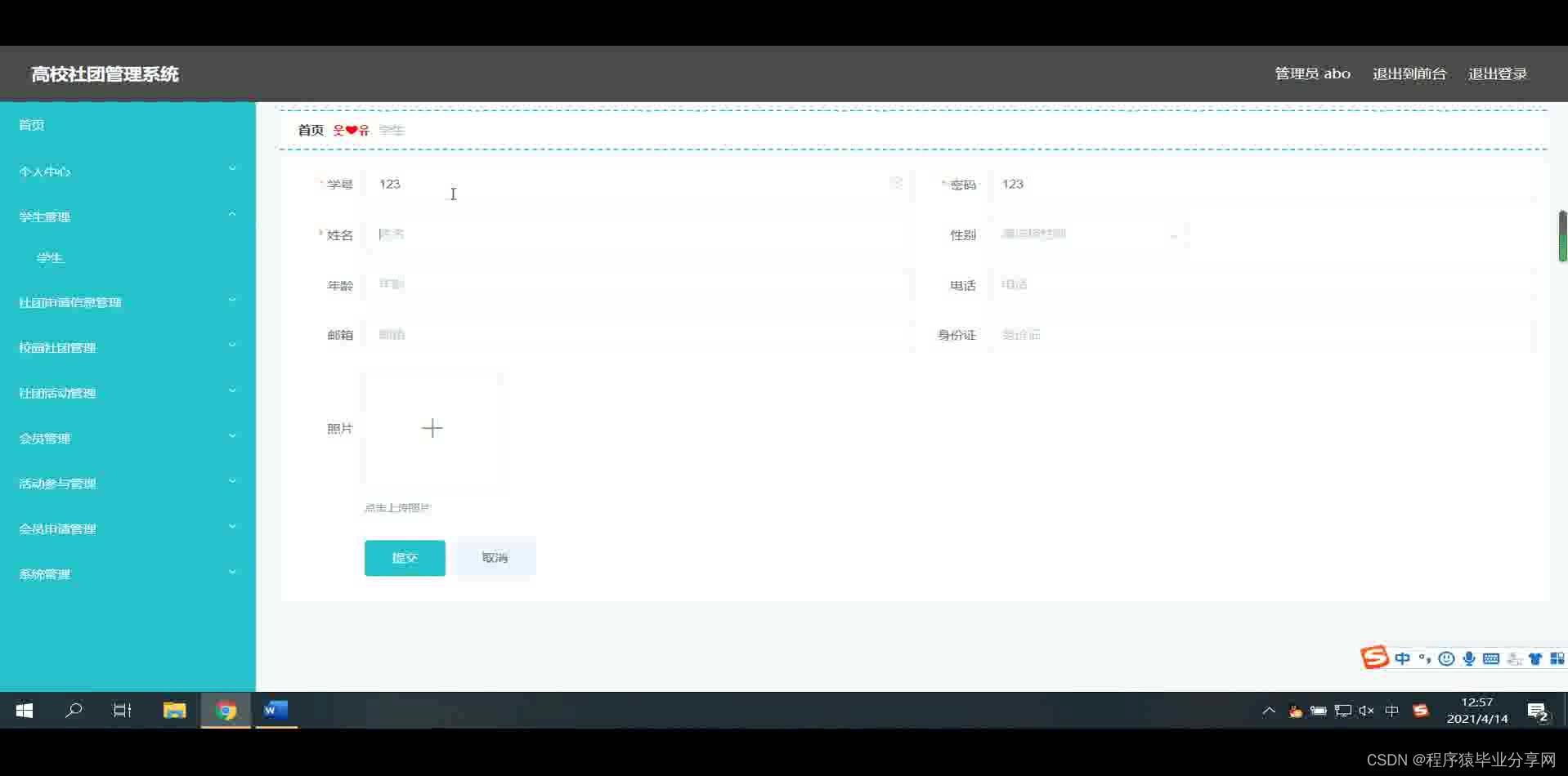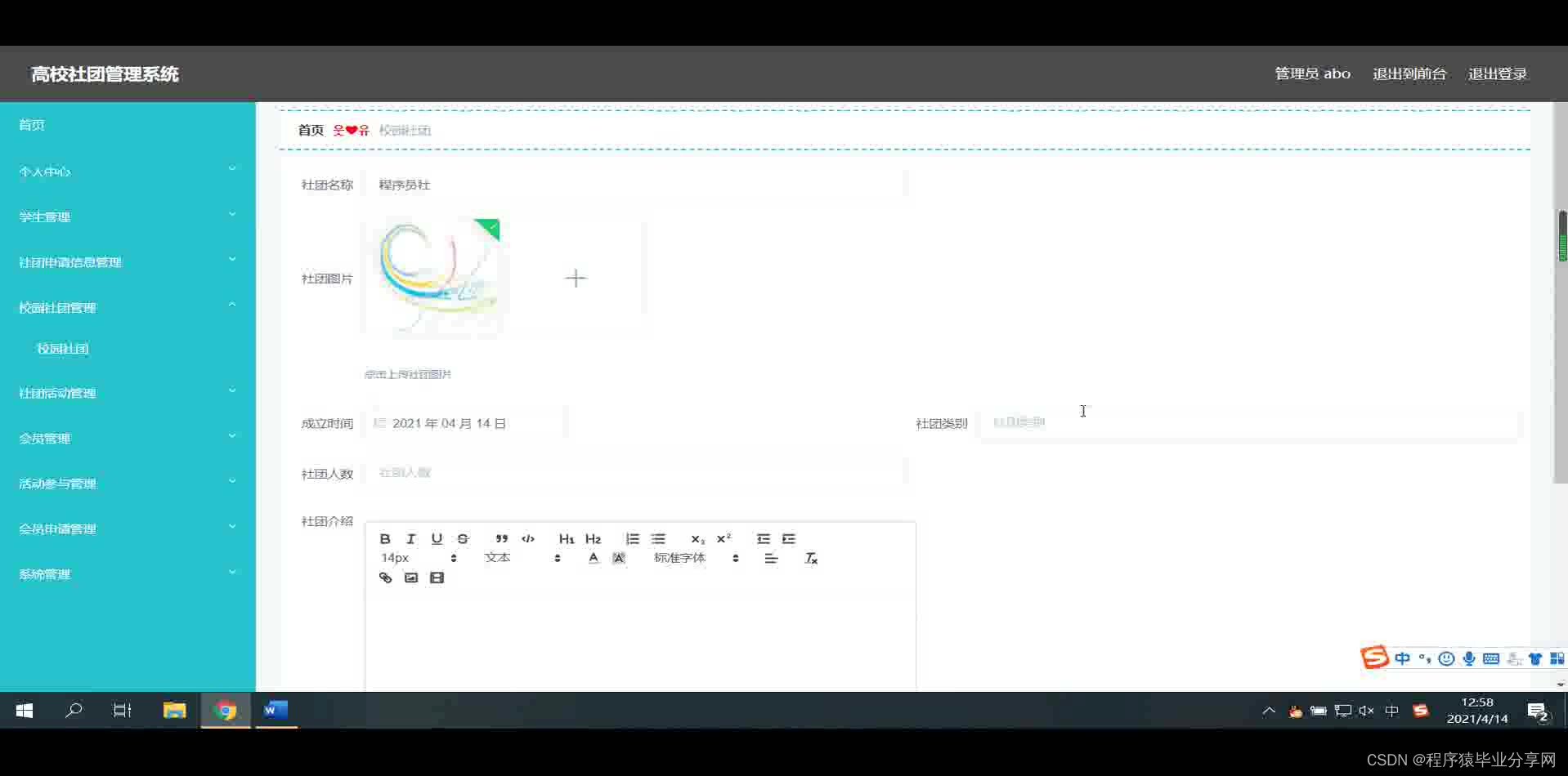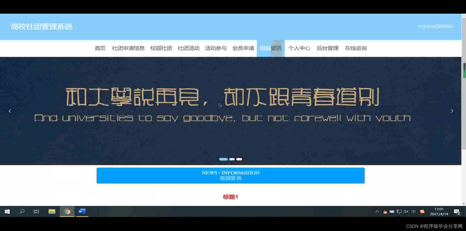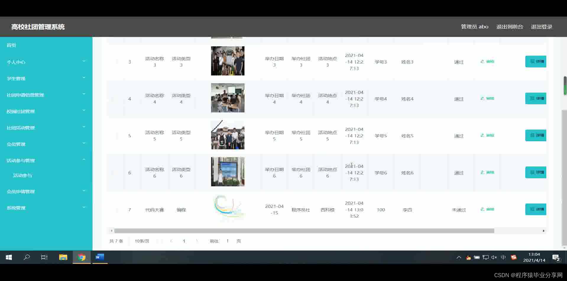 本系统以Java为开发技术,实现高校社团管理系统。高校社团管理系统的主要实现功能包括:管理员:首页、个人中心、学生管理、社团申请信息管理、校园社团管理、社团活动管理、会员管理、活动参与管理、会员申请管理、系统管理,会员;首页、个人中心、社团申请信息管理、校园社团管理、社团活动管理、活动参与管理,学生;首页、个人中心、校园社团管理、社团活动管理、会员申请管理,前台首页;首页、社团申请信息、校园社团、社团活动、活动参与、会员申请、校园资讯、个人中心、后台管理、在线资讯功能,基本上实现了整个高校社团管理系统的过程。