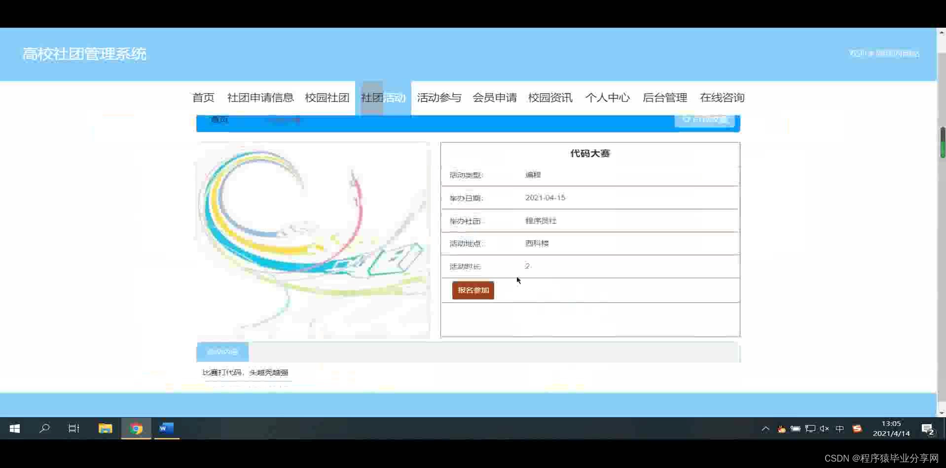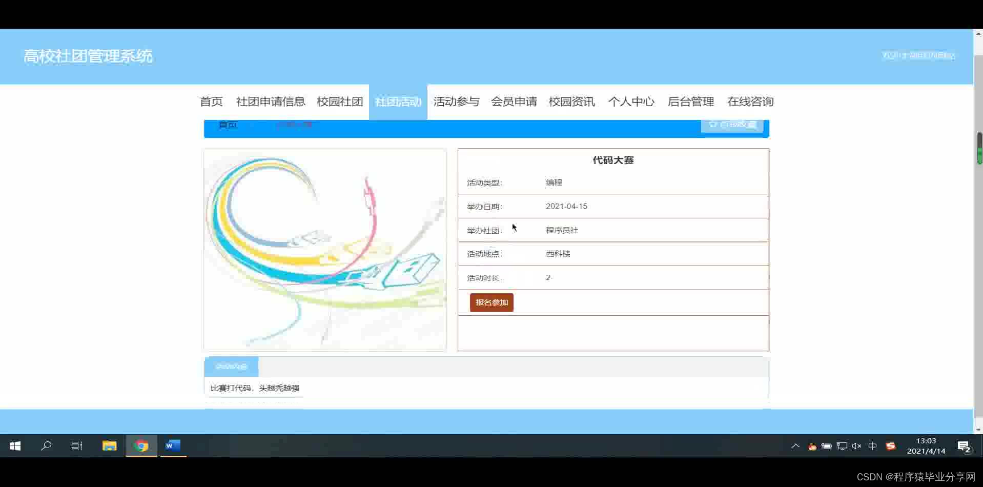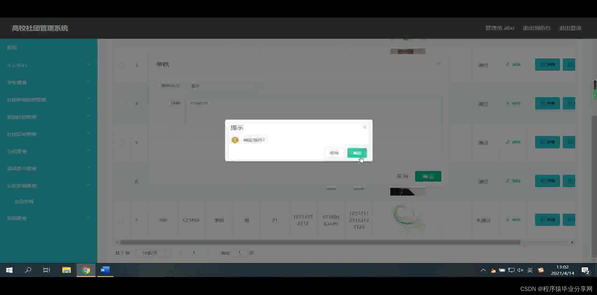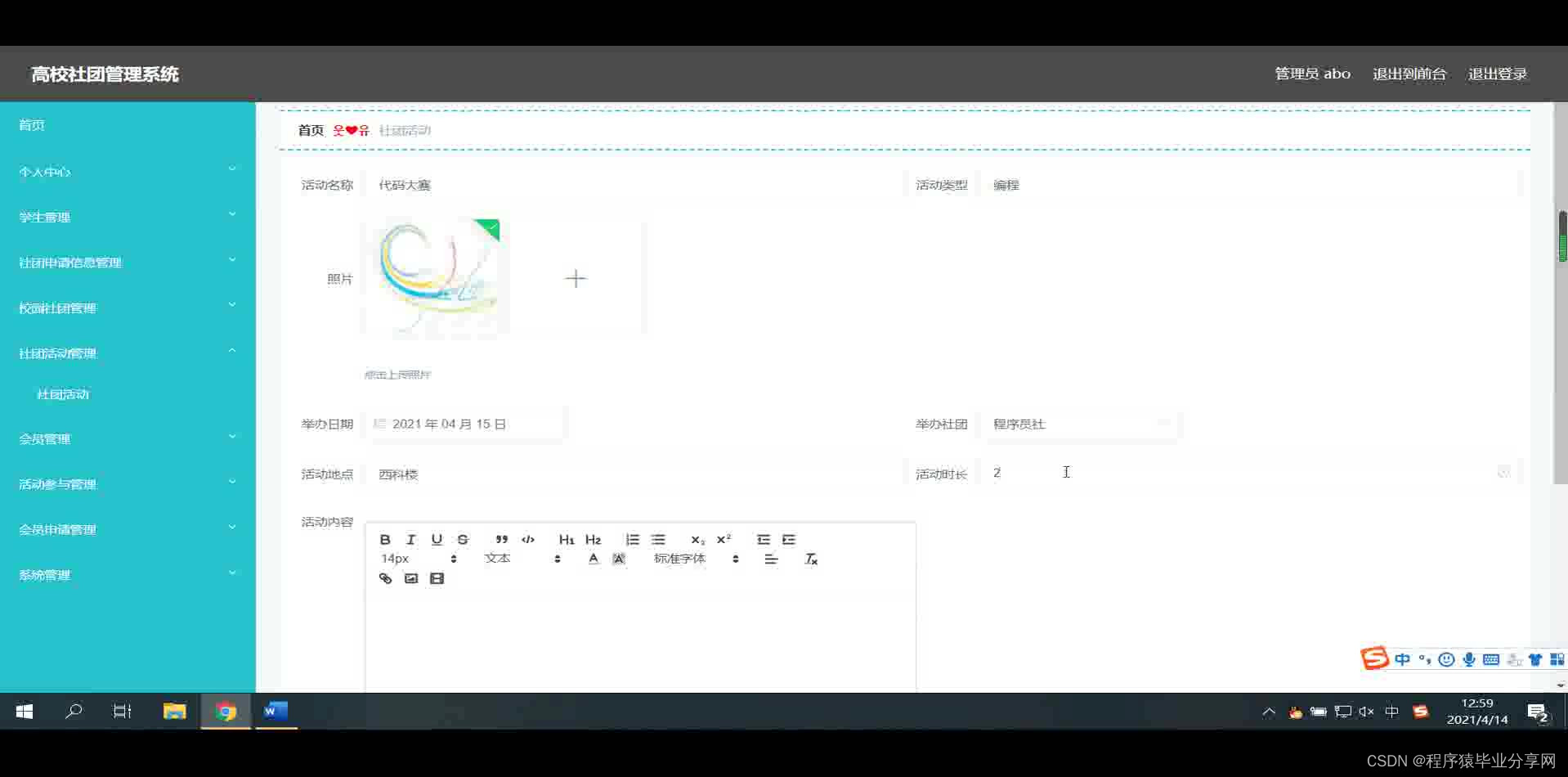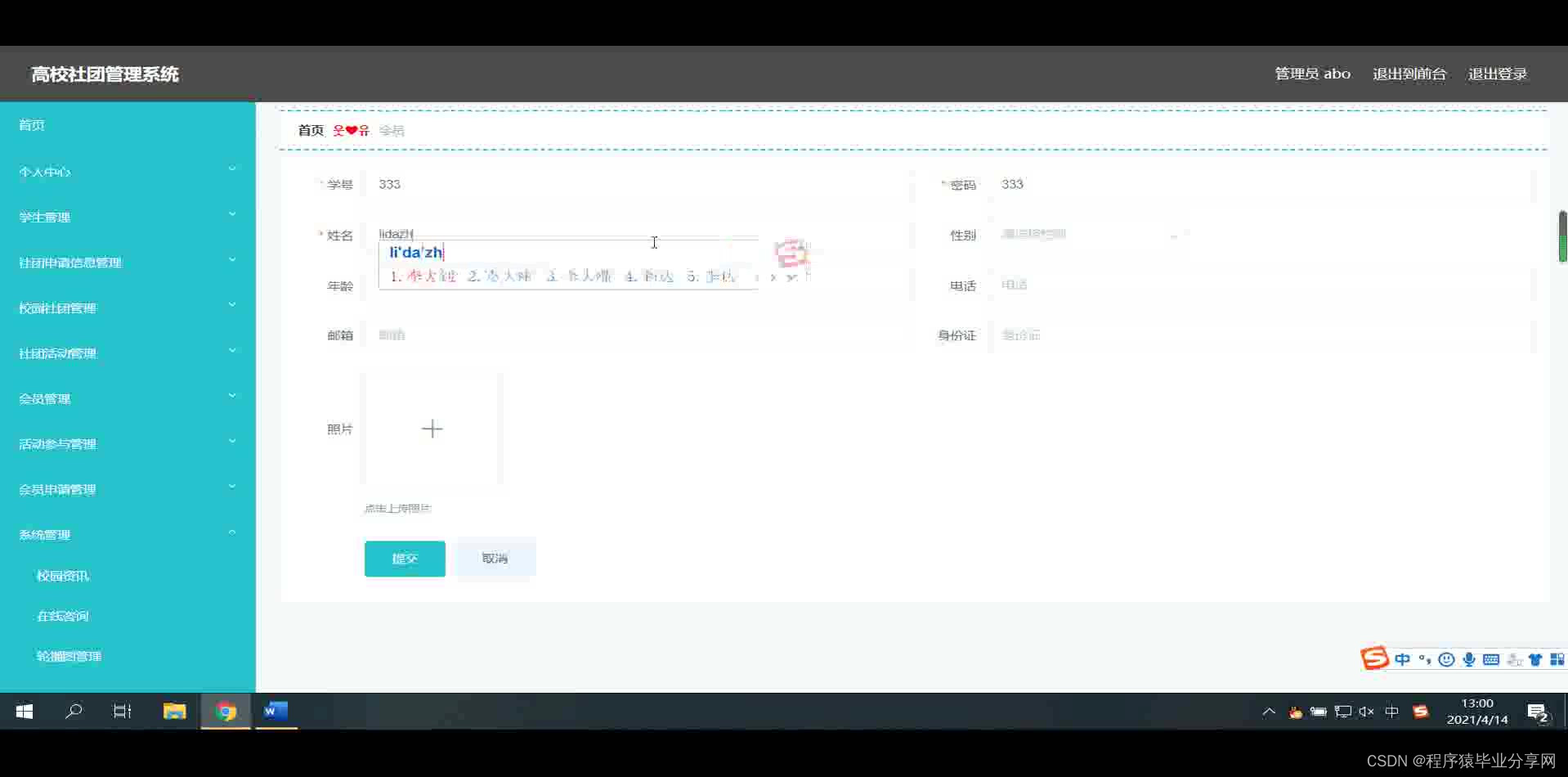 本系统以Java为开发技术,实现高校社团管理系统。高校社团管理系统的主要实现功能包括:管理员:首页、个人中心、学生管理、社团申请信息管理、校园社团管理、社团活动管理、会员管理、活动参与管理、会员申请管理、系统管理,会员;首页、个人中心、社团申请信息管理、校园社团管理、社团活动管理、活动参与管理,学生;首页、个人中心、校园社团管理、社团活动管理、会员申请管理,前台首页;首页、社团申请信息、校园社团、社团活动、活动参与、会员申请、校园资讯、个人中心、后台管理、在线资讯功能,基本上实现了整个高校社团管理系统的过程。