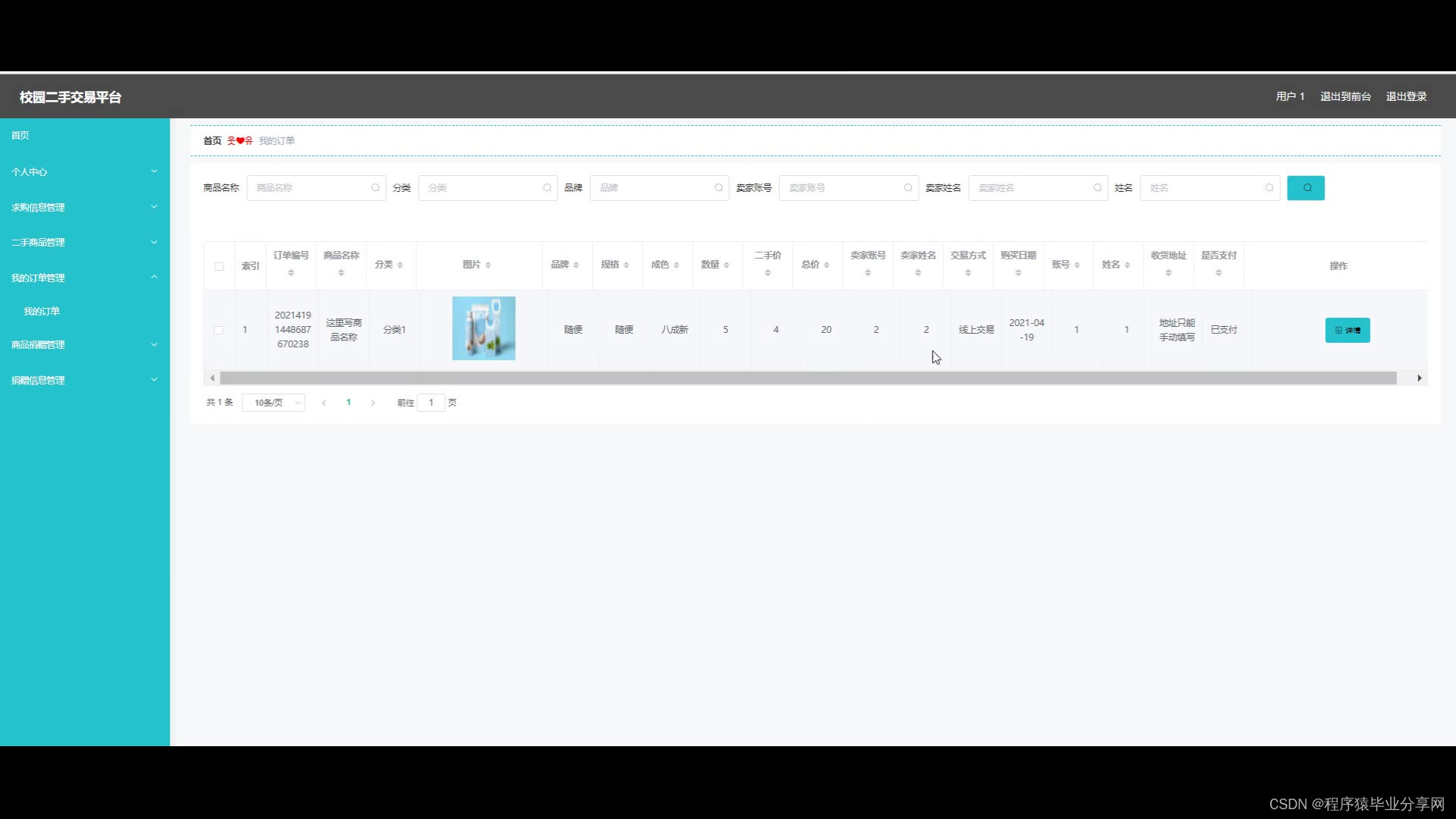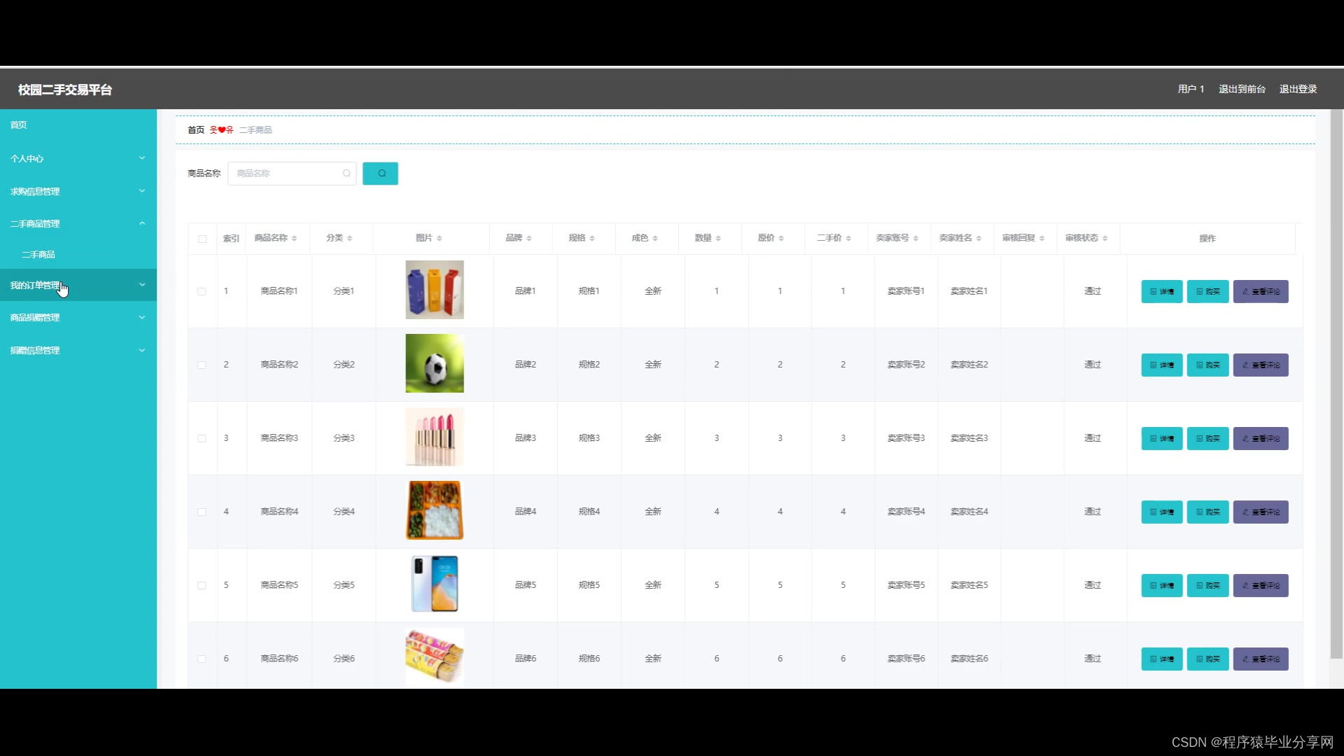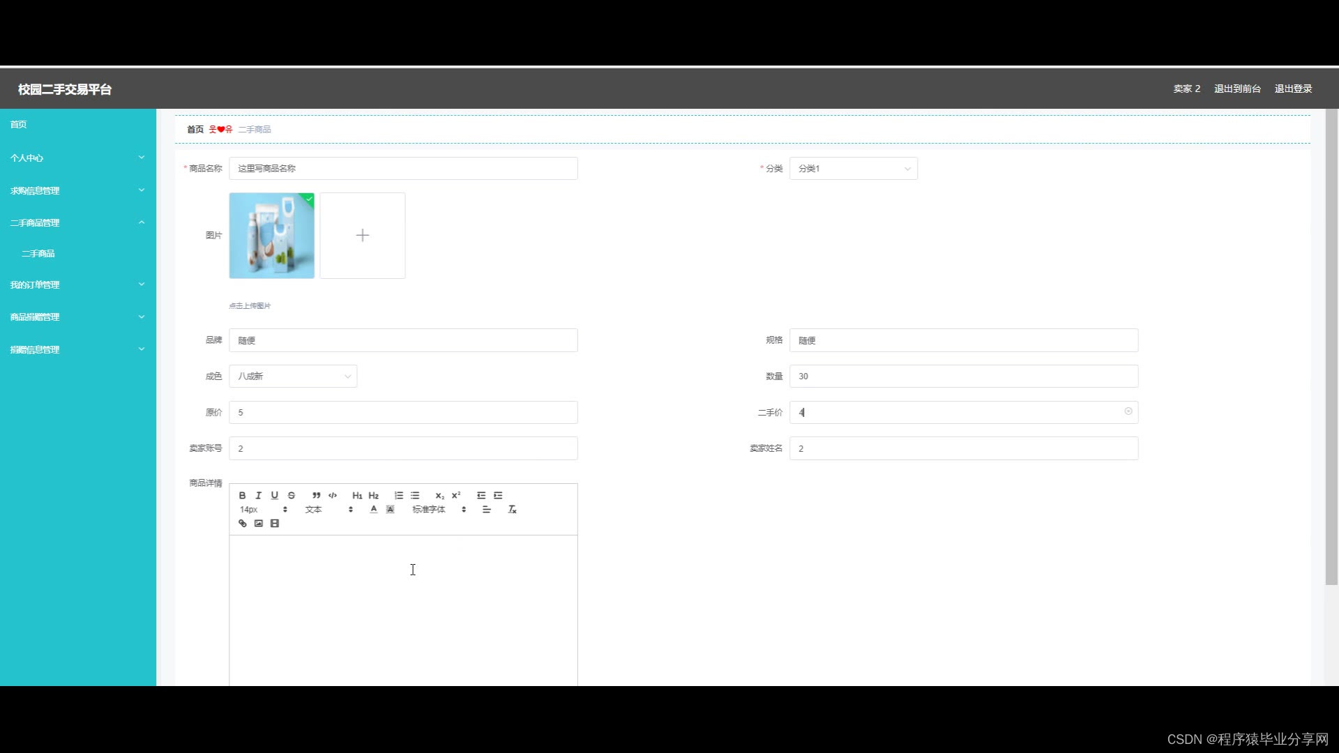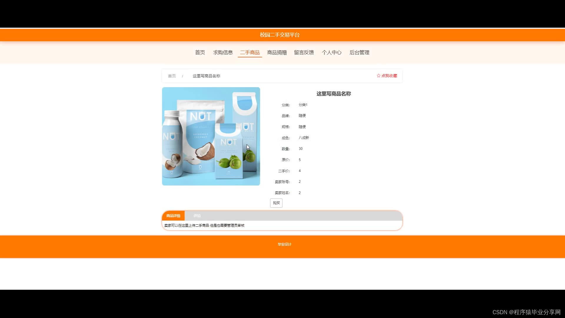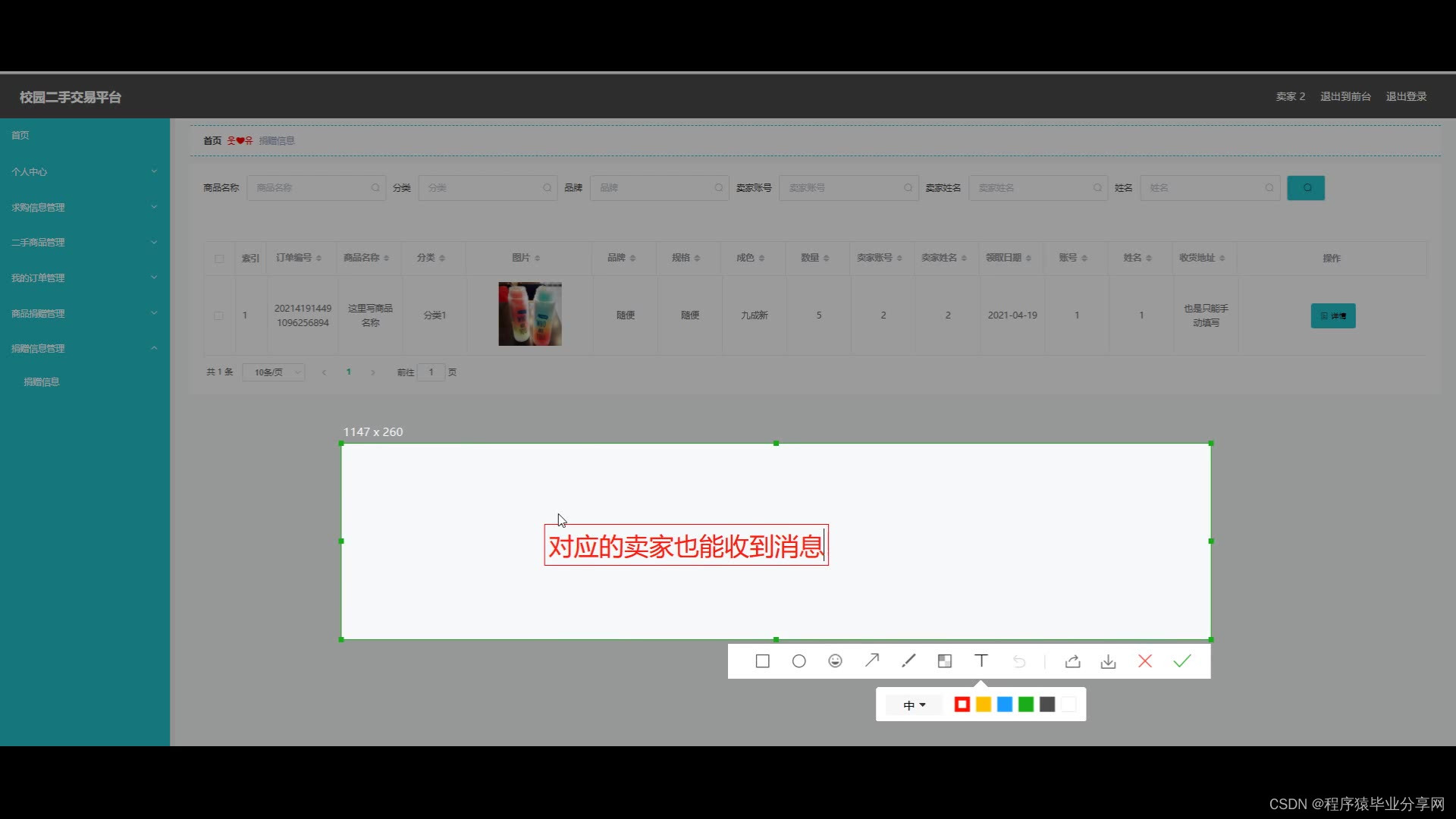 本校园二手交易平台有管理员,卖家和用户三个角色。管理员功能有,个人中心,用户管理,卖家管理,分类管理,求购信息管理,二手商品管理,我的订单管理,商品捐赠管理,捐赠信息管理,留言板管理,系统管理。卖家功能有个人中心,求购信息管理,二手商品管理,我的订单管理,商品捐赠管理,捐赠信息管理。用户功能有个人中心,求购信息,二手商品,我的订单管理,商品捐赠,留言反馈。因而具有一定的实用性。