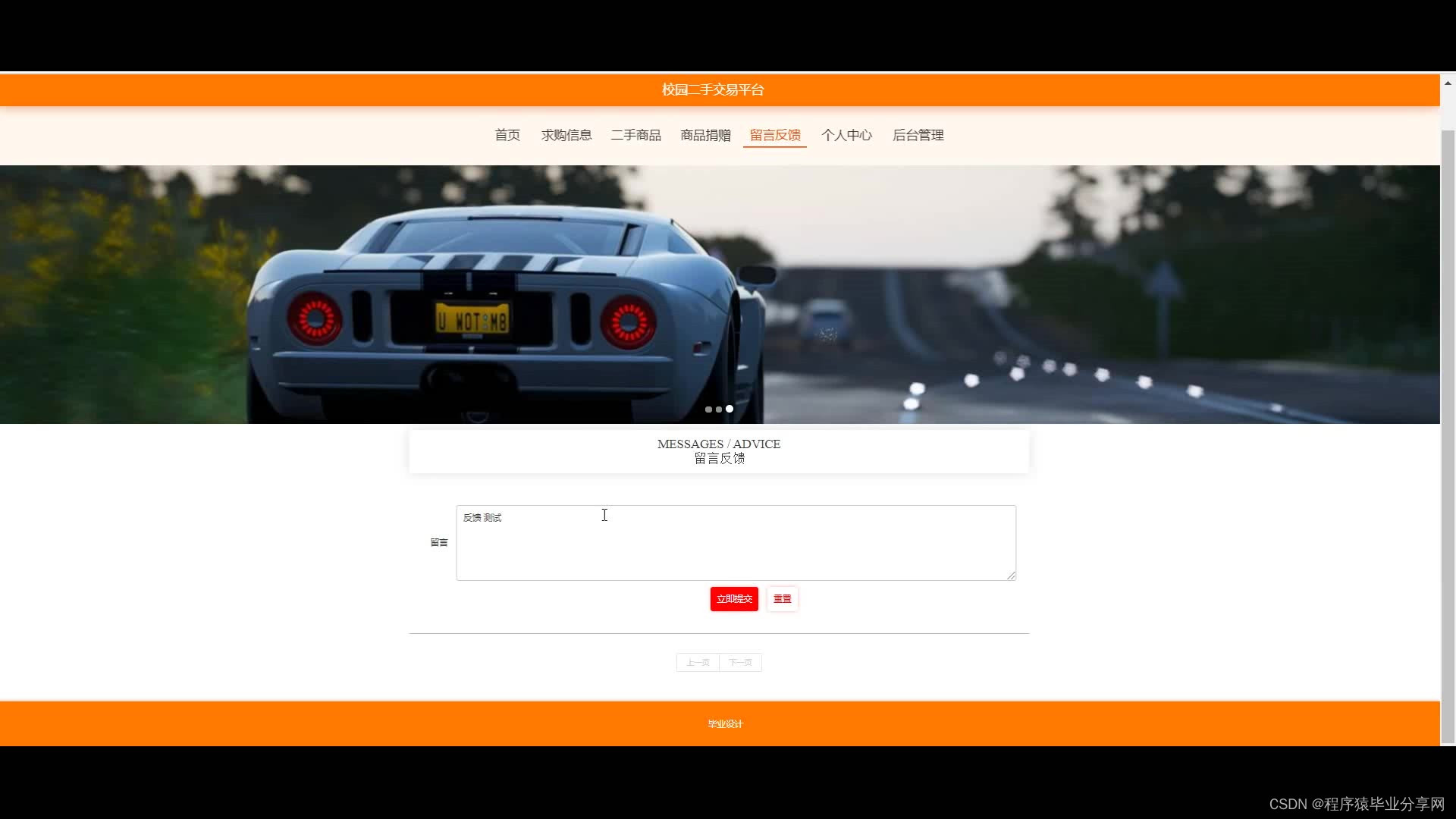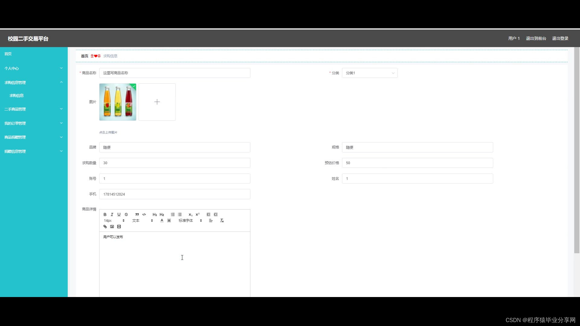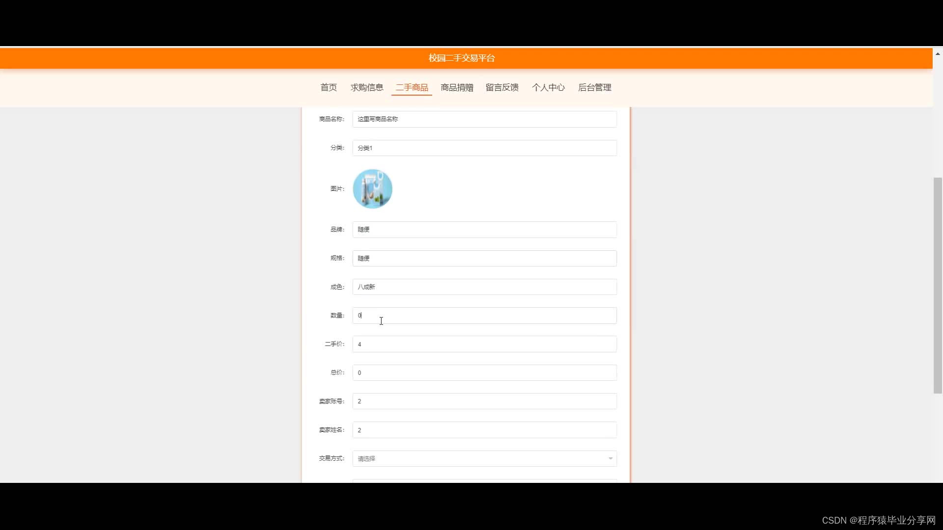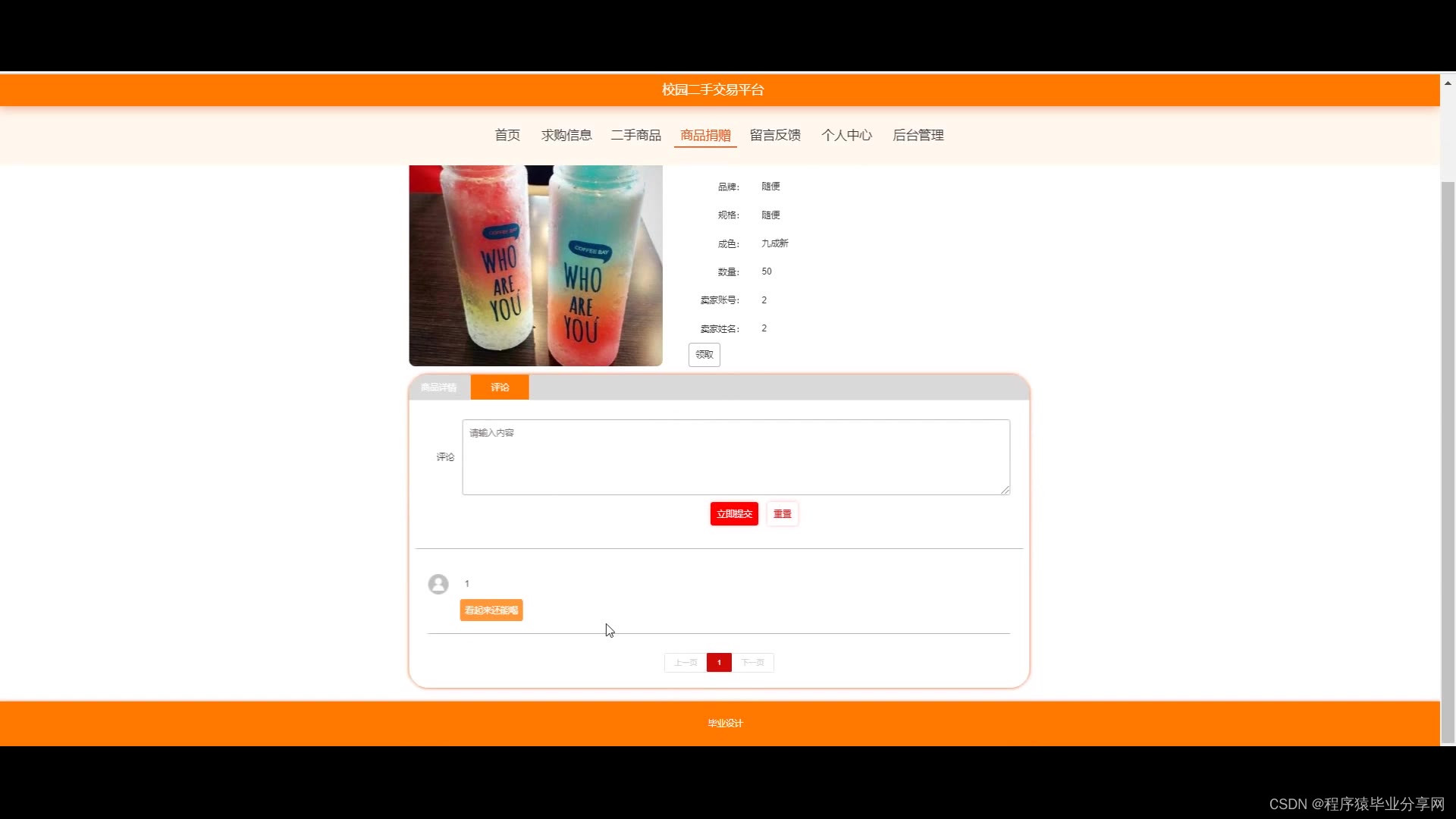 本校园二手交易平台有管理员,卖家和用户三个角色。管理员功能有,个人中心,用户管理,卖家管理,分类管理,求购信息管理,二手商品管理,我的订单管理,商品捐赠管理,捐赠信息管理,留言板管理,系统管理。卖家功能有个人中心,求购信息管理,二手商品管理,我的订单管理,商品捐赠管理,捐赠信息管理。用户功能有个人中心,求购信息,二手商品,我的订单管理,商品捐赠,留言反馈。因而具有一定的实用性。