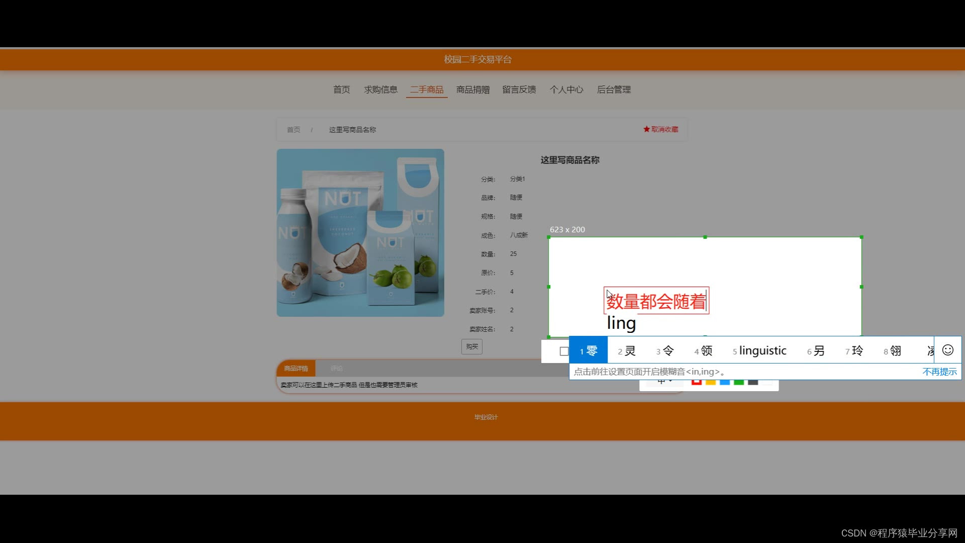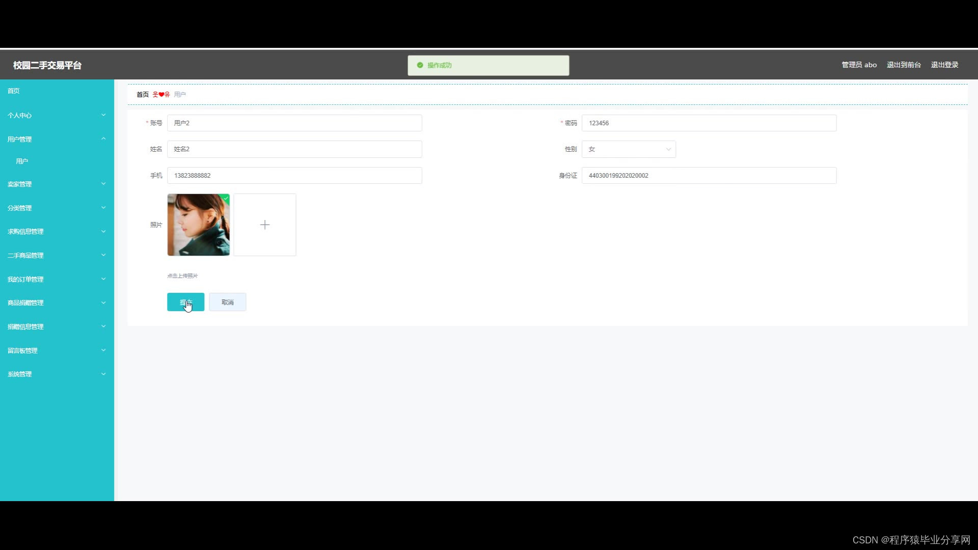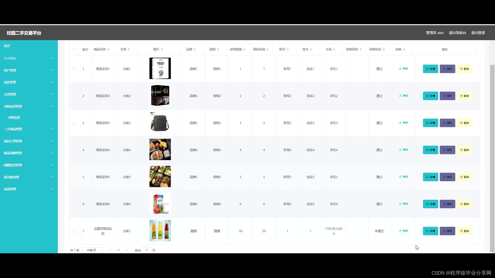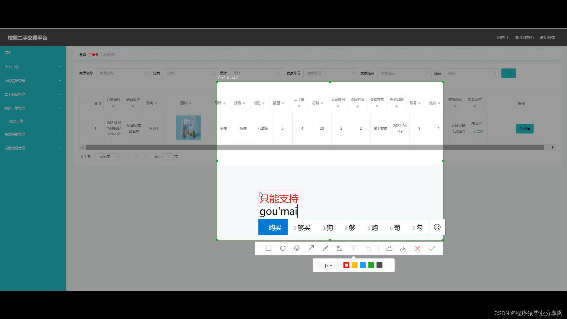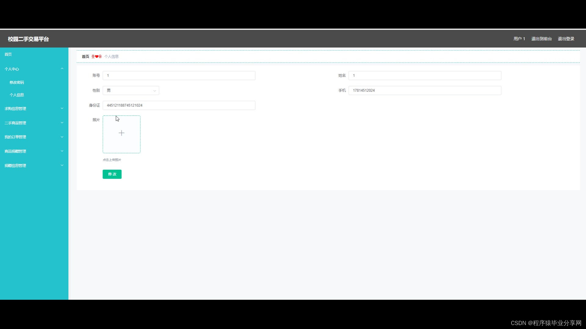 本校园二手交易平台有管理员,卖家和用户三个角色。管理员功能有,个人中心,用户管理,卖家管理,分类管理,求购信息管理,二手商品管理,我的订单管理,商品捐赠管理,捐赠信息管理,留言板管理,系统管理。卖家功能有个人中心,求购信息管理,二手商品管理,我的订单管理,商品捐赠管理,捐赠信息管理。用户功能有个人中心,求购信息,二手商品,我的订单管理,商品捐赠,留言反馈。因而具有一定的实用性。