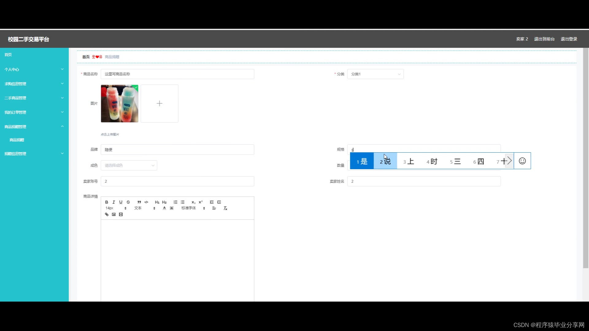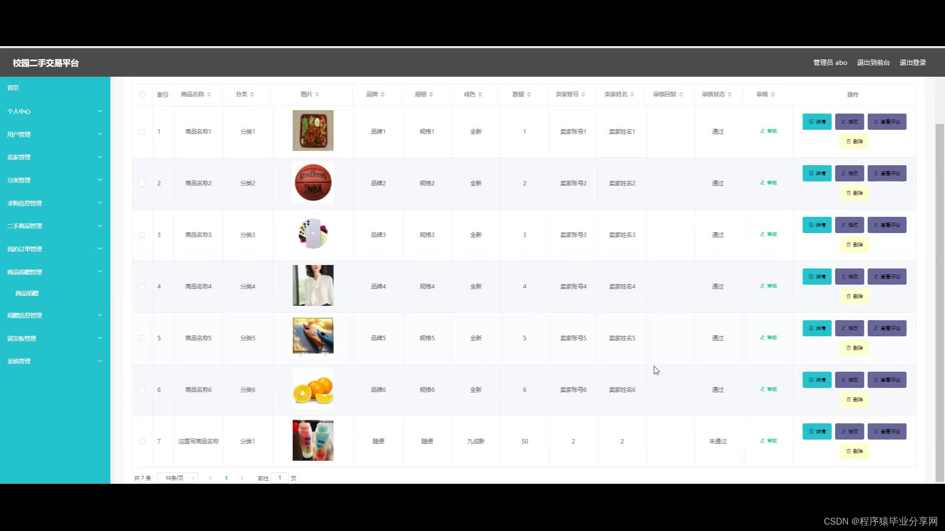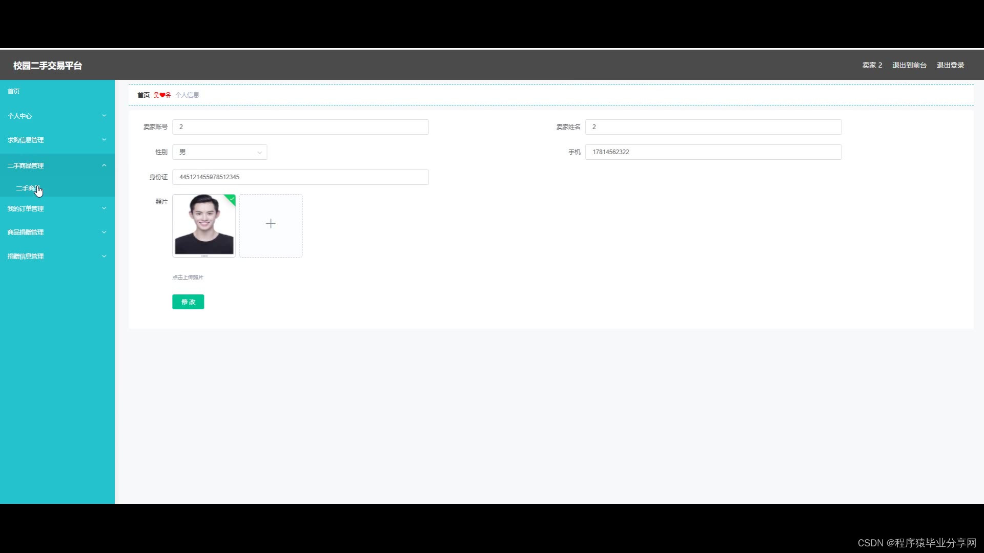 This campus second-hand trading platform has three roles: administrator, seller and user. Administrator functions include personal center, user management, seller management, classification management, purchase information management, second-hand product management, my order management, commodity donation management, donation information management, message board management, and system management. Seller functions include personal center, purchase information management, second-hand product management, my order management, product donation management, and donation information management. User functions include personal center, purchase information, second-hand goods, my order management, goods donation, and message feedback. So it has a certain practicability.