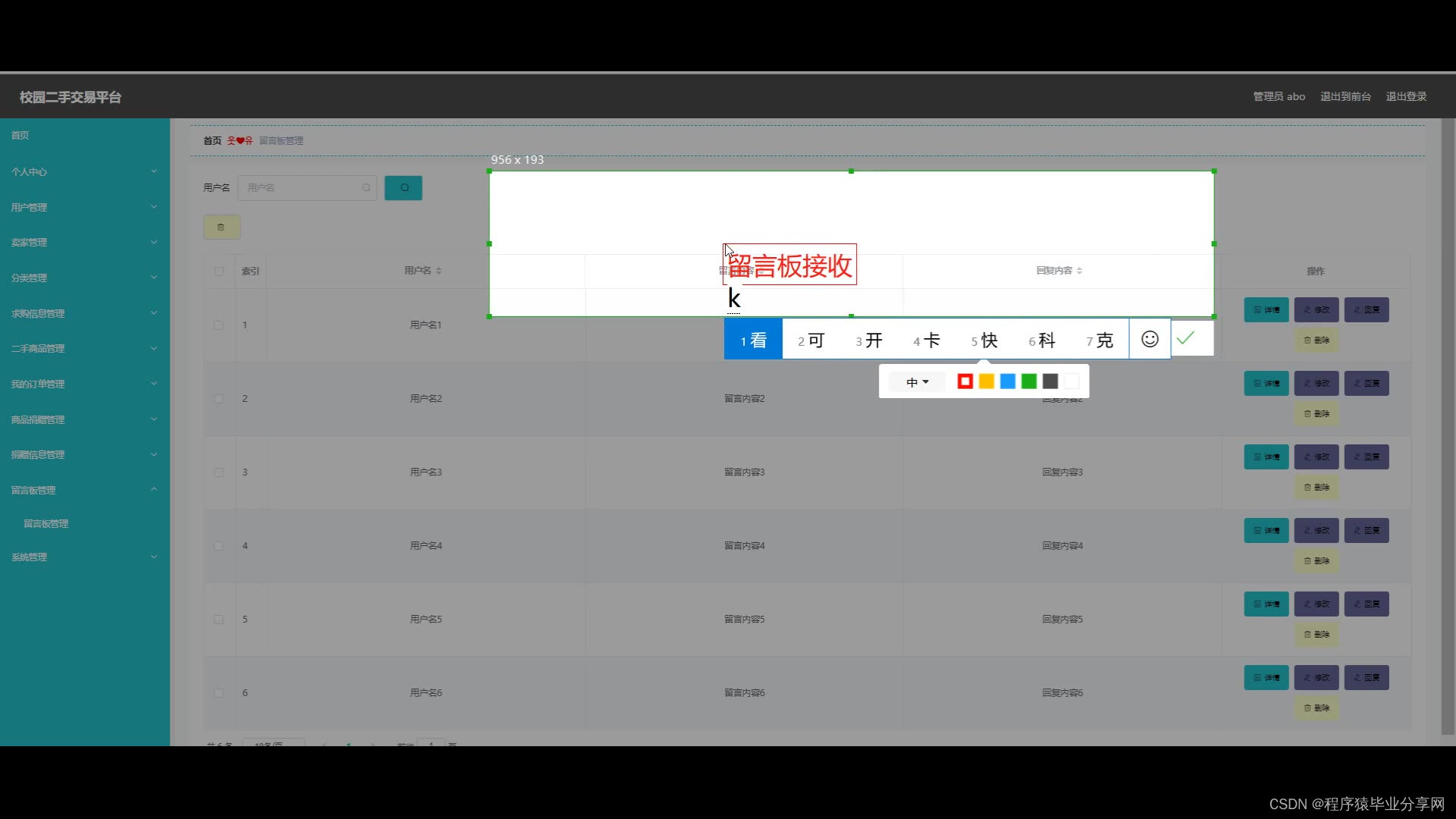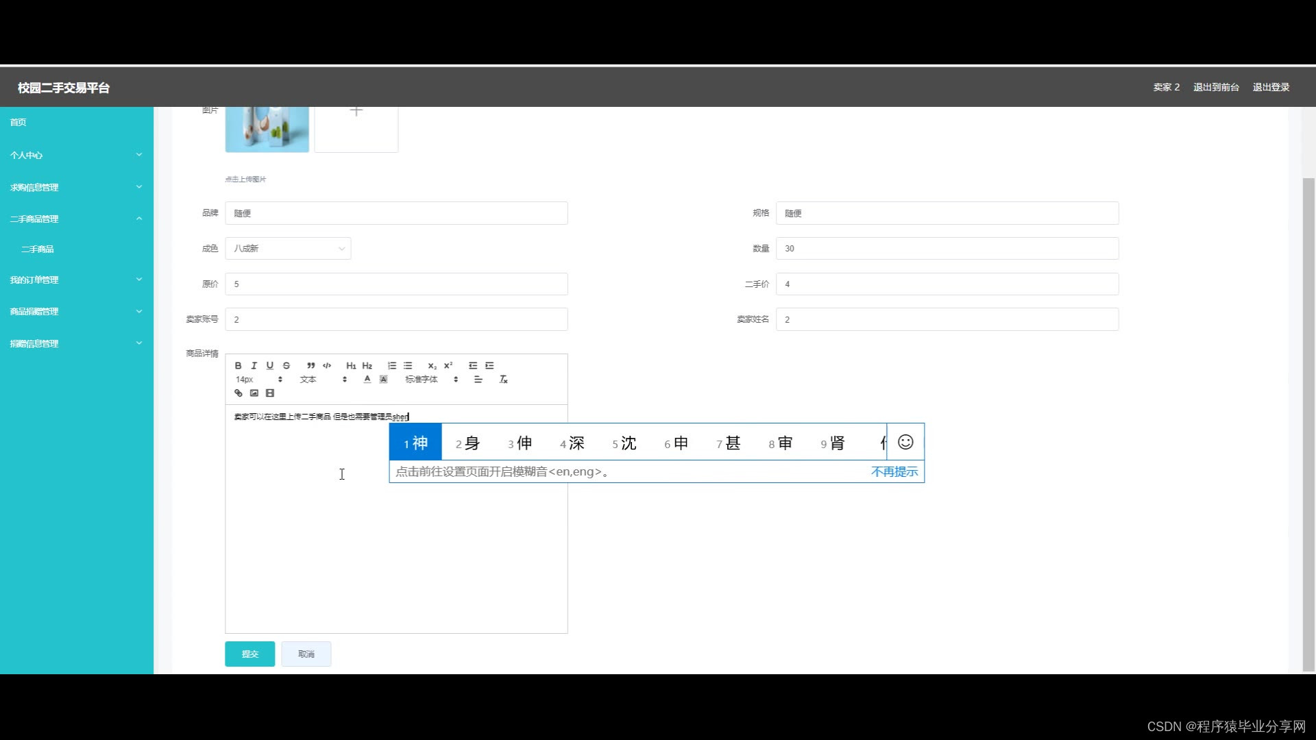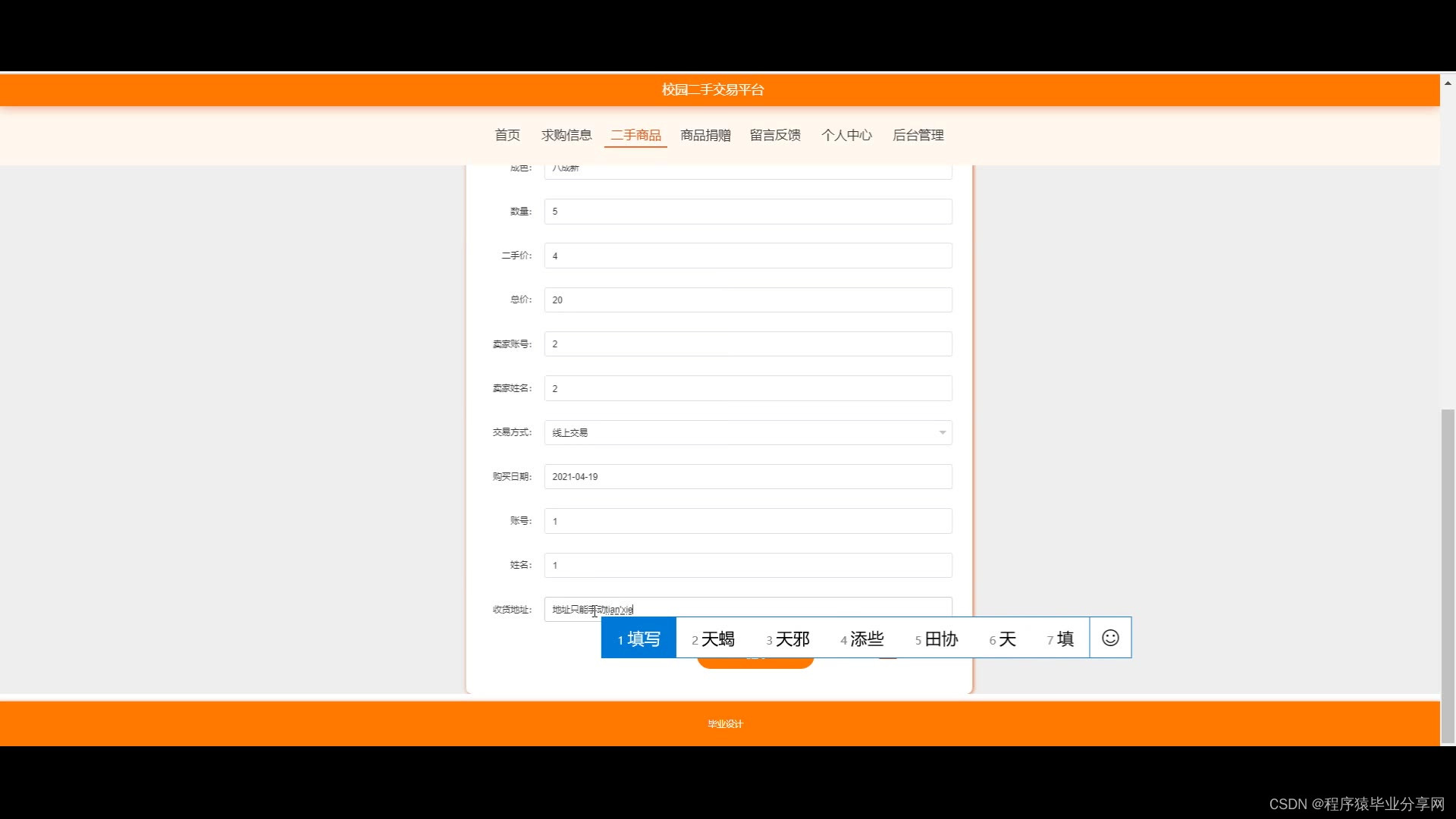 This campus second-hand trading platform has three roles: administrator, seller and user. Administrator functions include personal center, user management, seller management, classification management, purchase information management, second-hand product management, my order management, commodity donation management, donation information management, message board management, and system management. Seller functions include personal center, purchase information management, second-hand product management, my order management, product donation management, and donation information management. User functions include personal center, purchase information, second-hand goods, my order management, goods donation, and message feedback. So it has a certain practicability.