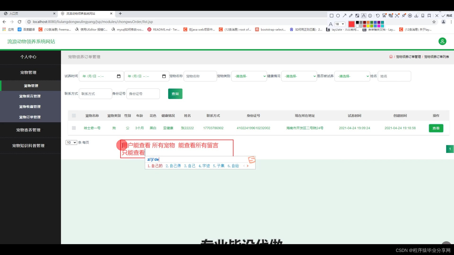 现代经济快节奏发展以及不断完善升级的信息化技术,让传统数据信息的管理升级为软件存储,归纳,集中处理数据信息的管理方式。本流浪动物领养系统网站就是在这样的大环境下诞生,其可以帮助管理者在短时间内处理完毕庞大的数据信息,使用这种软件工具可以帮助管理人员提高事务处理效率,达到事半功倍的效果。此流浪动物领养系统网站利用当下成熟完善的SSM框架,使用跨平台的可开发大型商业网站的Java语言,以及最受欢迎的RDBMS应用软件之一的Mysql数据库进行程序开发。实现了动物基础数据的管理,志愿者管理,用户管理,轮播图管理,宠物留言管理,宠物收藏管理等功能。流浪动物领养系统网站的开发根据操作人员需要设计的界面简洁美观,在功能模块布局上跟同类型网站保持一致,程序在实现基本要求功能时,也为数据信息面临的安全问题提供了一些实用的解决方案。可以说该程序在帮助管理者高效率地处理工作事务的同时,也实现了数据信息的整体化,规范化与自动化。