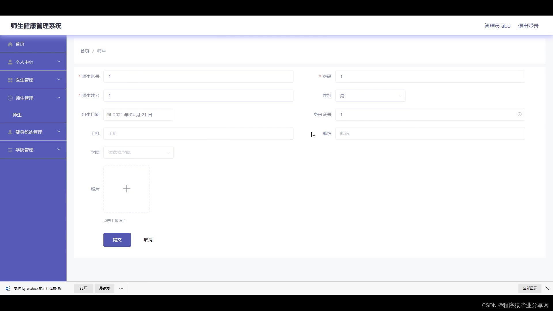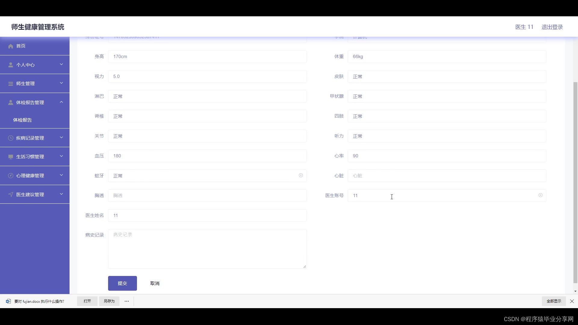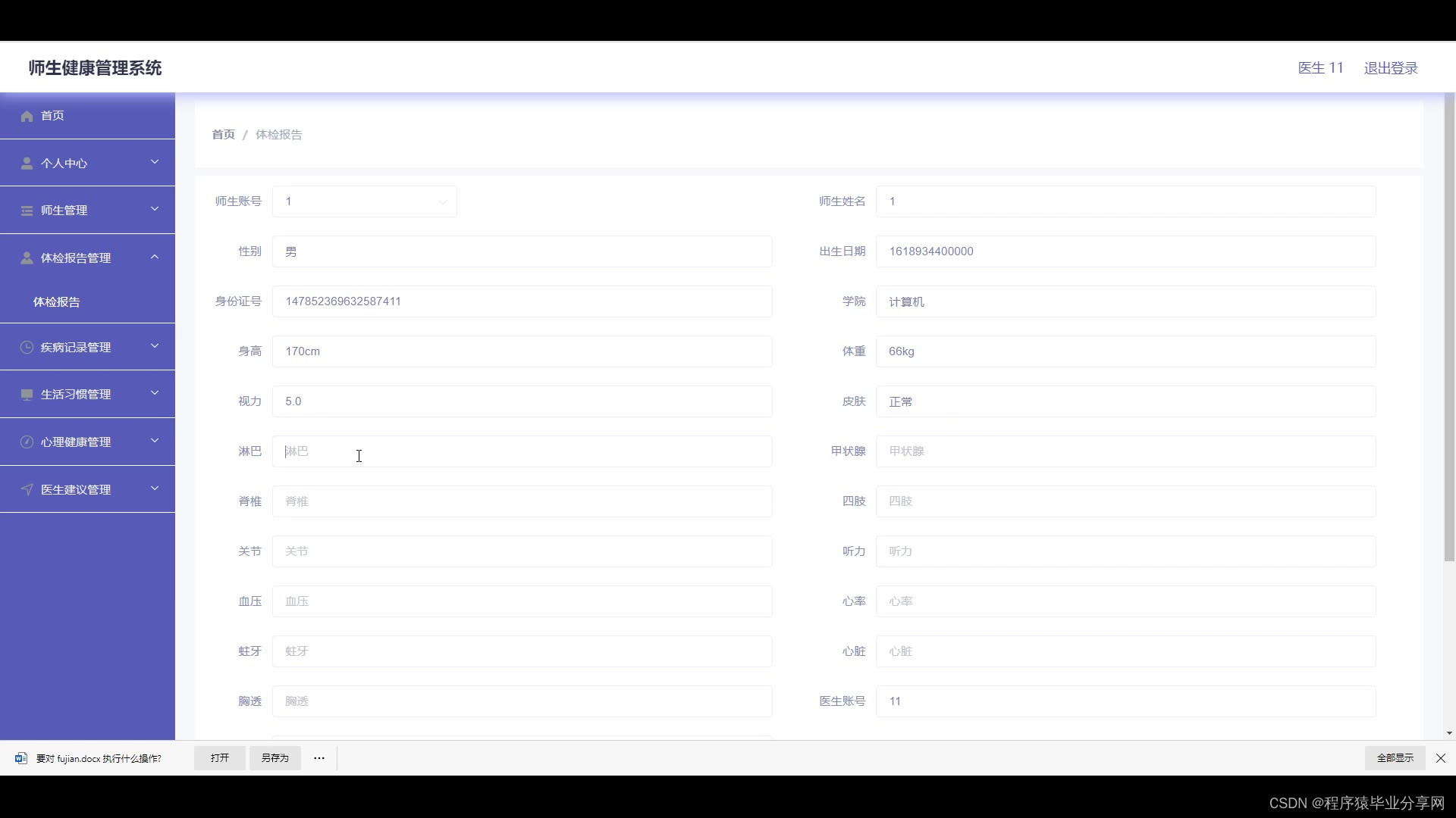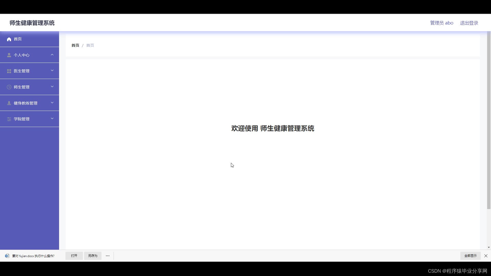 研究的背景:21世纪,早已进入互联网信息快速发展的时代,互联网的普及给人们带来了许多便利。像有些高校就有自己的师生健康管理系统,但是对我们楚师院来说,通过调查发现,由于我们的师生在健康这方面不是很重视,所以在师生健康管理系统这一发面的发展不是很完善,如果我们能有这么一个健康管理系统,会给我们的师生带来很大的方便,可以线上了解师生的健康情况,为用户提供了服务。