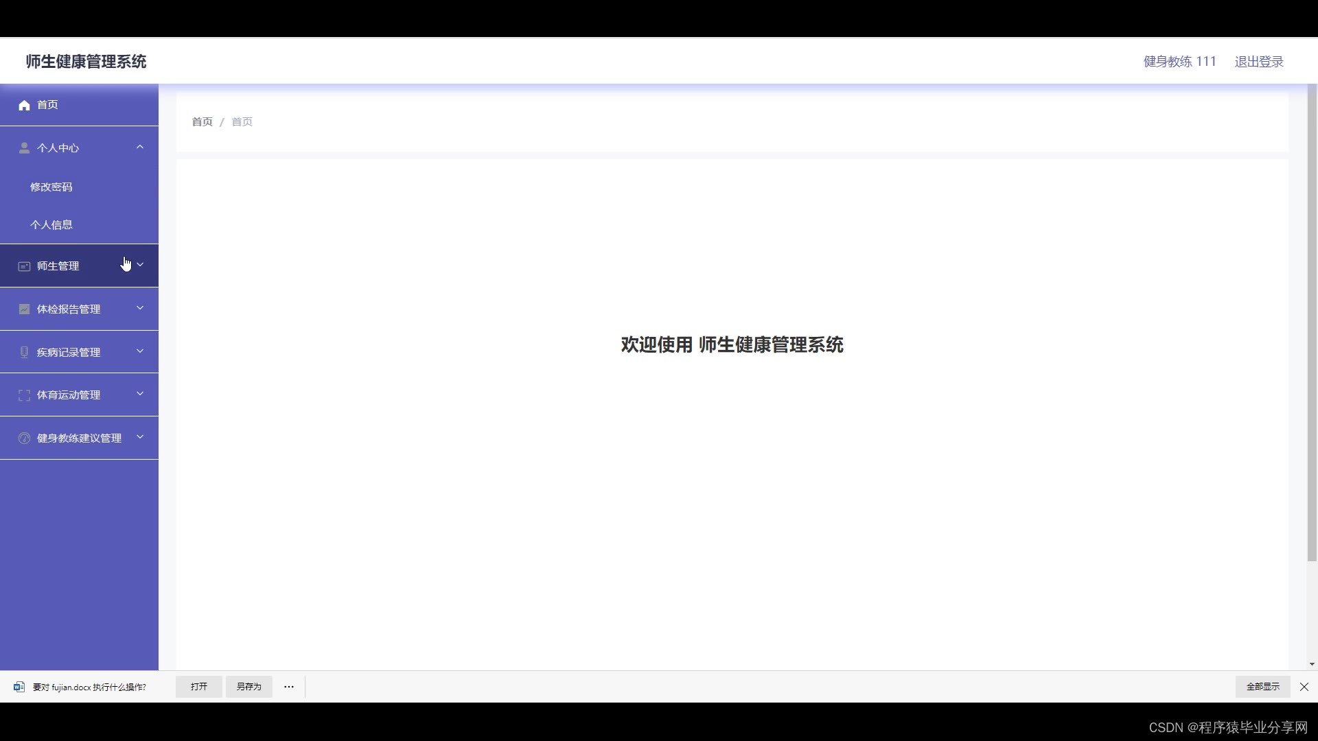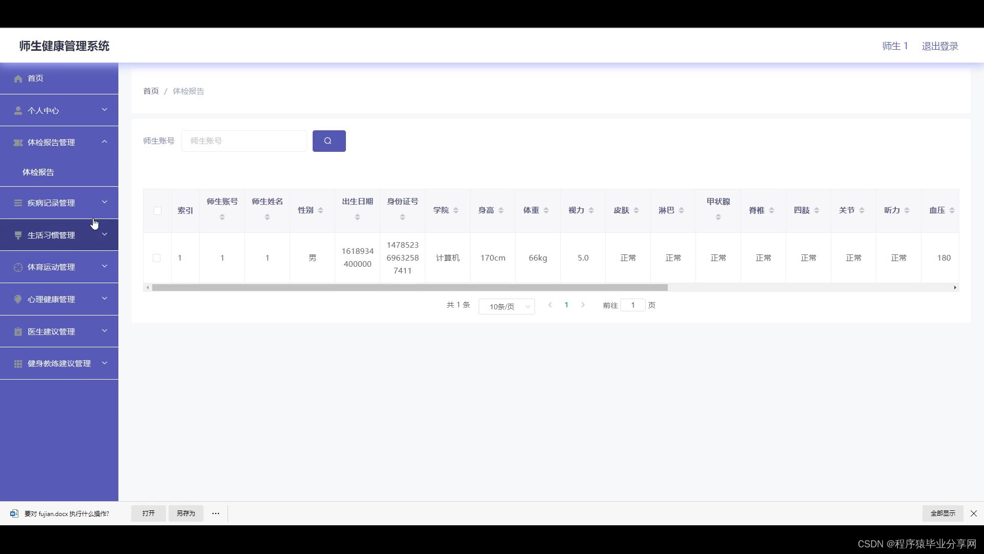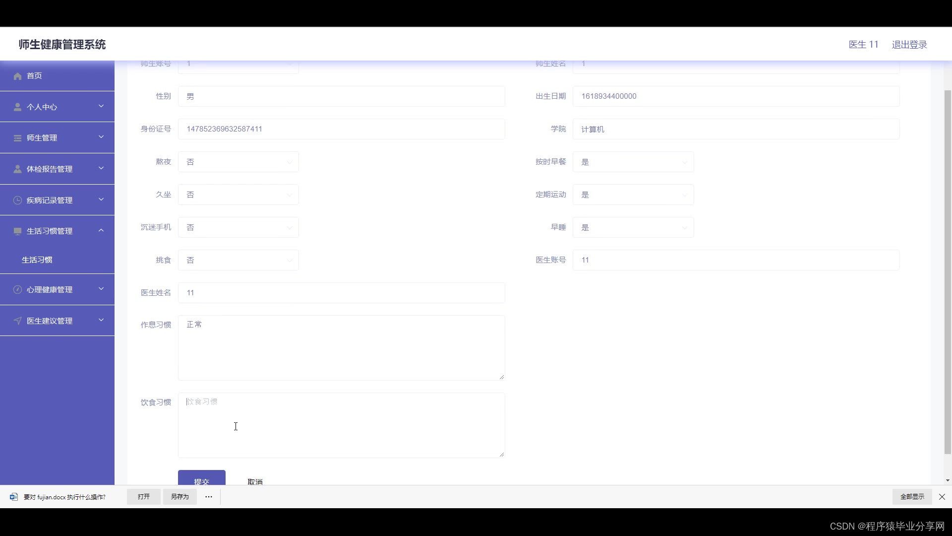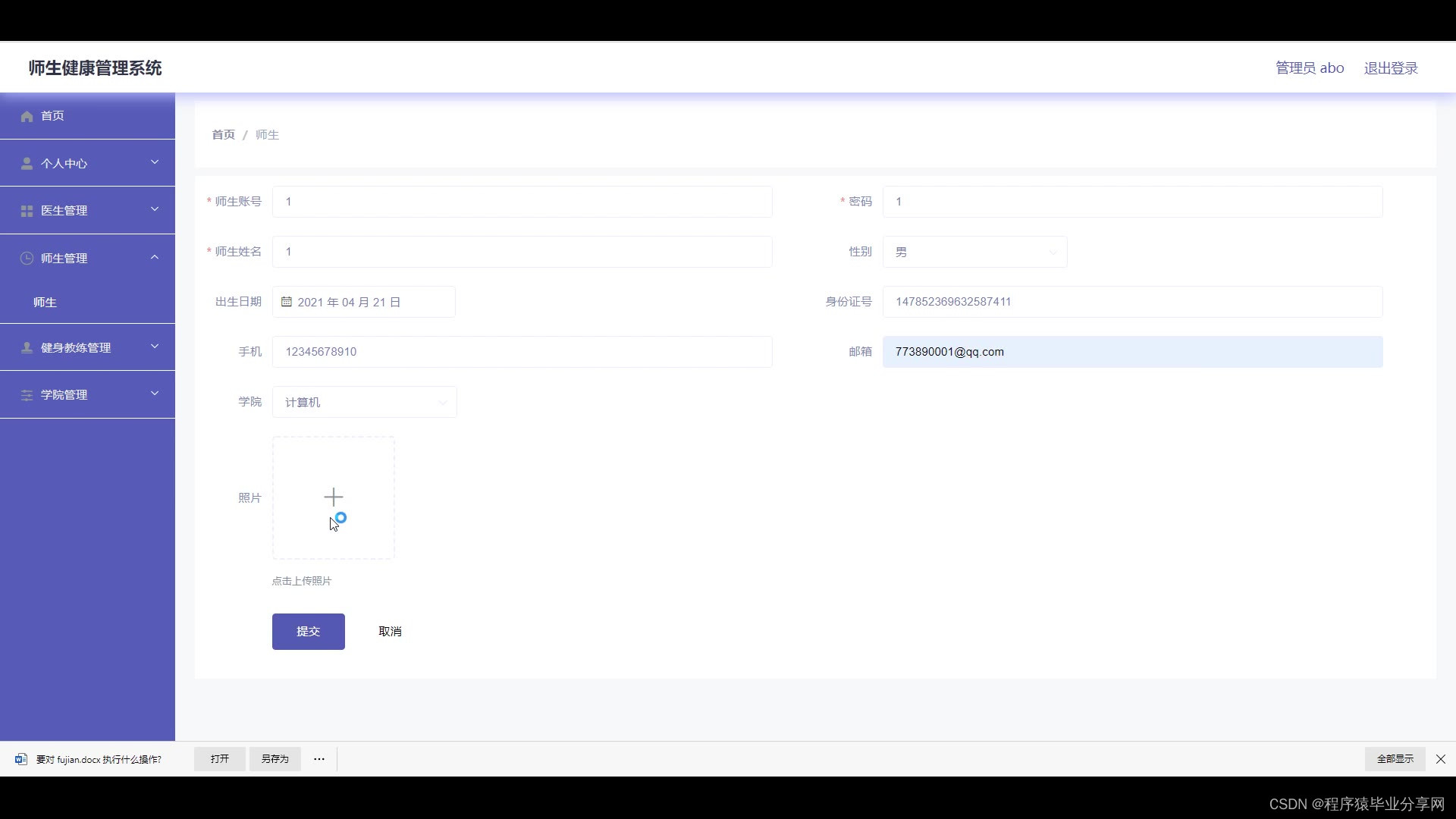 研究的背景:21世纪,早已进入互联网信息快速发展的时代,互联网的普及给人们带来了许多便利。像有些高校就有自己的师生健康管理系统,但是对我们楚师院来说,通过调查发现,由于我们的师生在健康这方面不是很重视,所以在师生健康管理系统这一发面的发展不是很完善,如果我们能有这么一个健康管理系统,会给我们的师生带来很大的方便,可以线上了解师生的健康情况,为用户提供了服务。