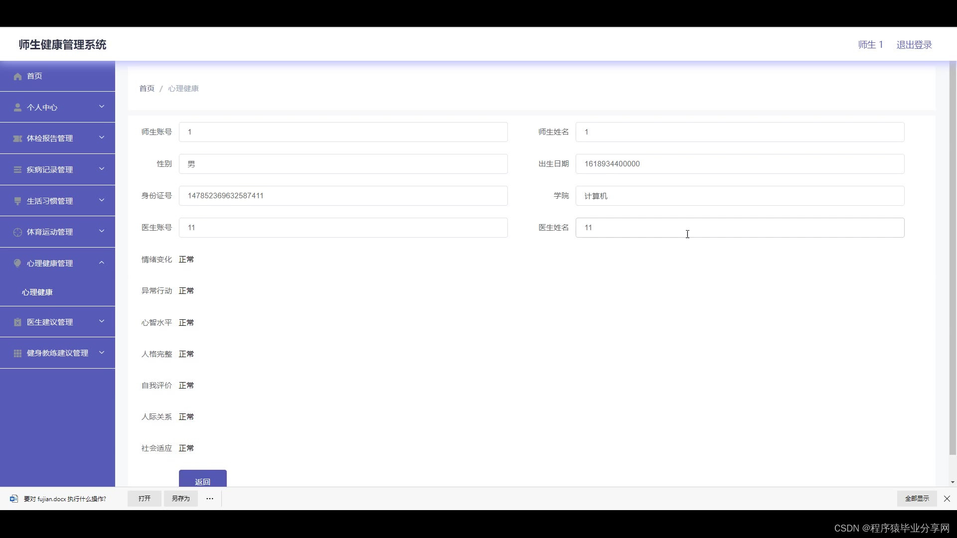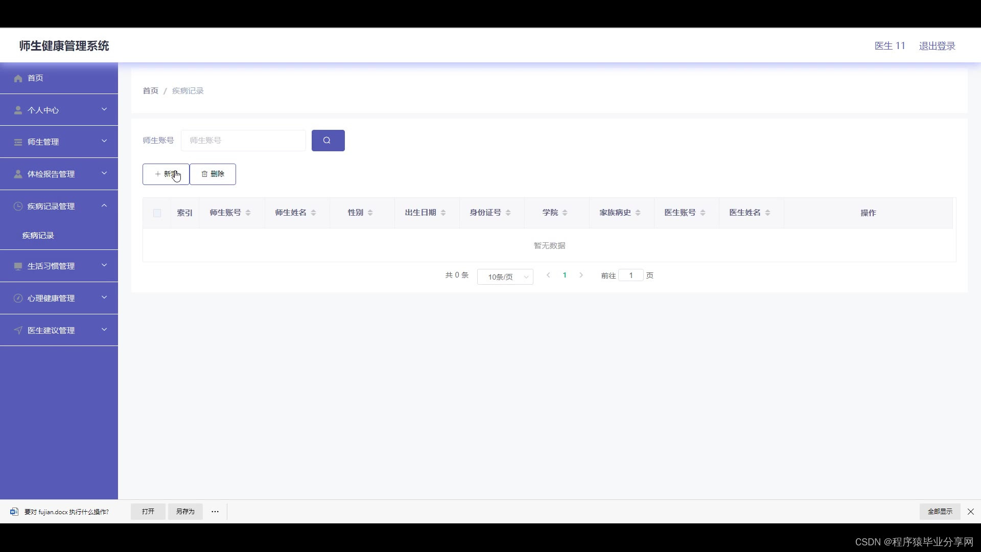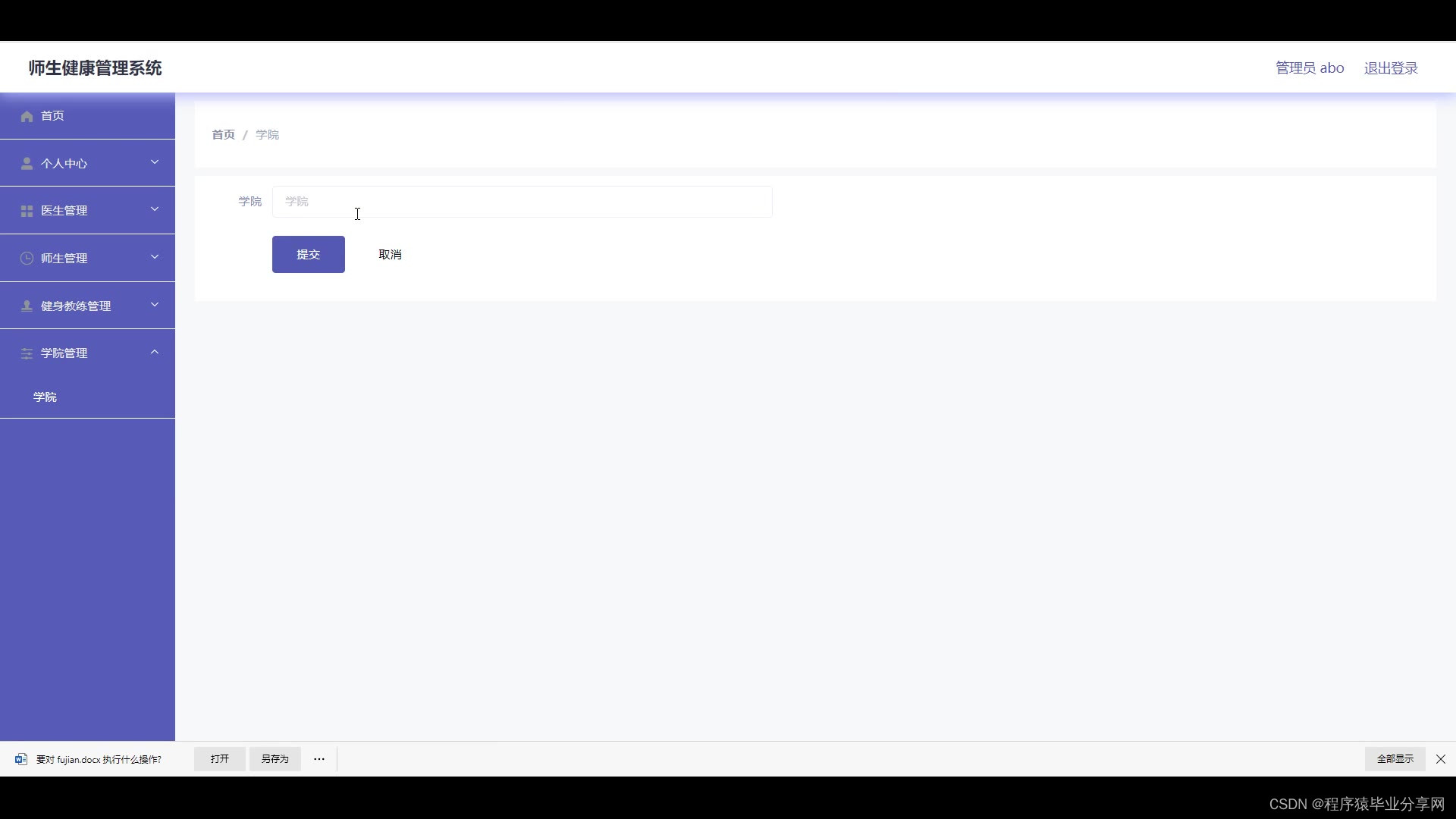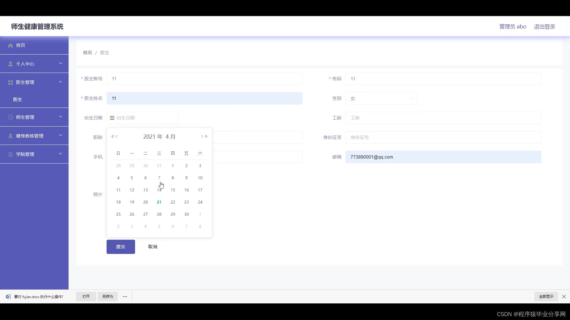 研究的背景:21世纪,早已进入互联网信息快速发展的时代,互联网的普及给人们带来了许多便利。像有些高校就有自己的师生健康管理系统,但是对我们楚师院来说,通过调查发现,由于我们的师生在健康这方面不是很重视,所以在师生健康管理系统这一发面的发展不是很完善,如果我们能有这么一个健康管理系统,会给我们的师生带来很大的方便,可以线上了解师生的健康情况,为用户提供了服务。
