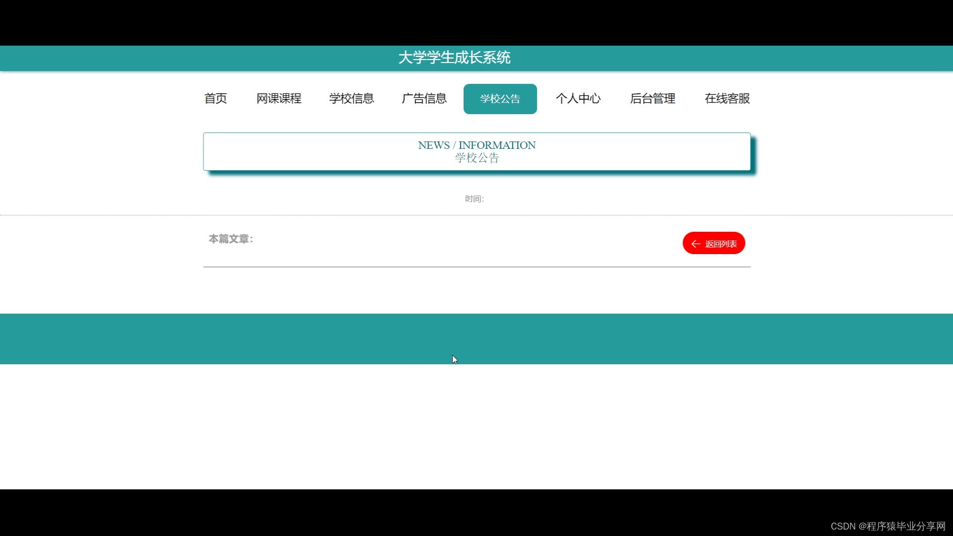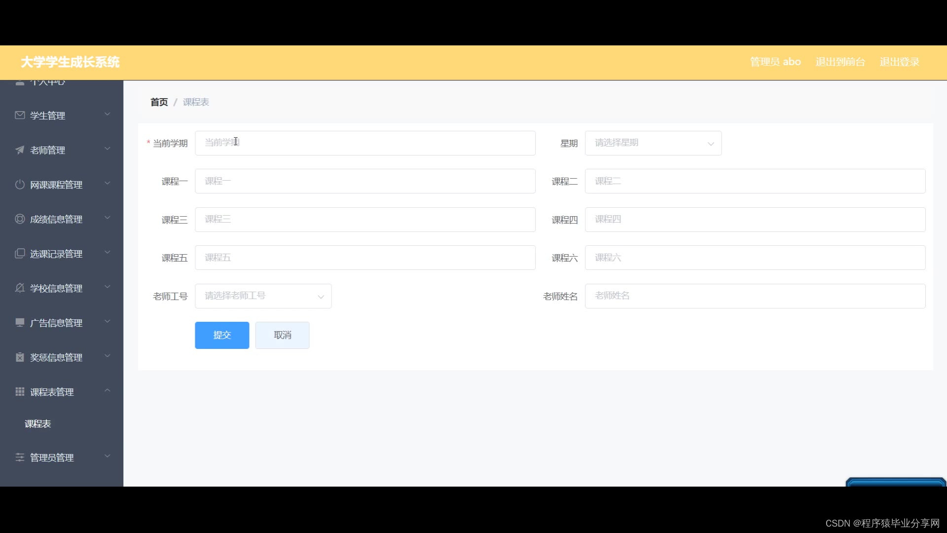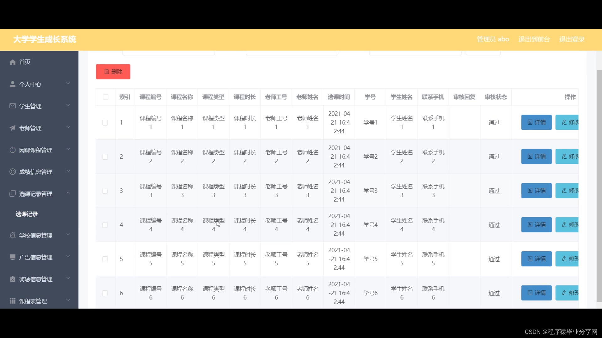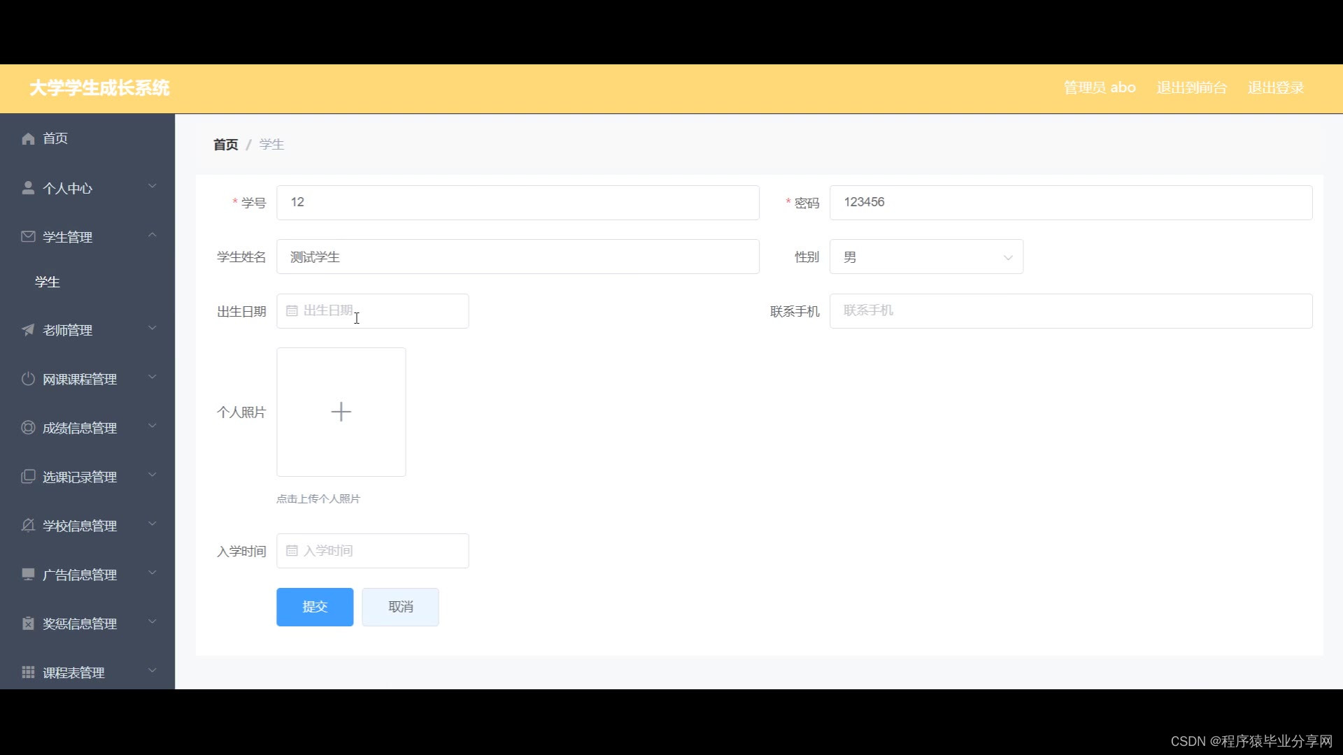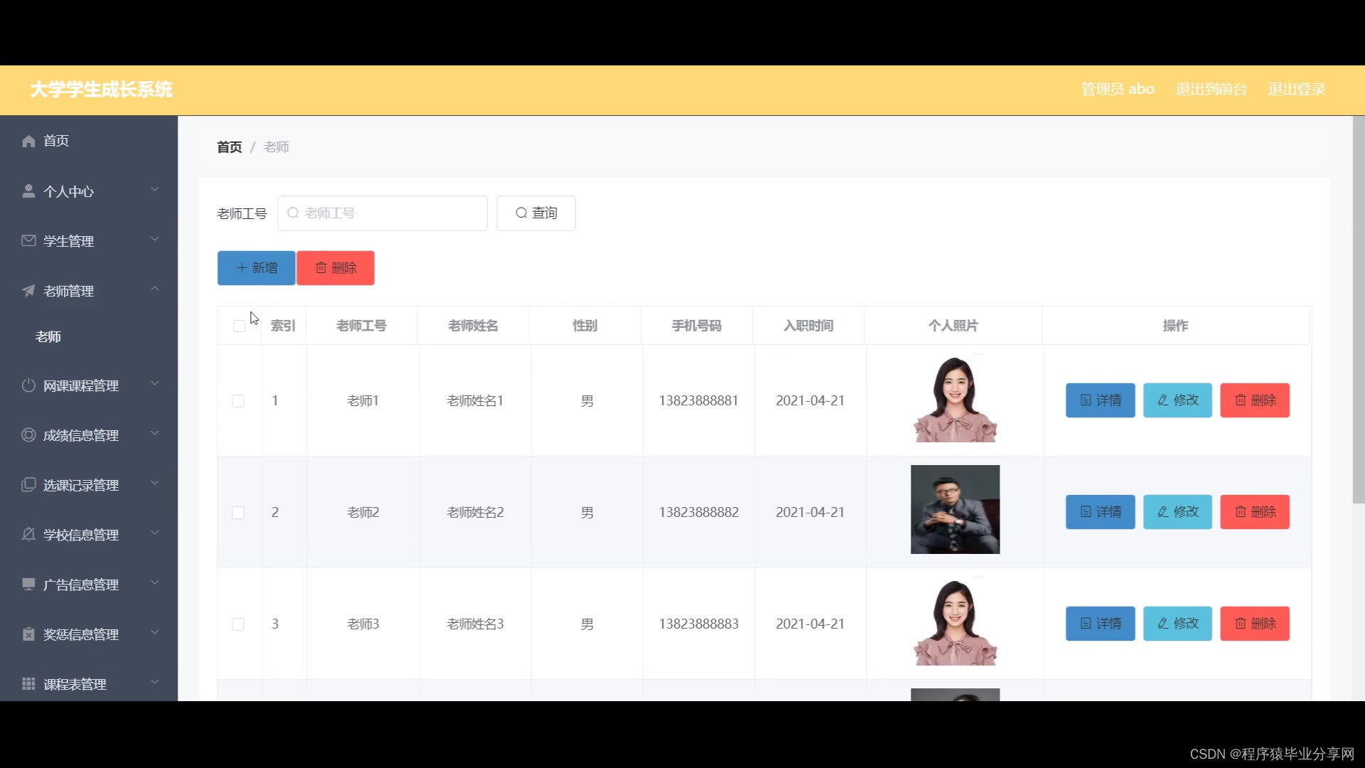 为满足阜阳师范大学学生成长管理需求,开发了学生成长系统。该系统采用Java技术,基于SSM框架、B/S结构开发,使用MYSQL数据库存储数据。系统界面布局合理、操作简单,实现了管理员、老师和学生三大功能模块,保证了稳定性与安全性。