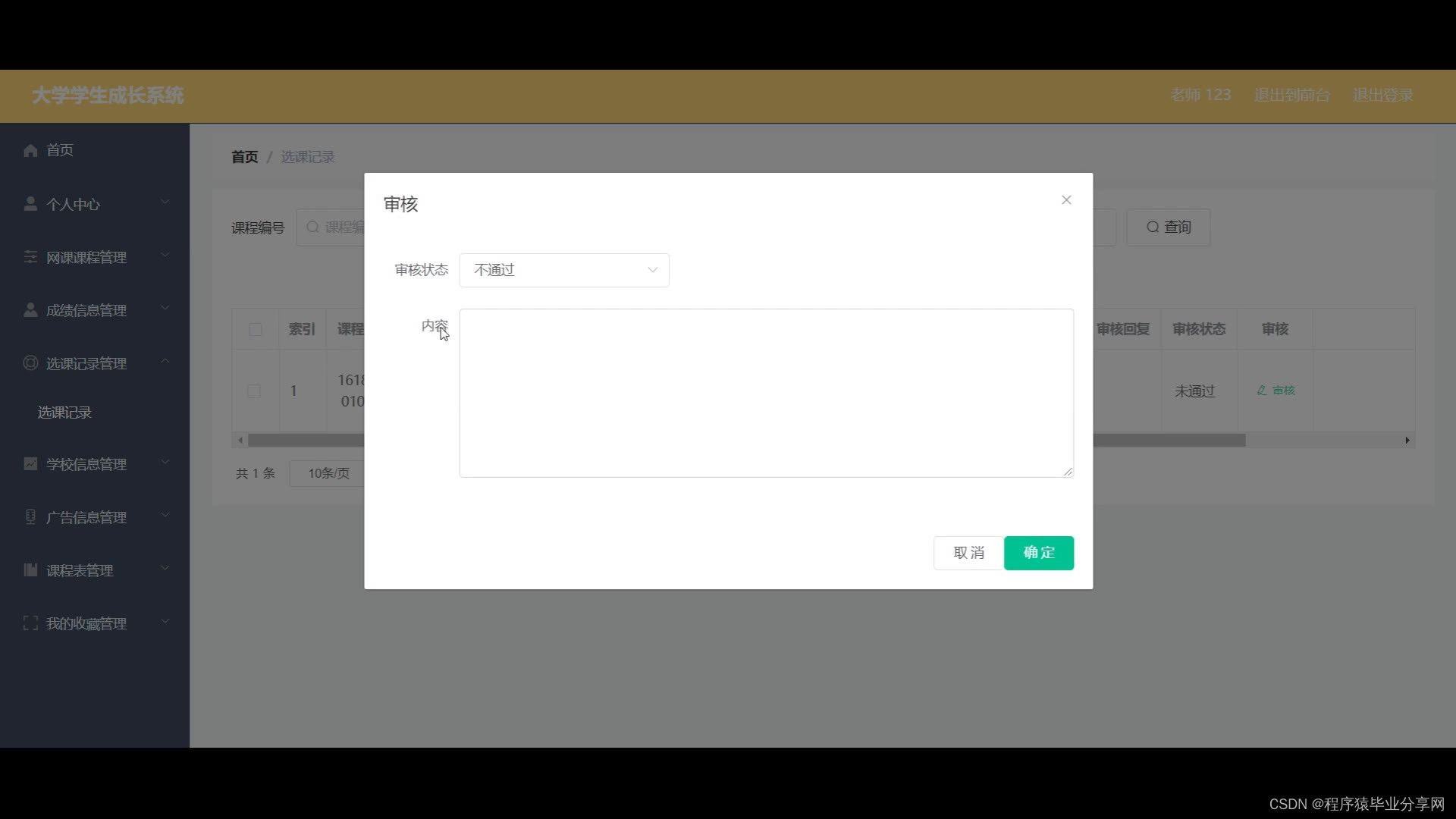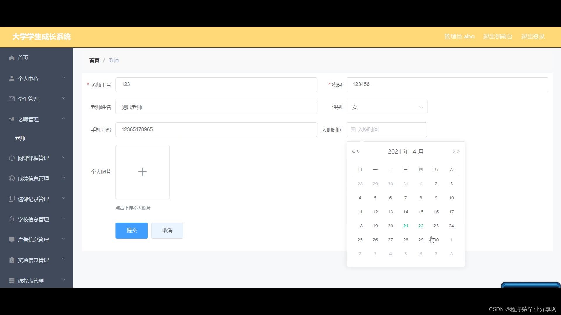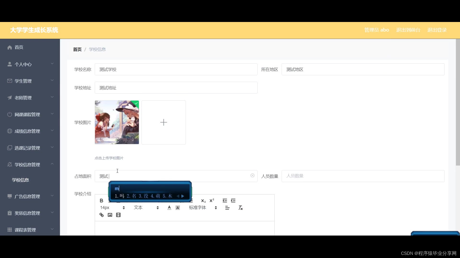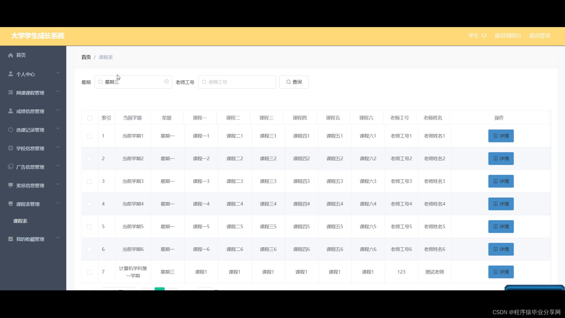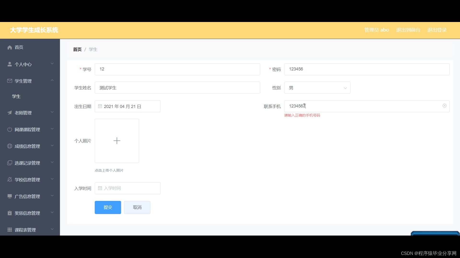 为满足阜阳师范大学学生成长管理需求,开发了学生成长系统。该系统采用Java技术,基于SSM框架、B/S结构开发,使用MYSQL数据库存储数据。系统界面布局合理、操作简单,实现了管理员、老师和学生三大功能模块,保证了稳定性与安全性。