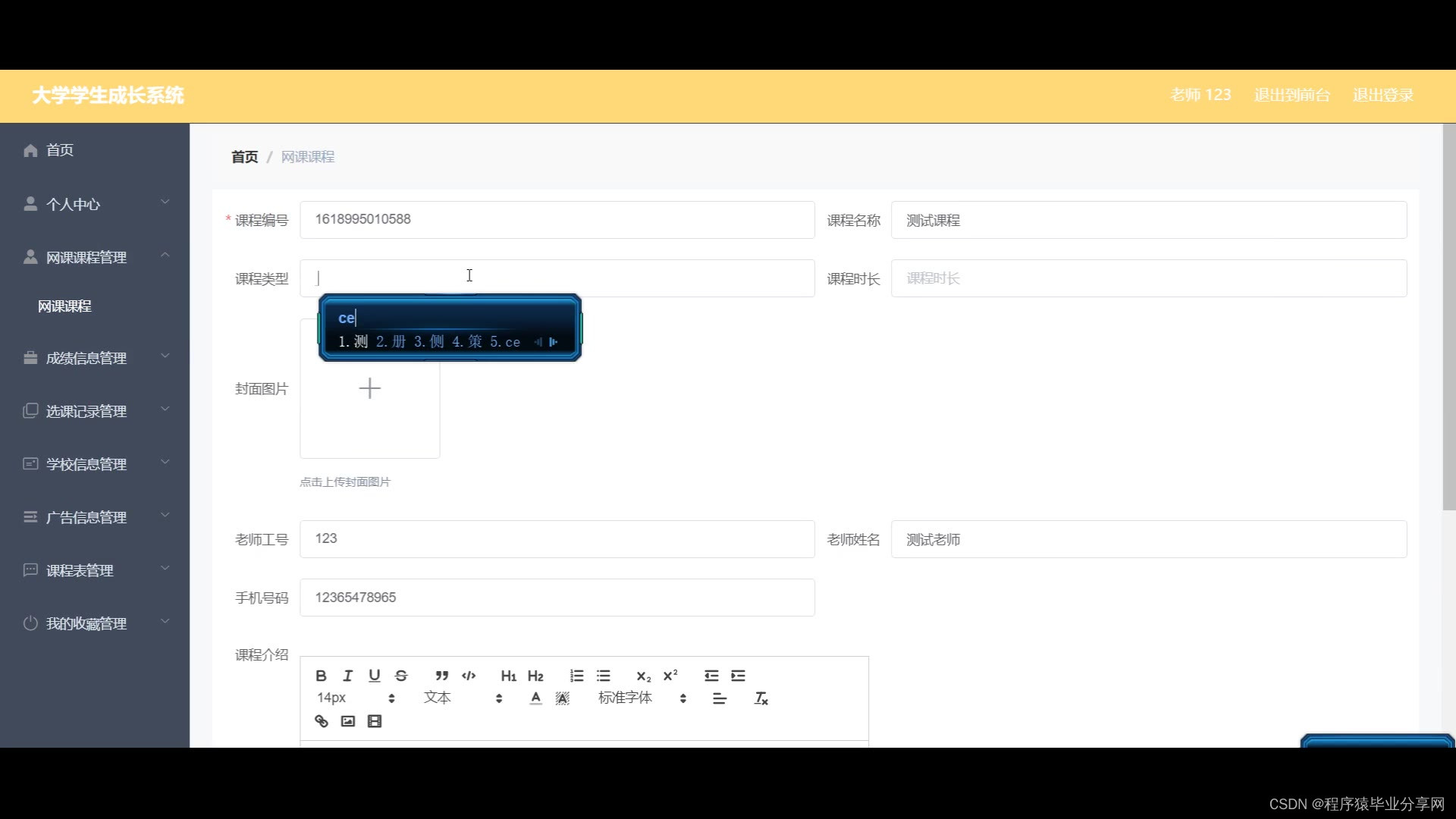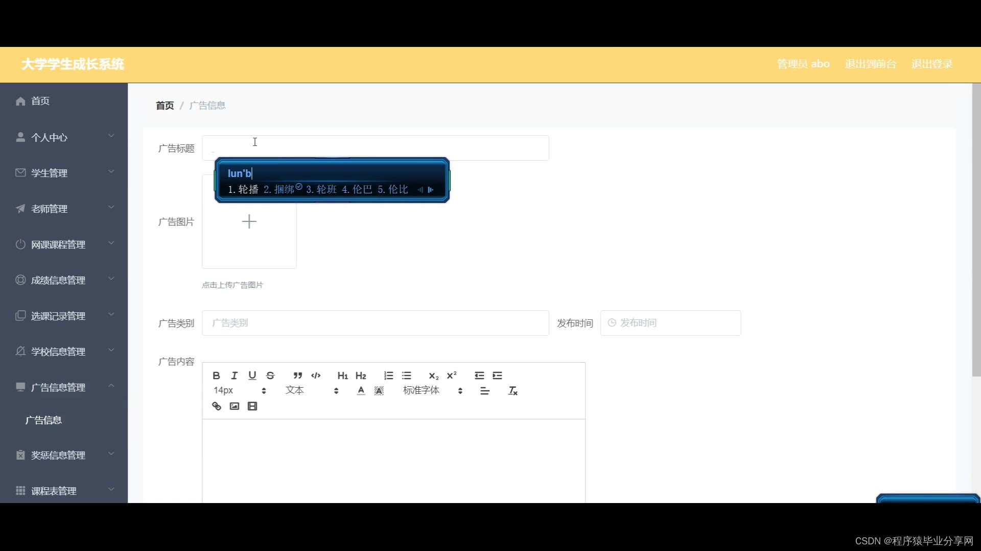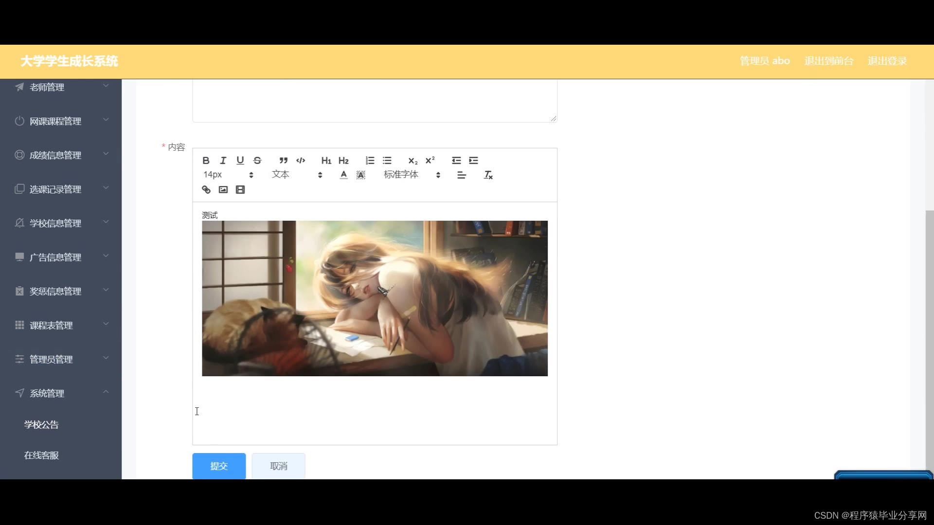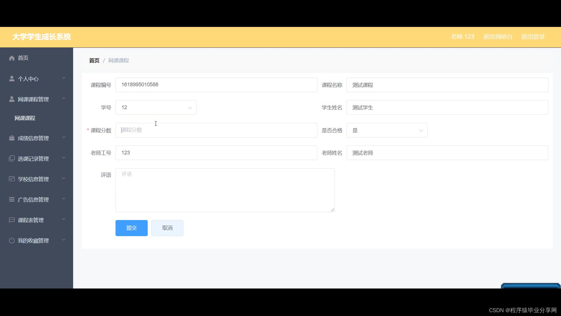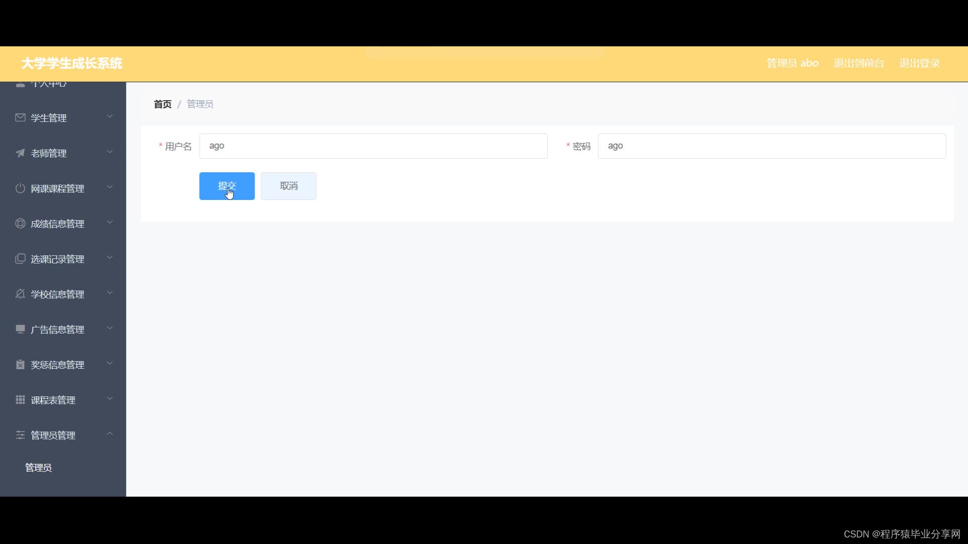 为满足阜阳师范大学学生成长管理需求,开发了学生成长系统。该系统采用Java技术,基于SSM框架、B/S结构开发,使用MYSQL数据库存储数据。系统界面布局合理、操作简单,实现了管理员、老师和学生三大功能模块,保证了稳定性与安全性。