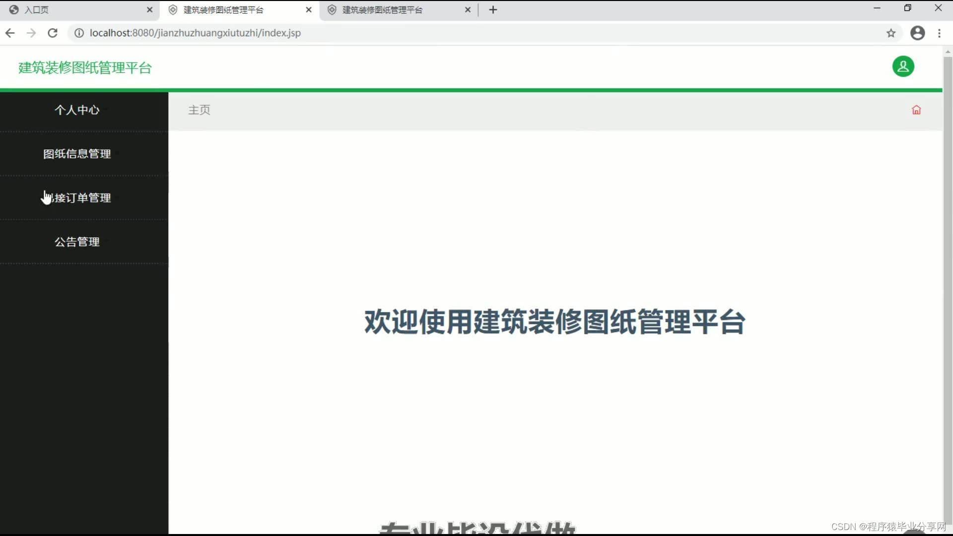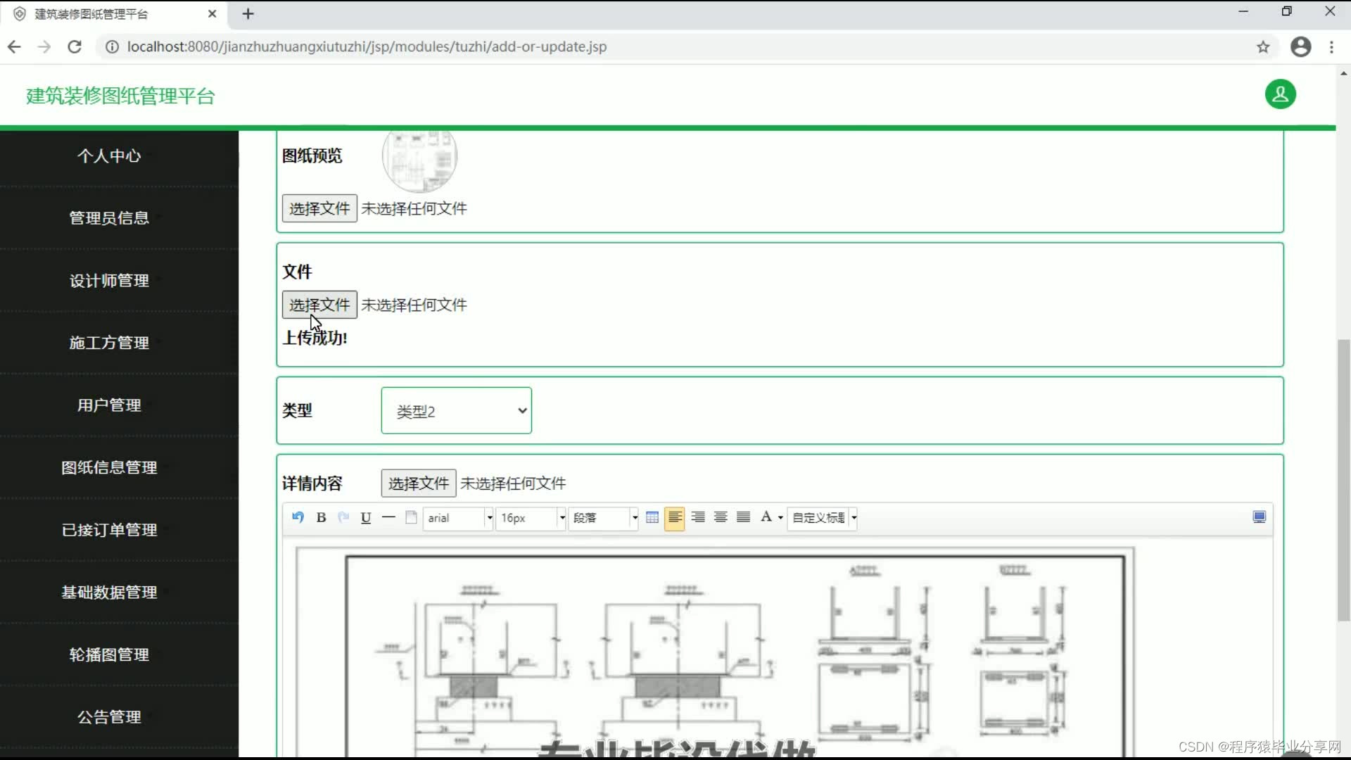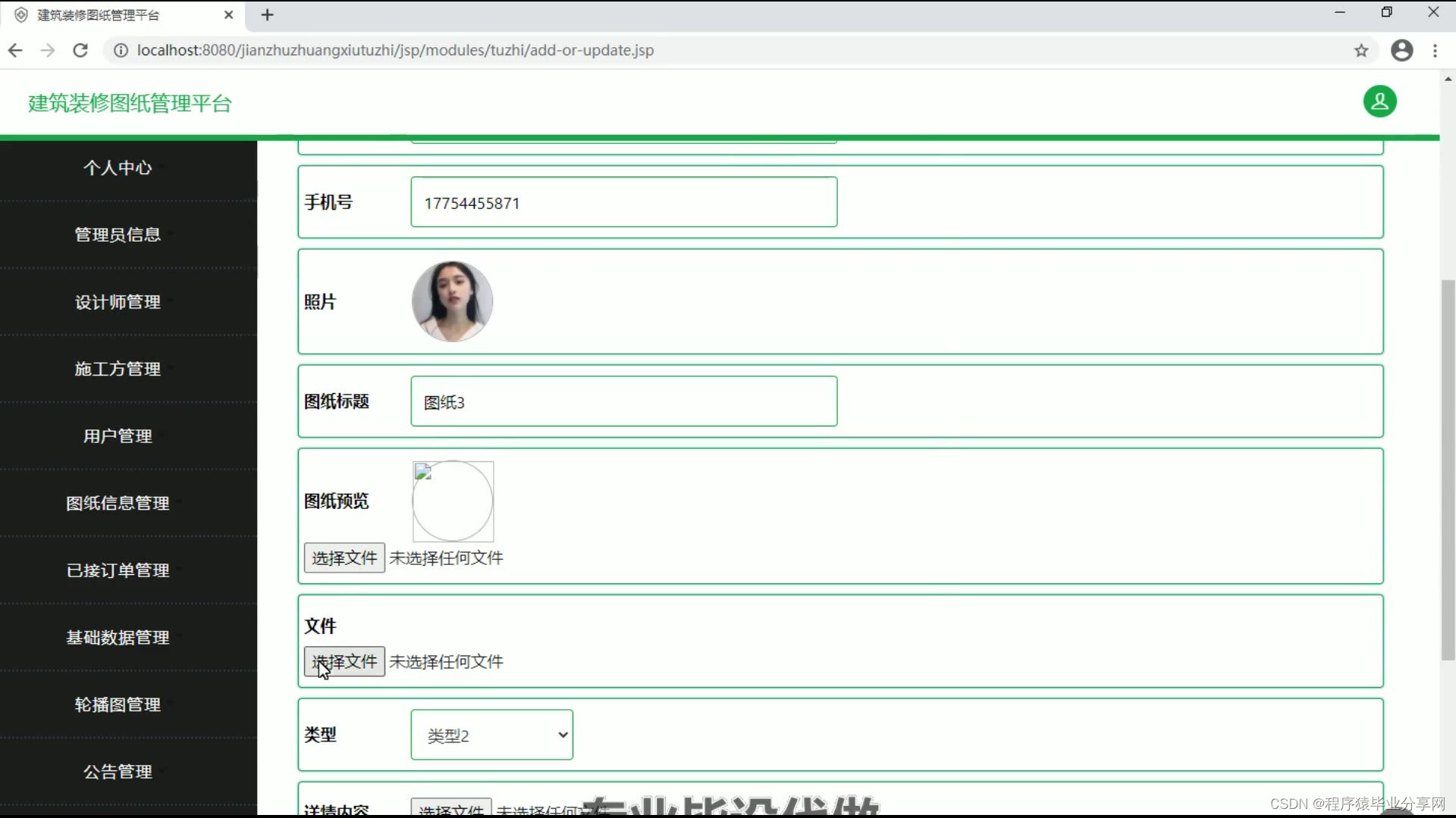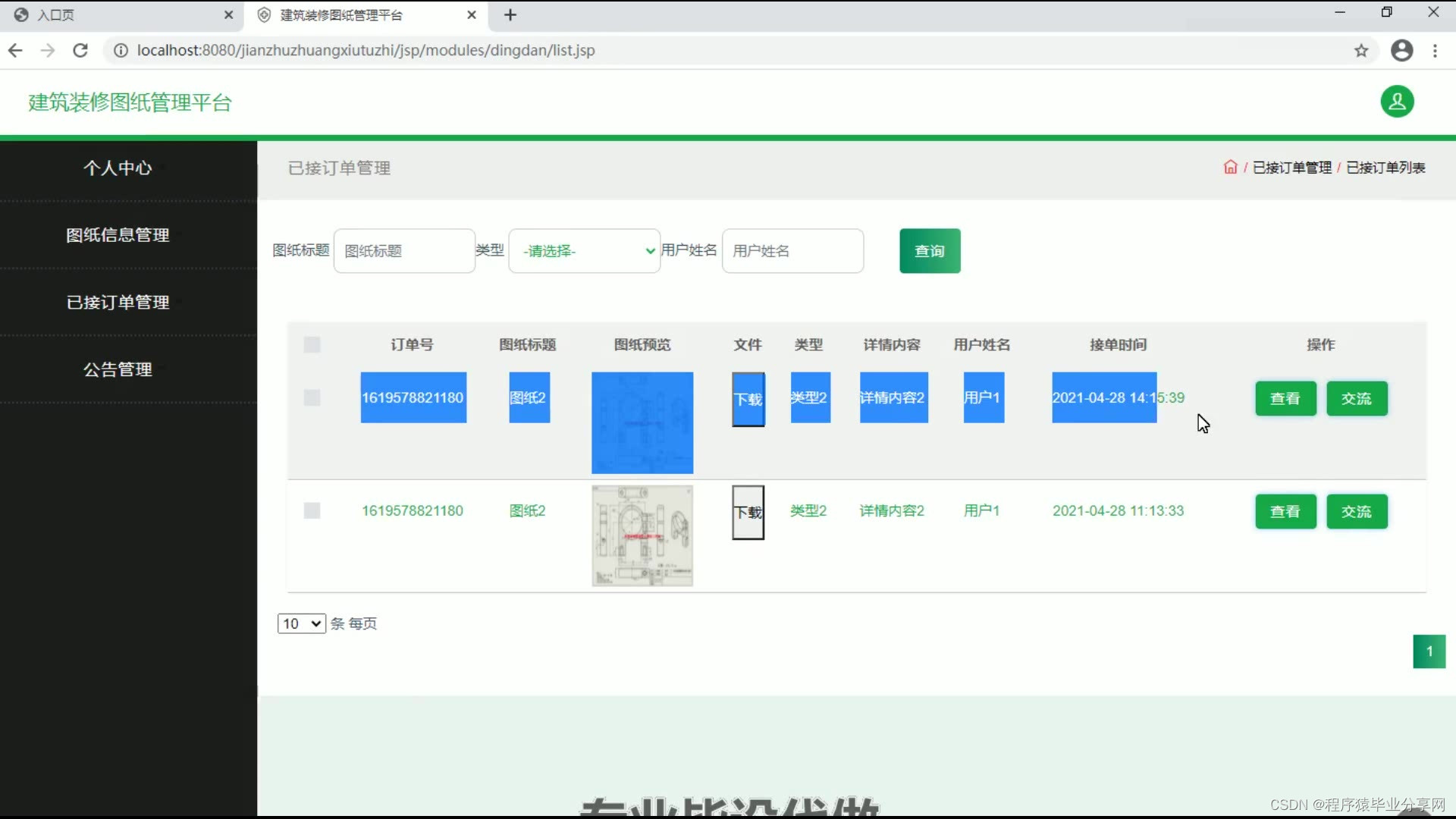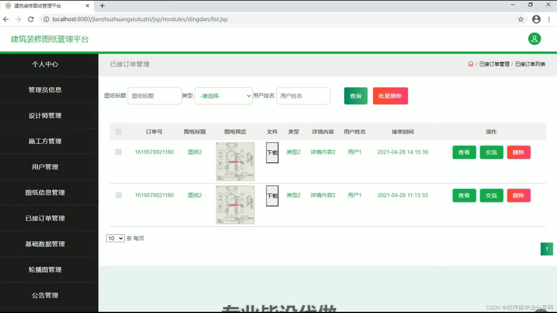 本建筑装修图纸管理平台管理员,用户,设计师,施工方。管理员功能有个人中心,管理员管理,设计师管理,施工方管理,用户管理,图纸信息管理,已接订单管理,基础数据管理,轮播图管理,公告管理。用户可以看到图纸,然后预定,施工方审核。因而具有一定的实用性。