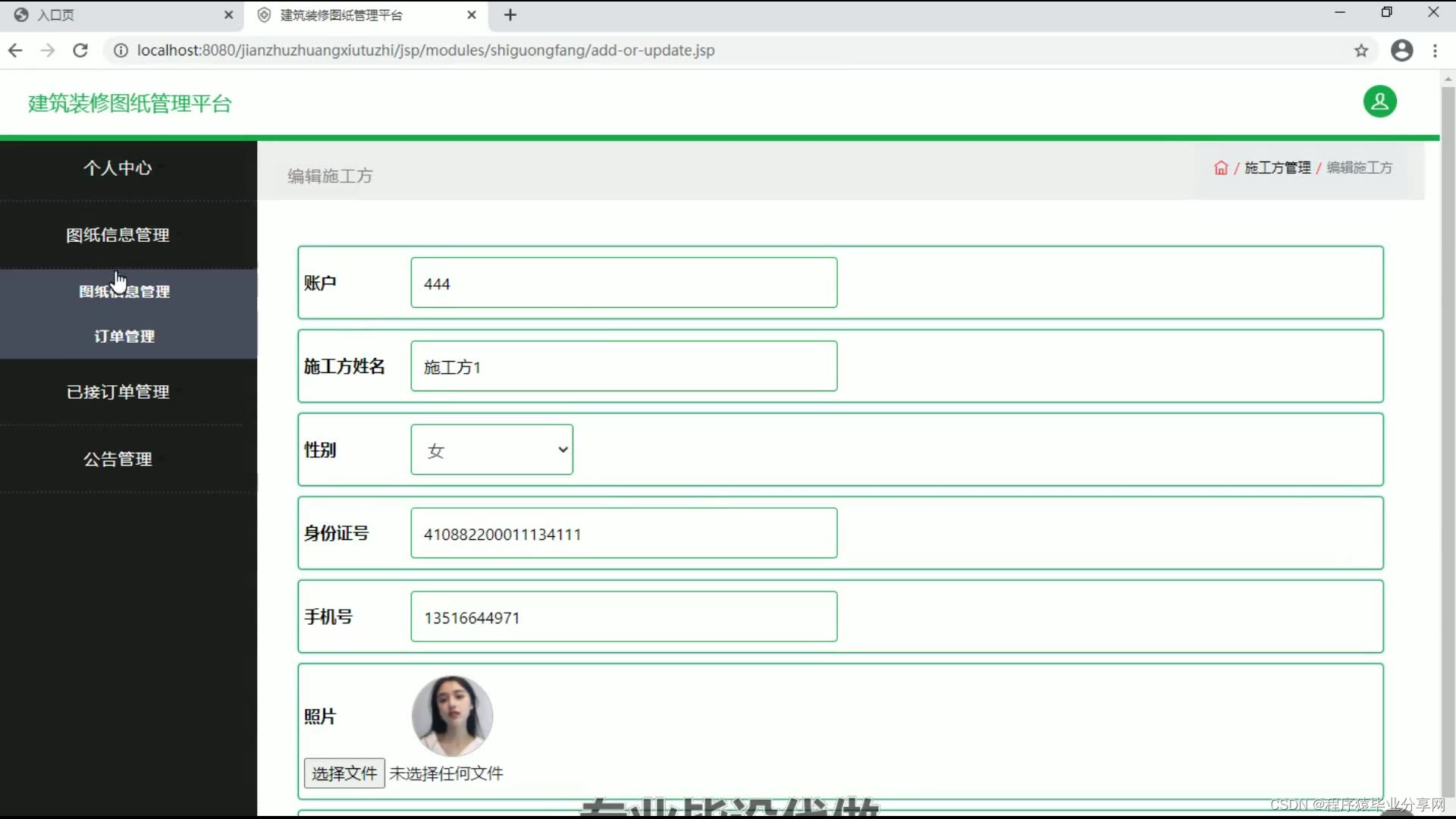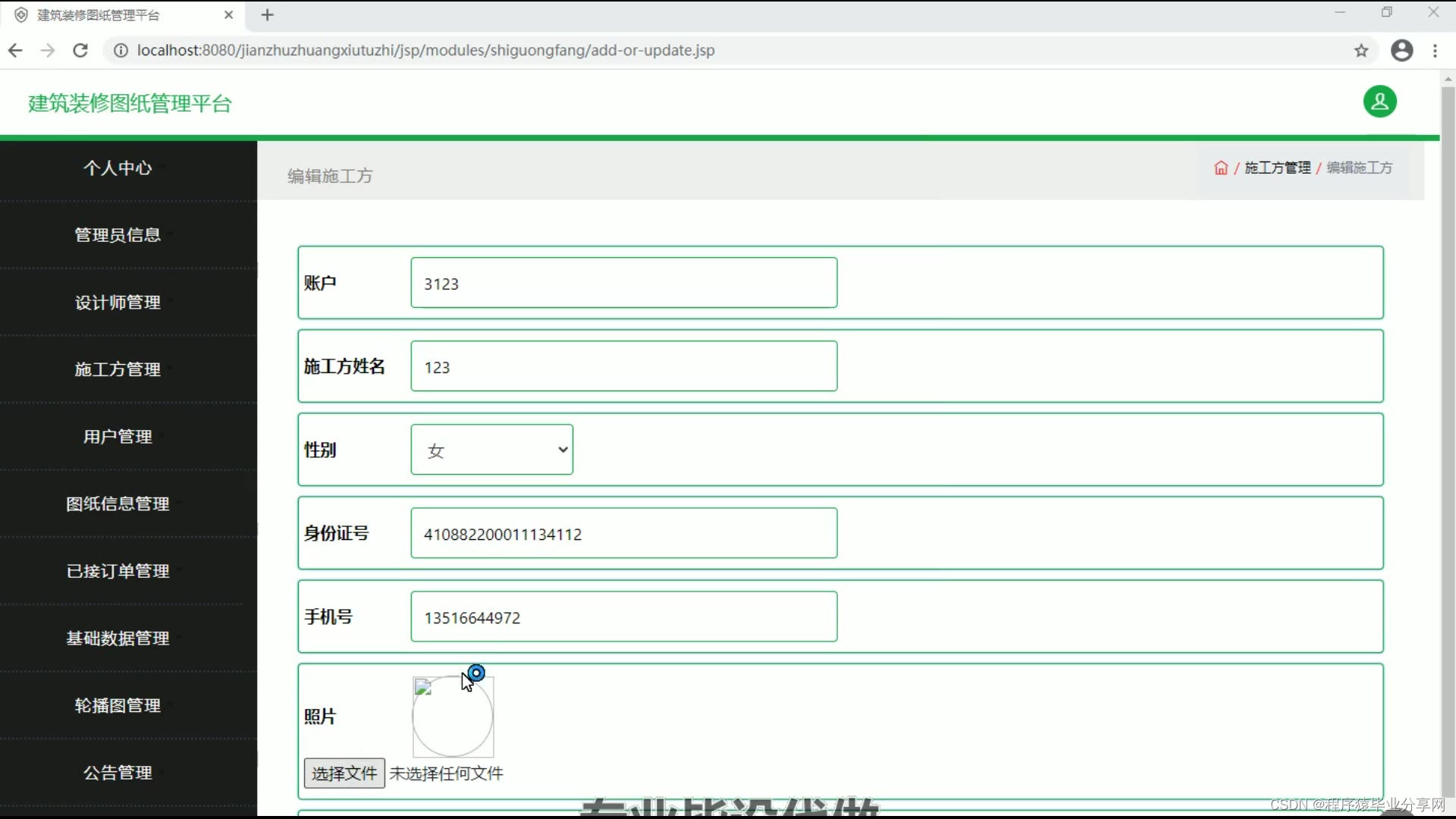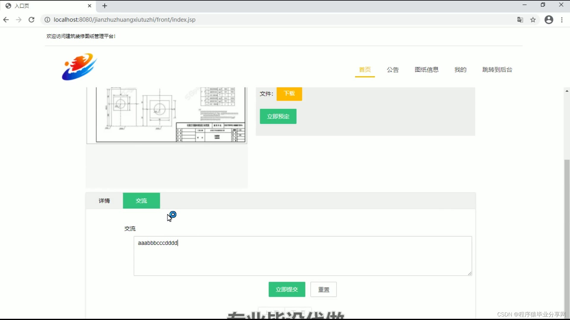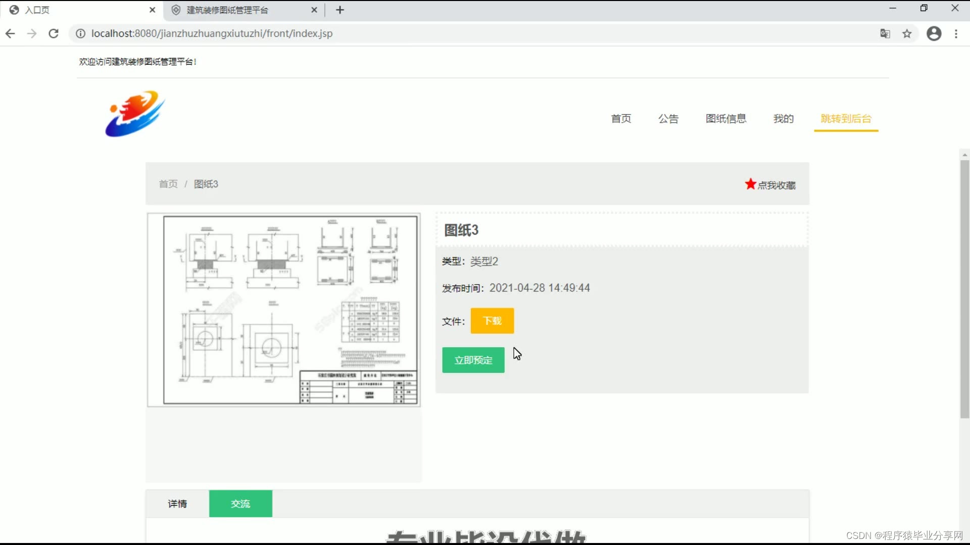 本建筑装修图纸管理平台管理员,用户,设计师,施工方。管理员功能有个人中心,管理员管理,设计师管理,施工方管理,用户管理,图纸信息管理,已接订单管理,基础数据管理,轮播图管理,公告管理。用户可以看到图纸,然后预定,施工方审核。因而具有一定的实用性。