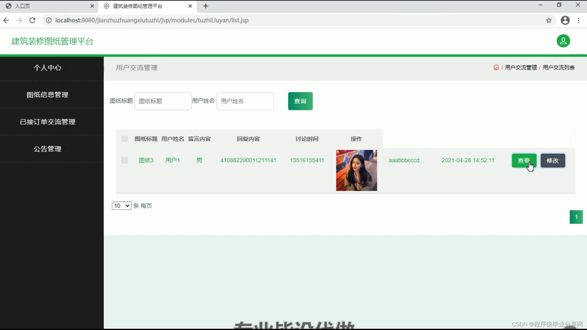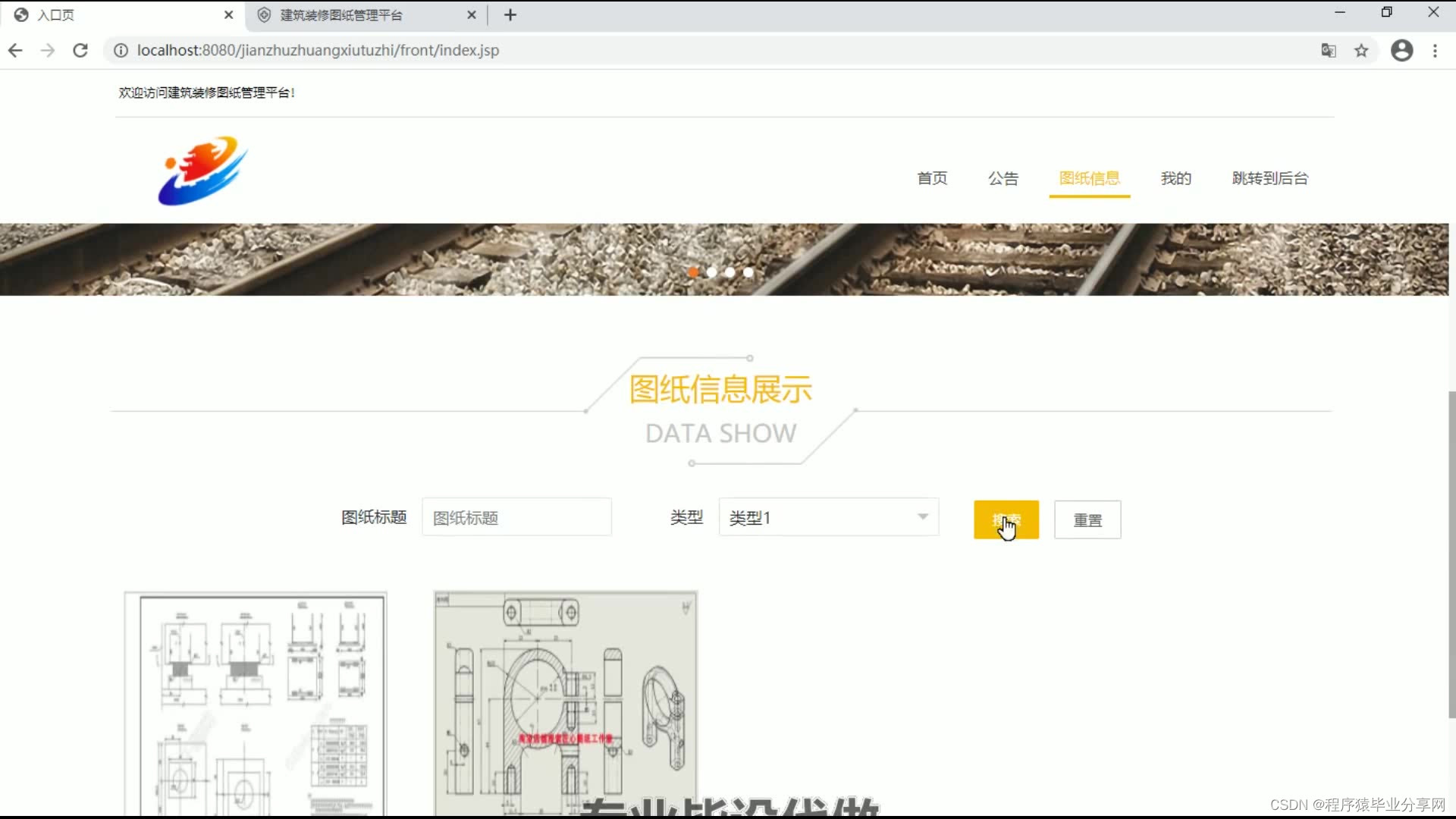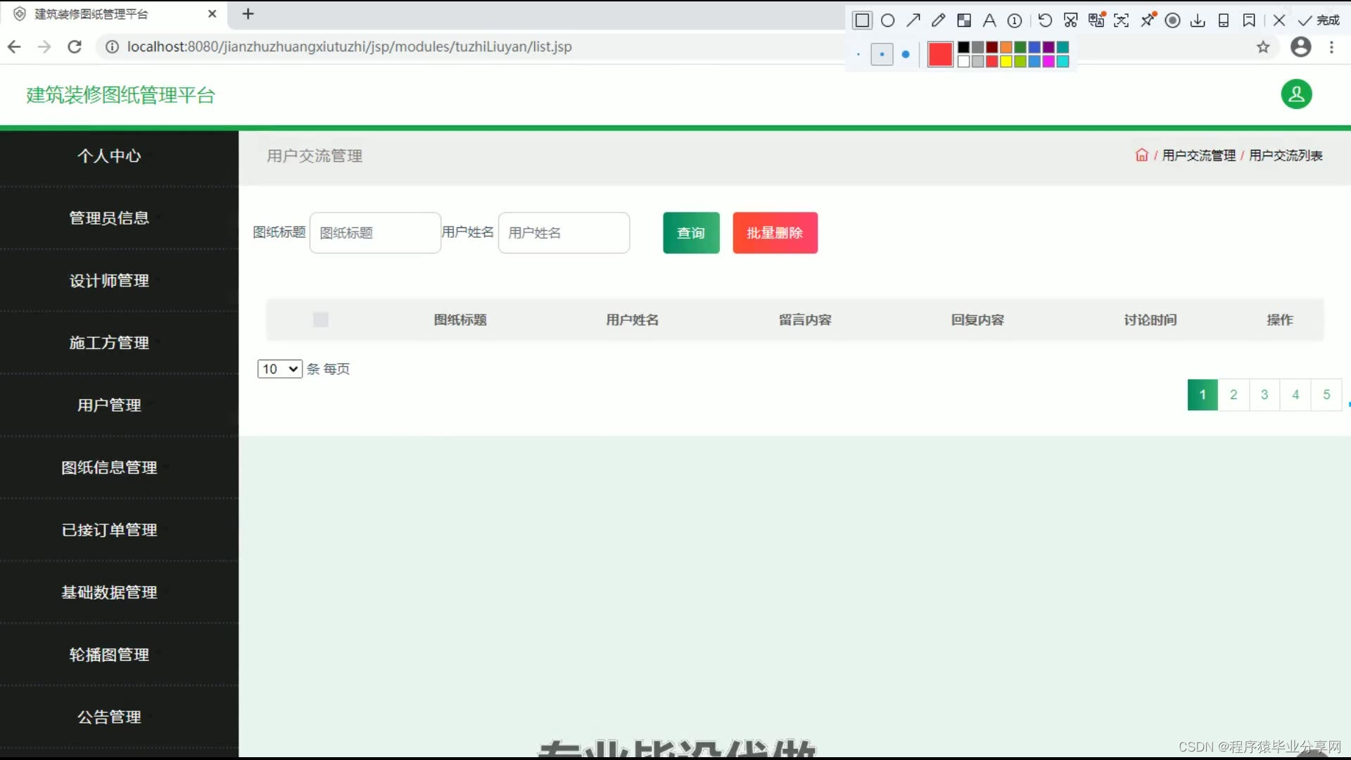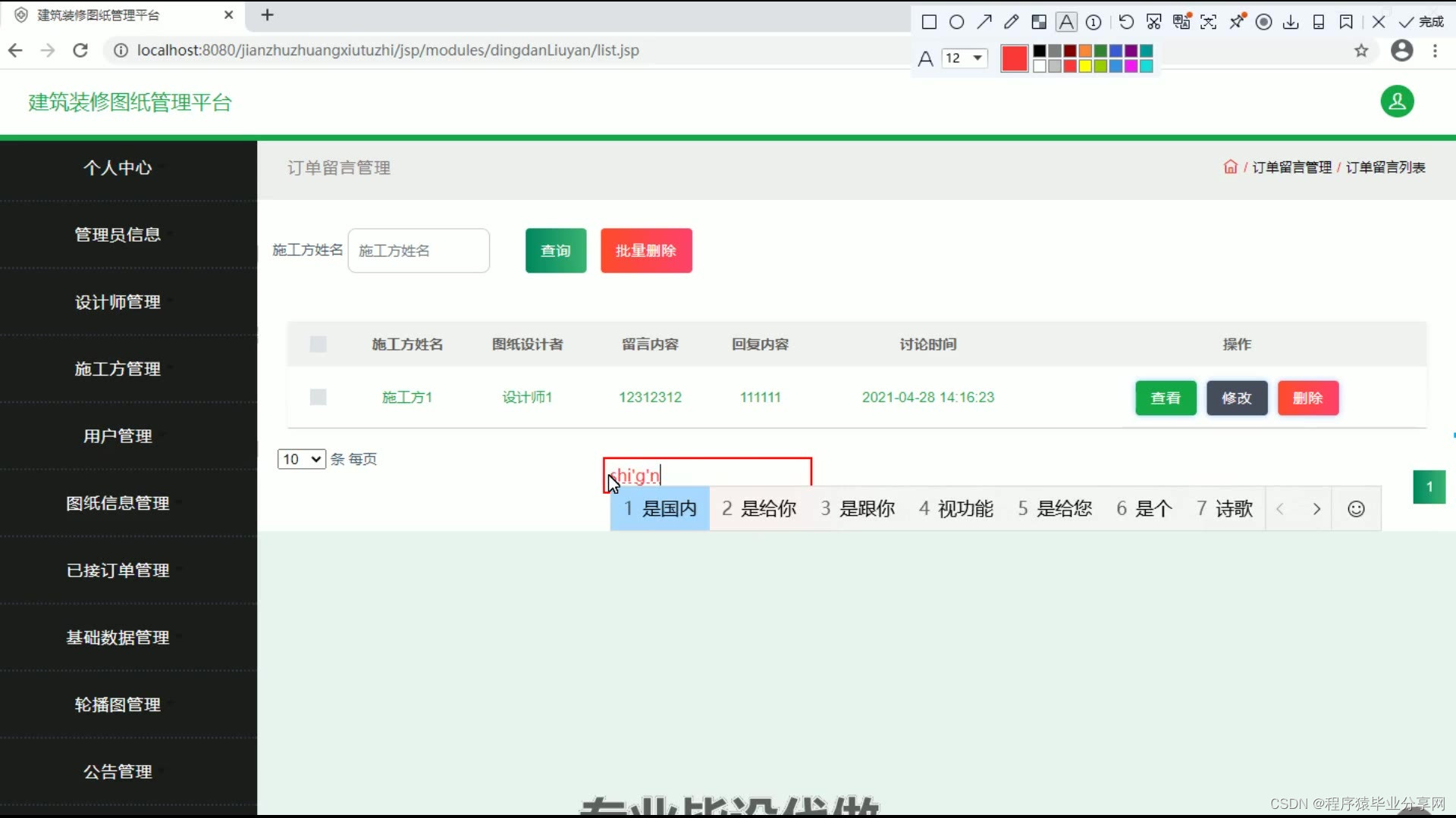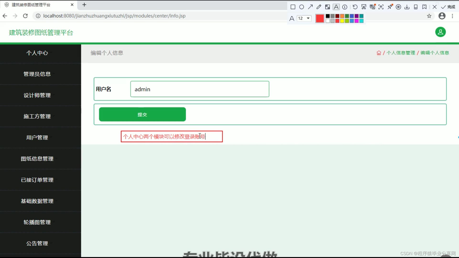 本建筑装修图纸管理平台管理员,用户,设计师,施工方。管理员功能有个人中心,管理员管理,设计师管理,施工方管理,用户管理,图纸信息管理,已接订单管理,基础数据管理,轮播图管理,公告管理。用户可以看到图纸,然后预定,施工方审核。因而具有一定的实用性。
