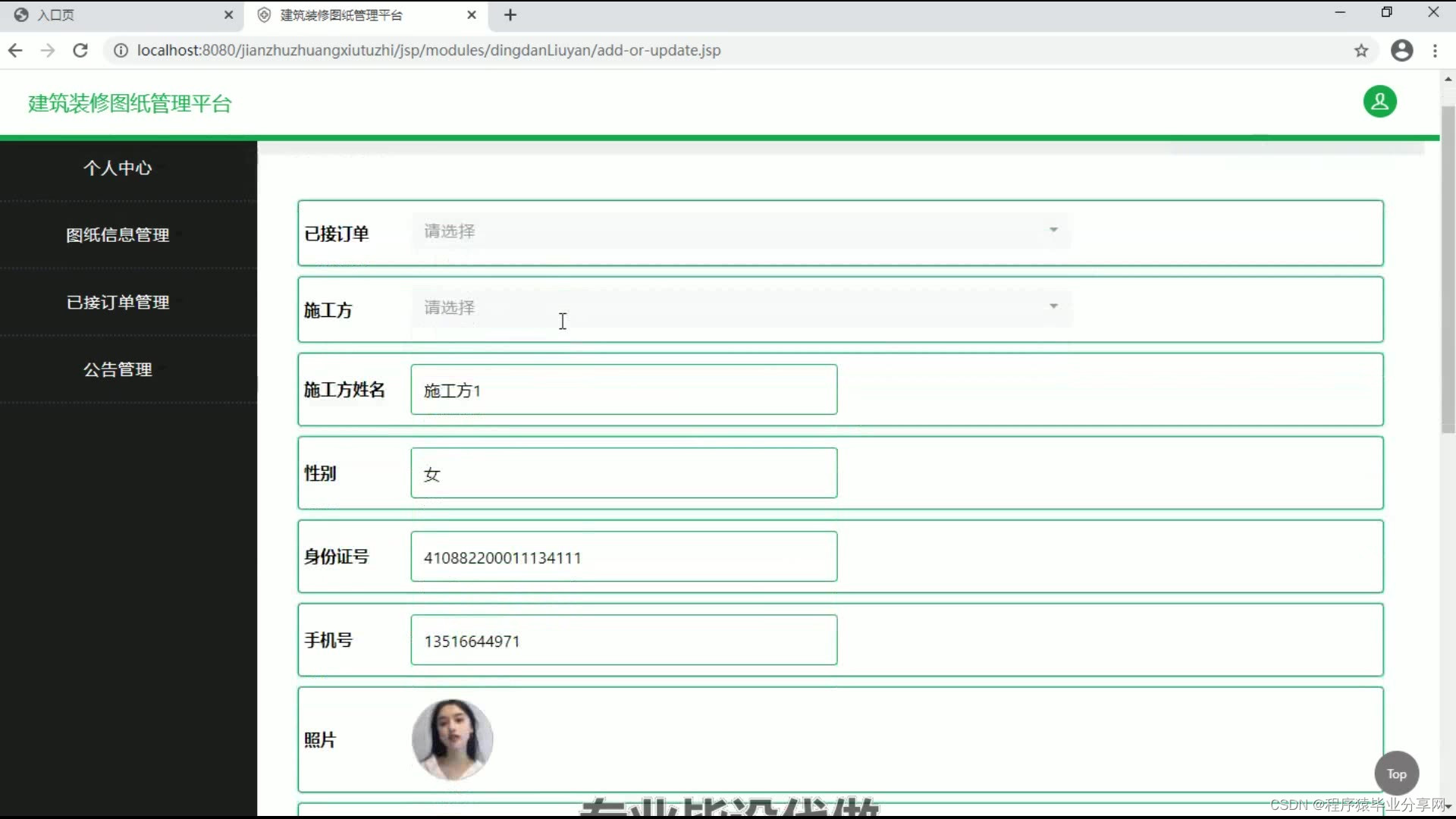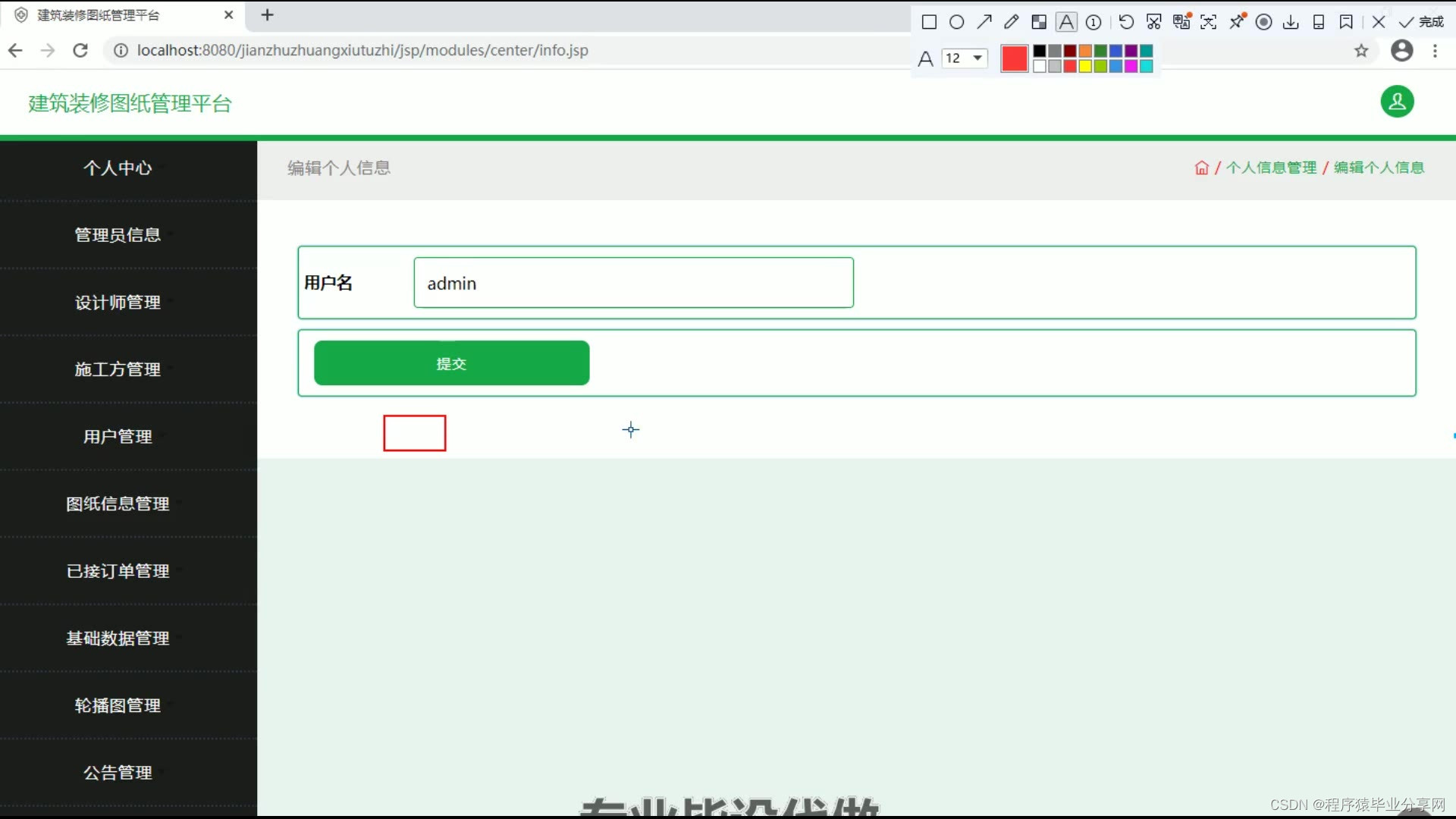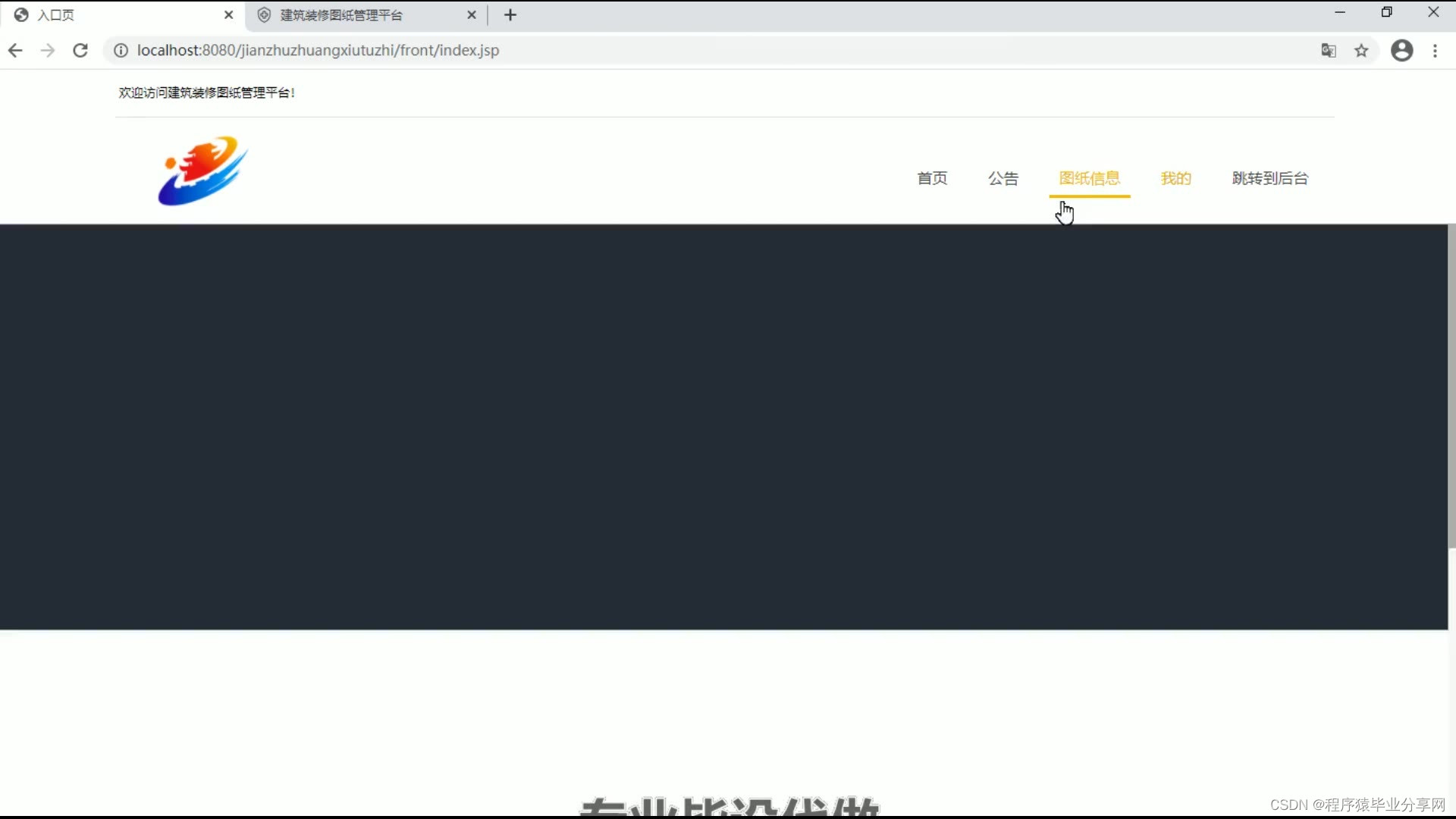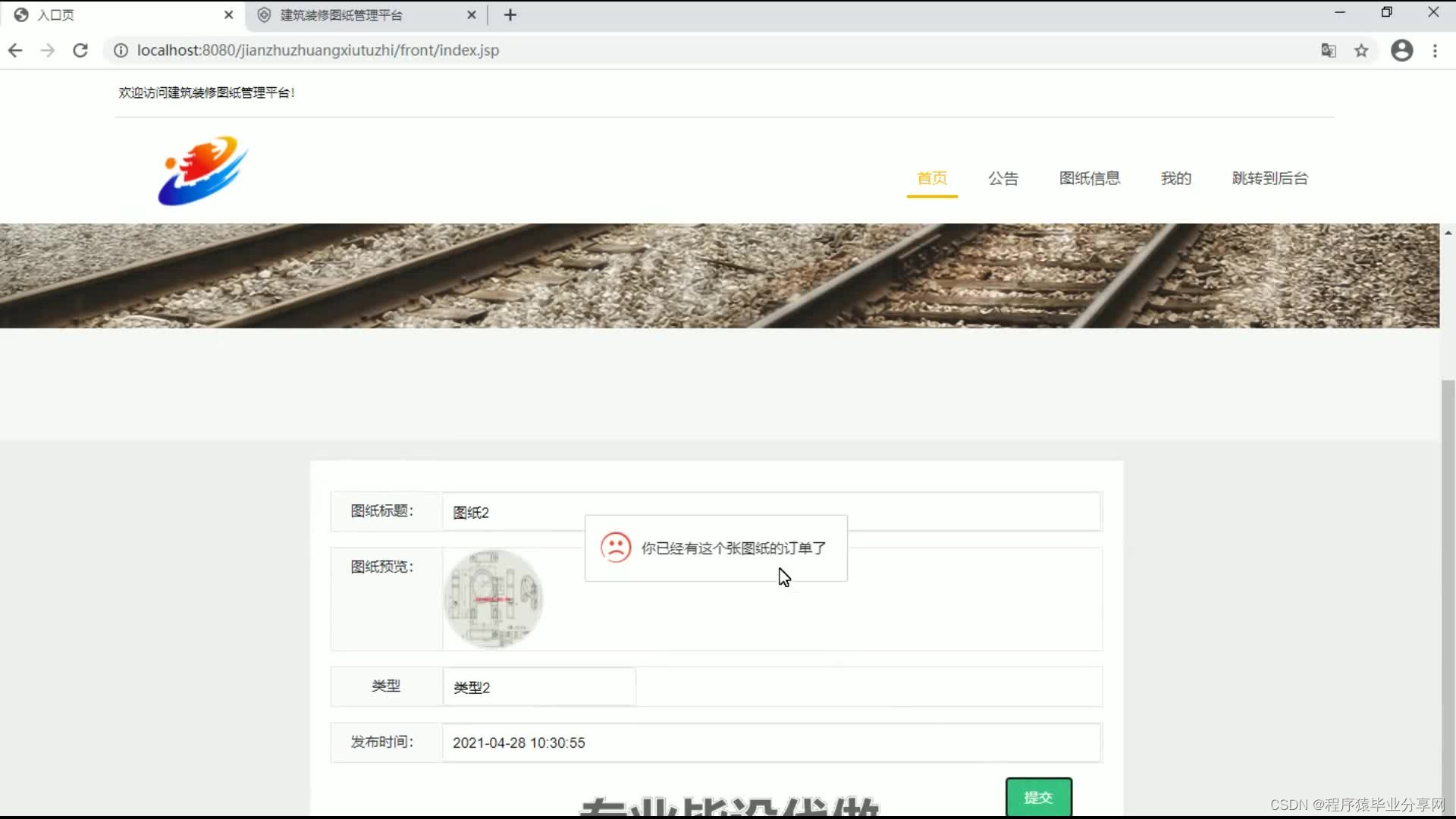 本建筑装修图纸管理平台管理员,用户,设计师,施工方。管理员功能有个人中心,管理员管理,设计师管理,施工方管理,用户管理,图纸信息管理,已接订单管理,基础数据管理,轮播图管理,公告管理。用户可以看到图纸,然后预定,施工方审核。因而具有一定的实用性。