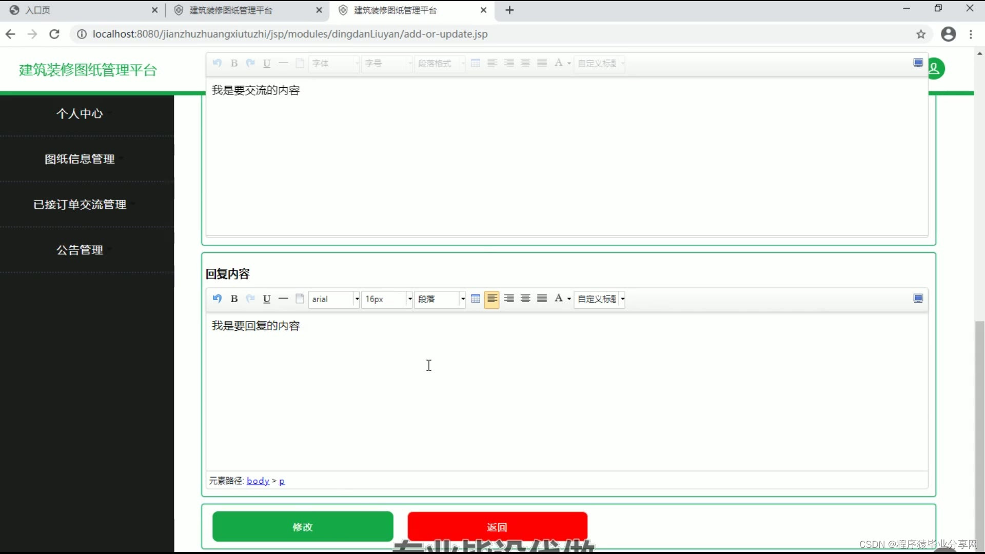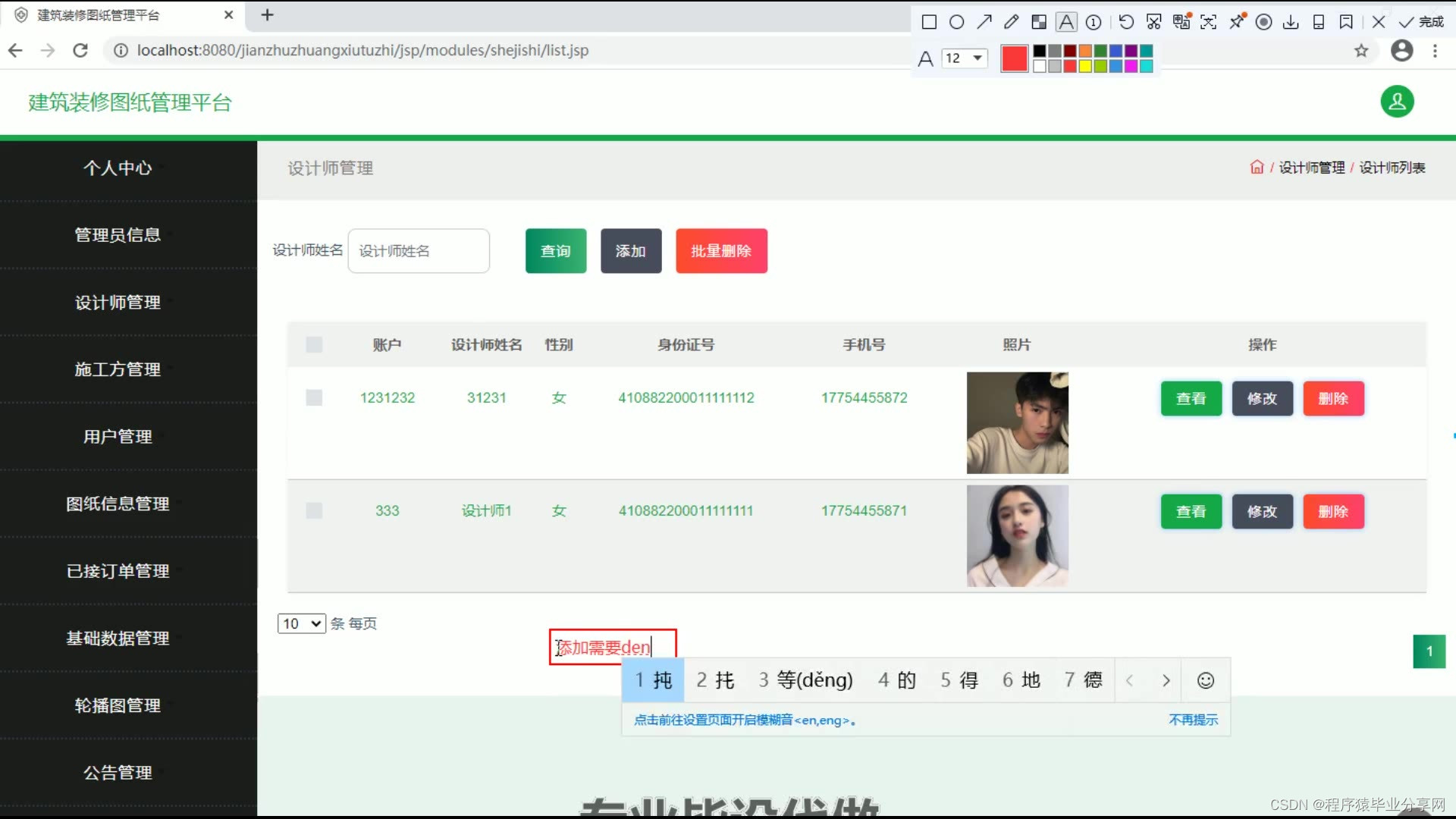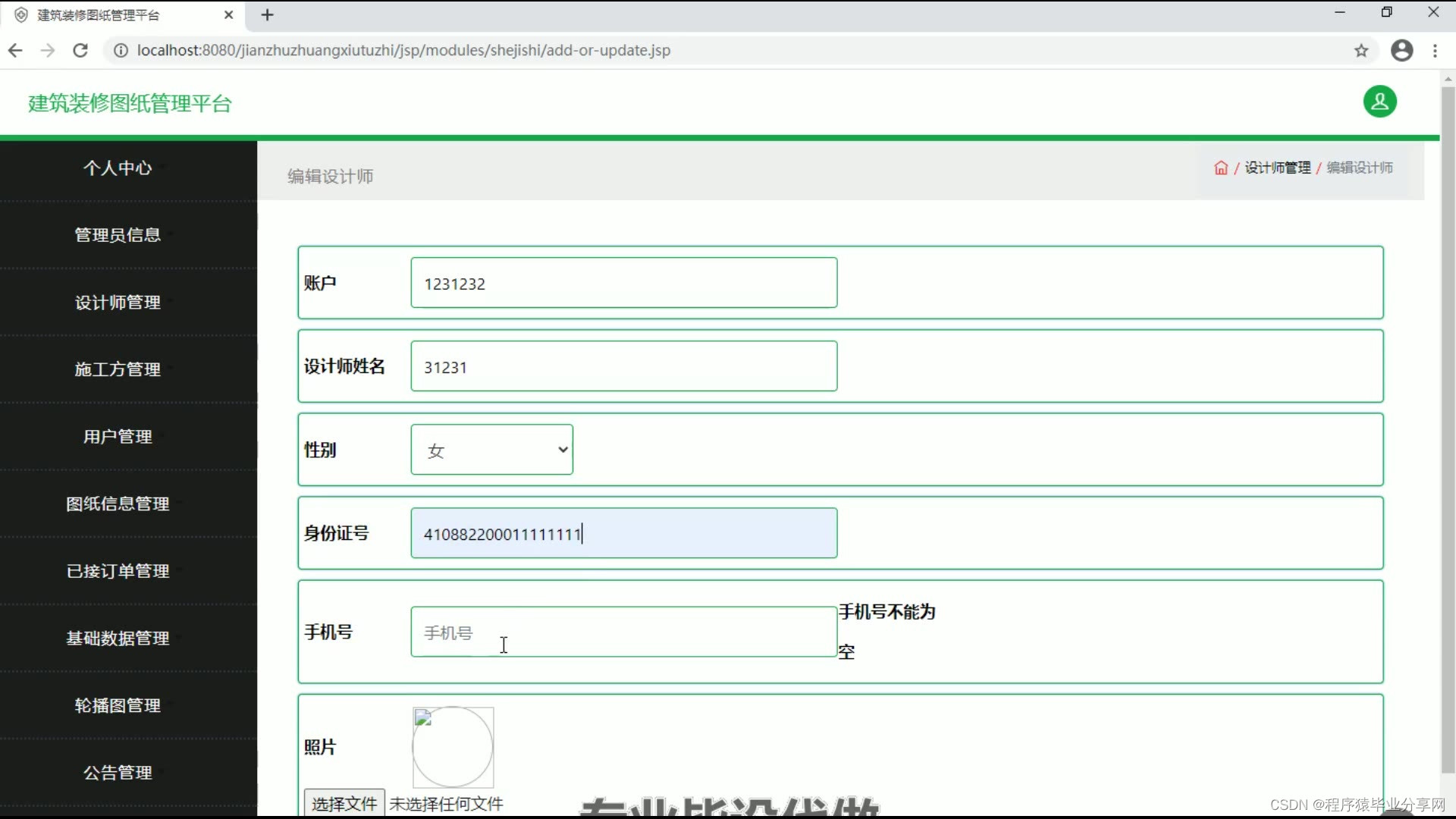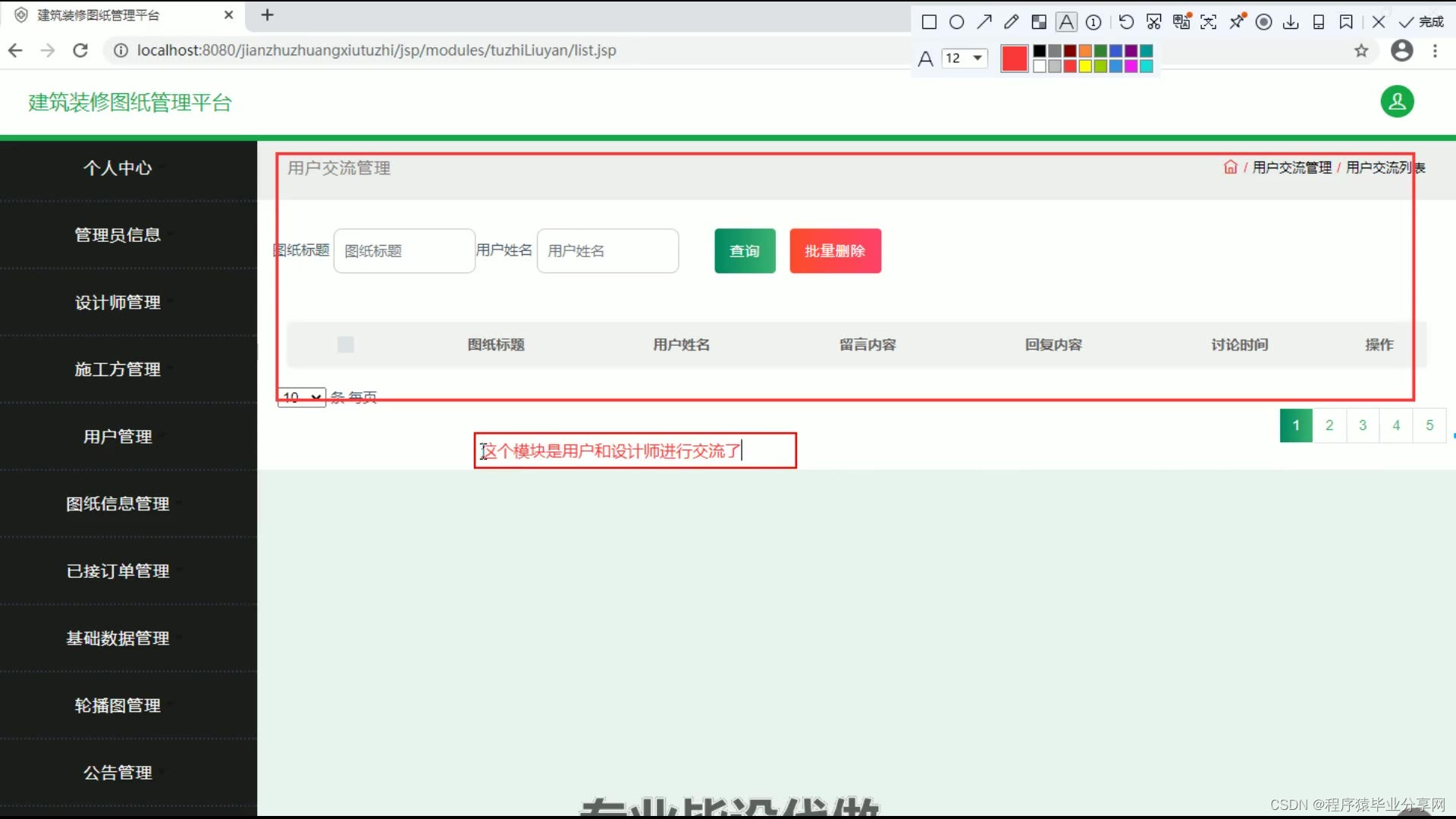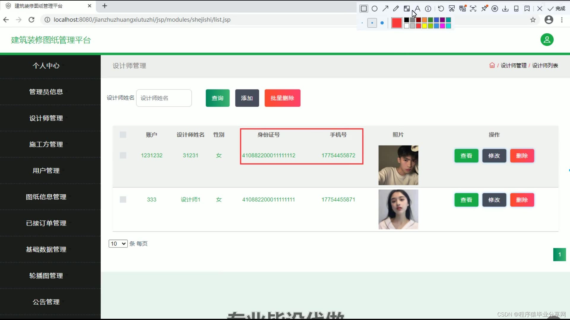 本建筑装修图纸管理平台管理员,用户,设计师,施工方。管理员功能有个人中心,管理员管理,设计师管理,施工方管理,用户管理,图纸信息管理,已接订单管理,基础数据管理,轮播图管理,公告管理。用户可以看到图纸,然后预定,施工方审核。因而具有一定的实用性。