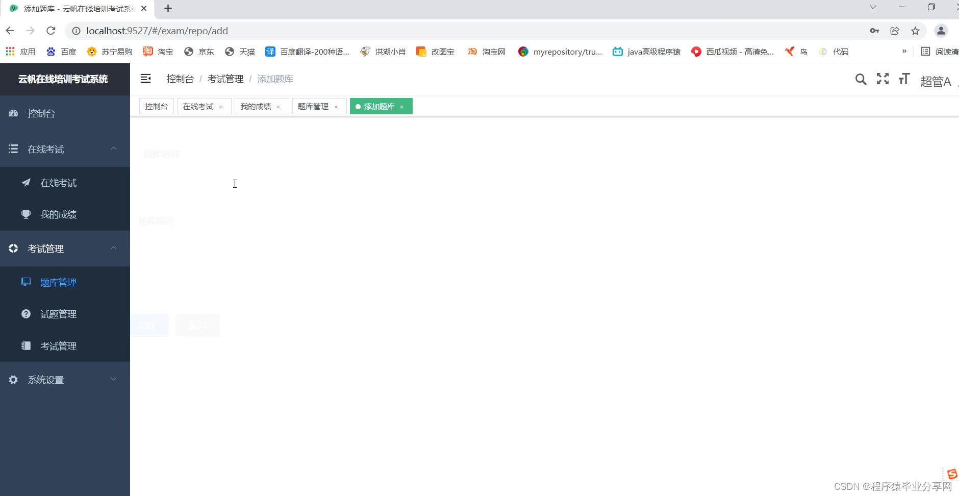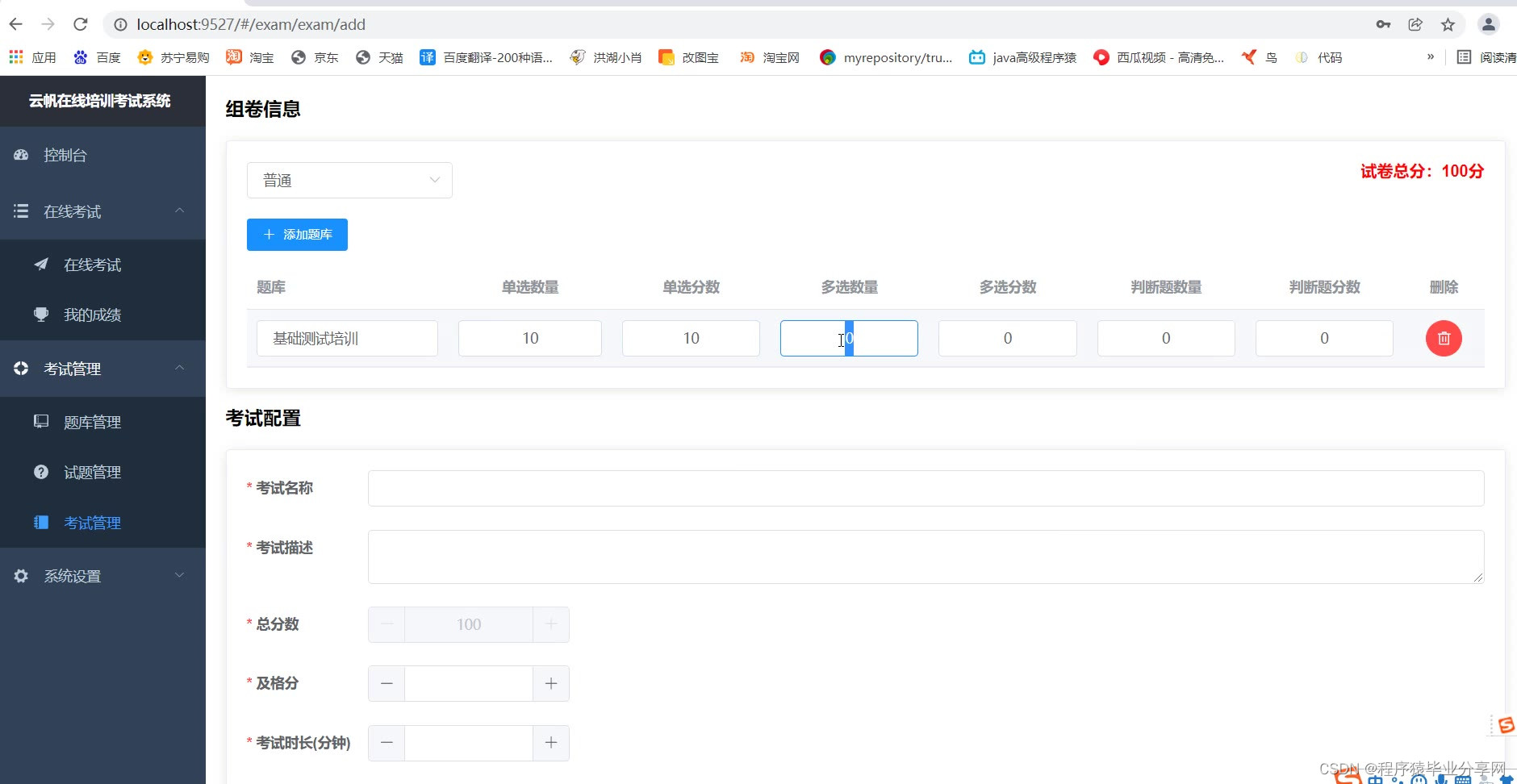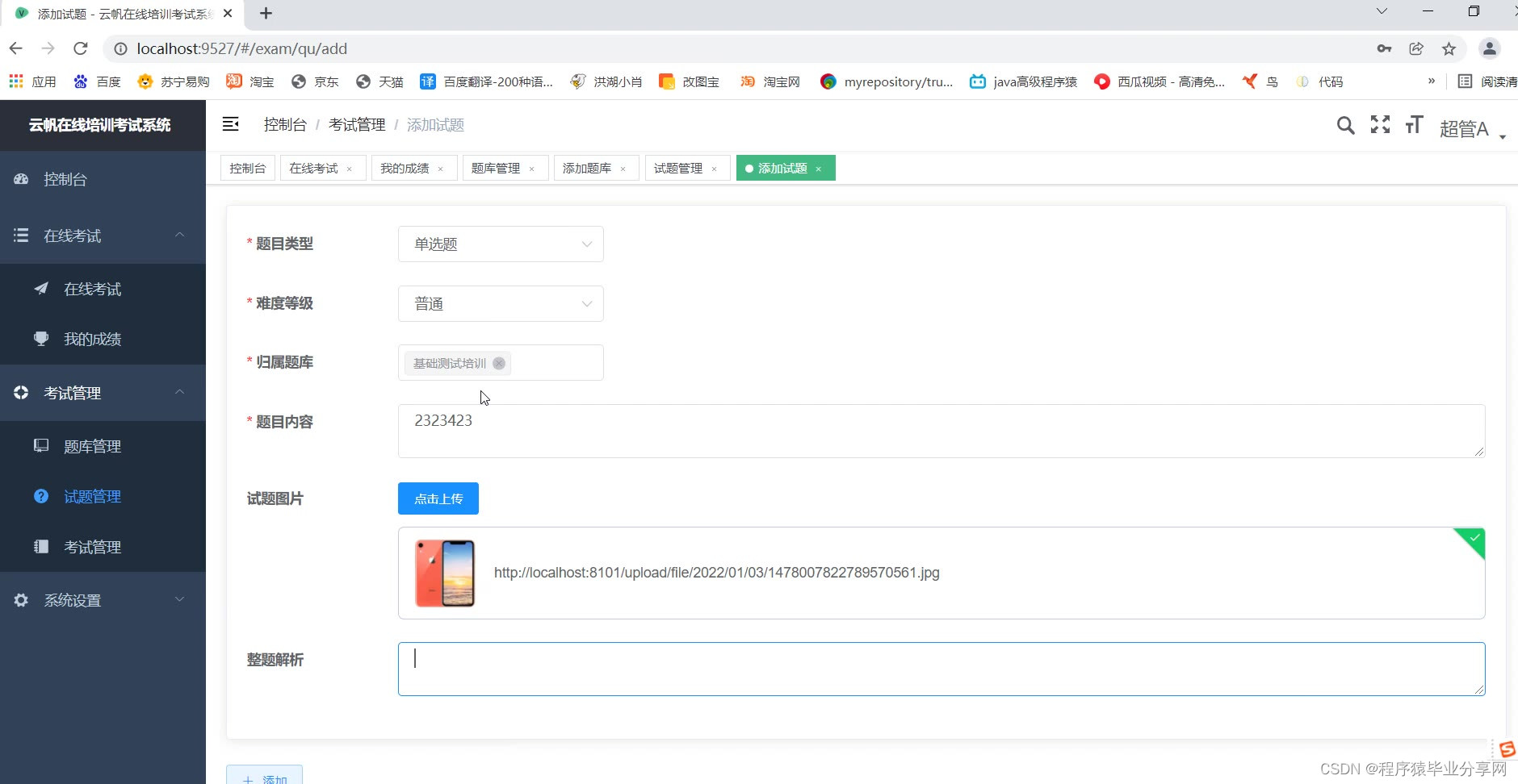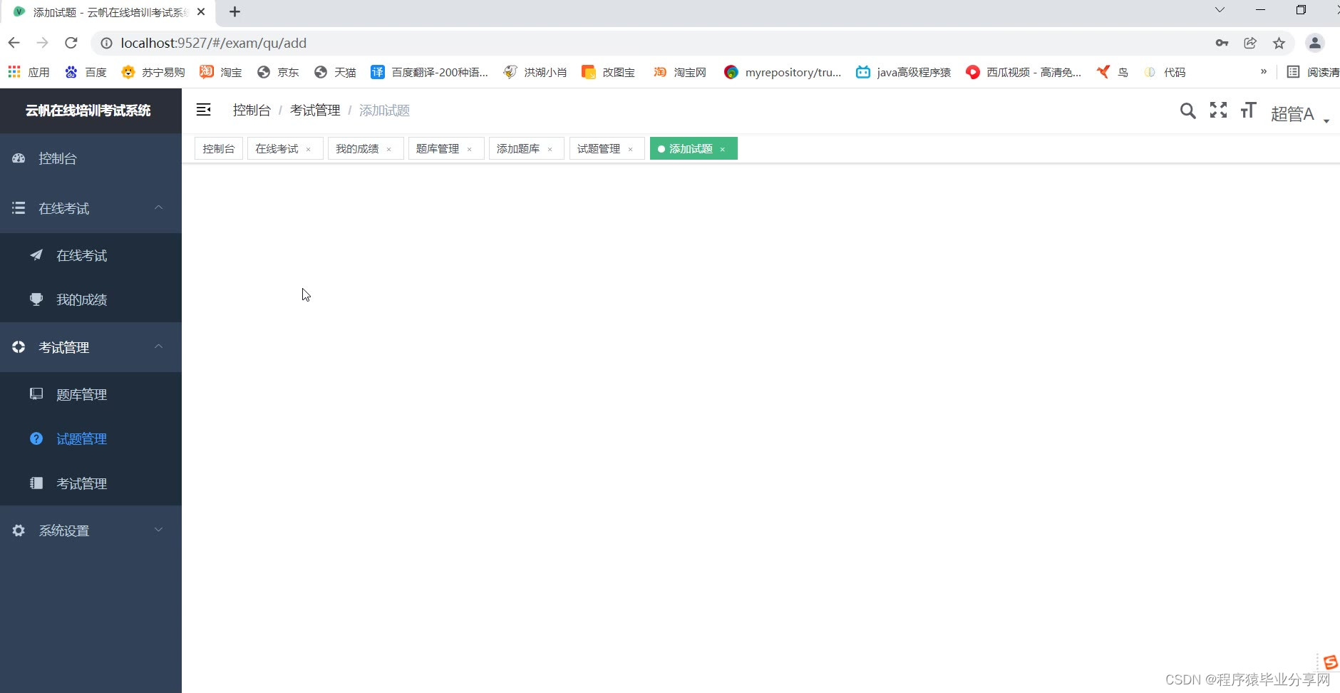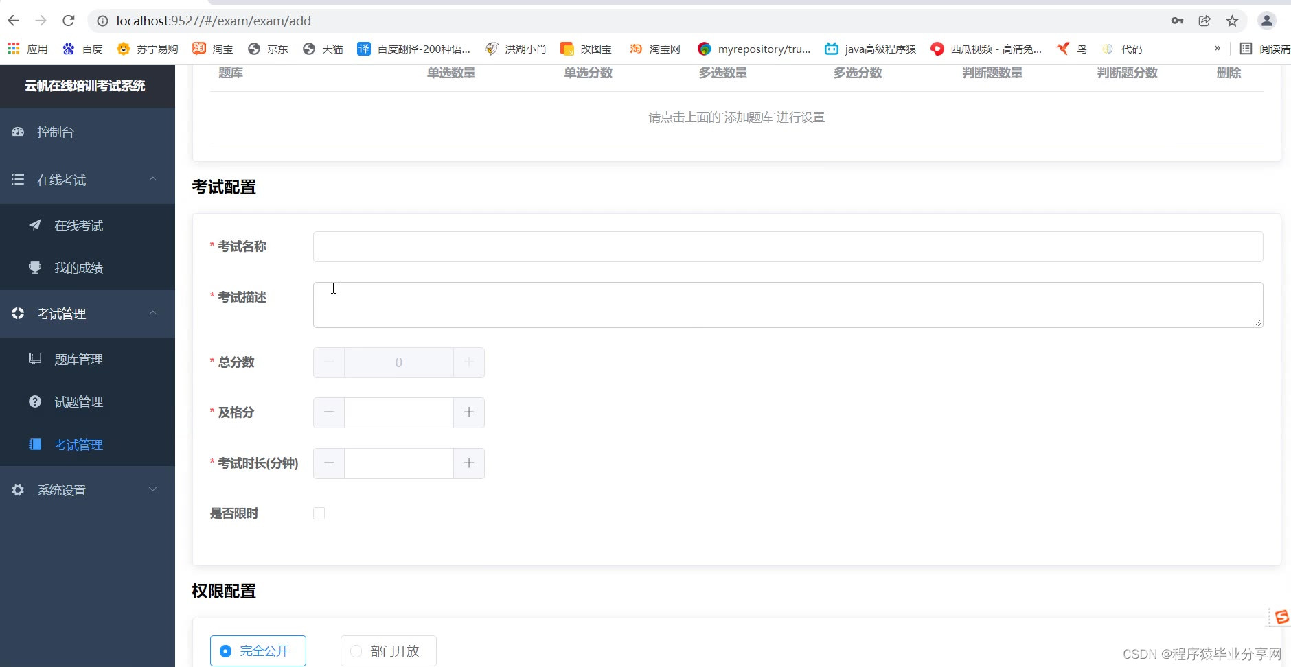 管理端:题库管理、试题管理、考试管理、用户部门管理、查看考试情况等等。