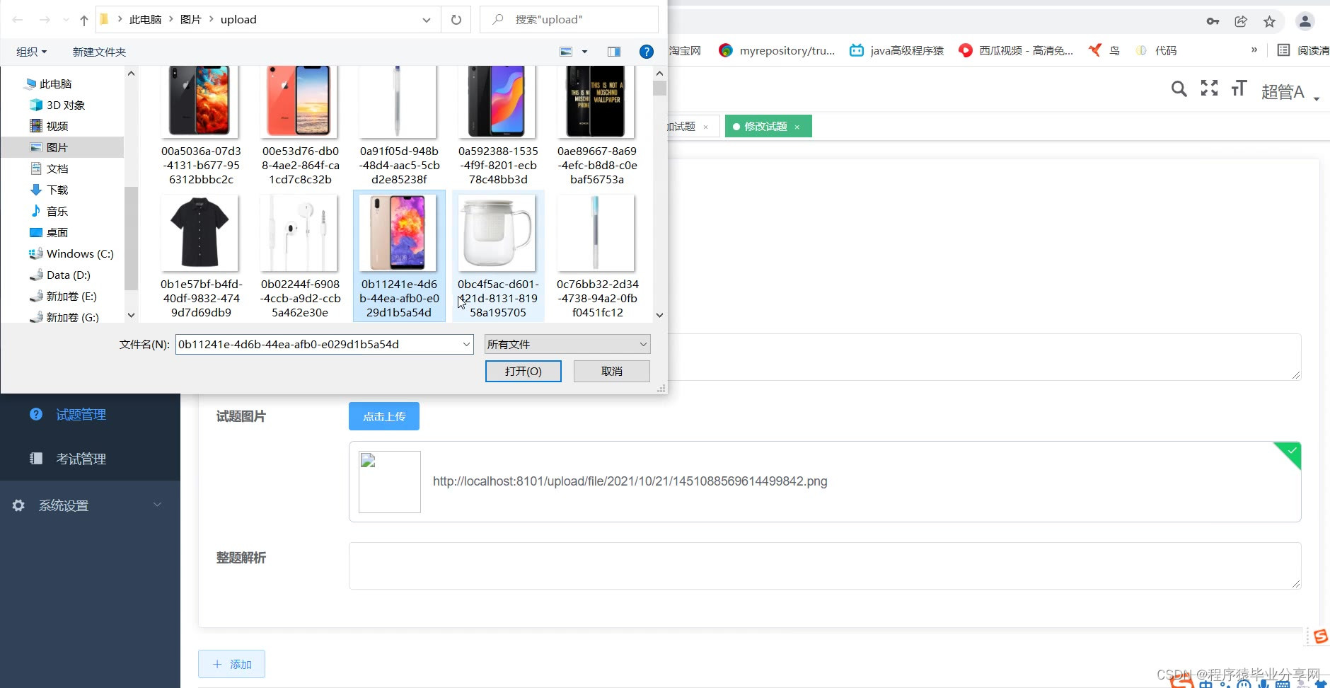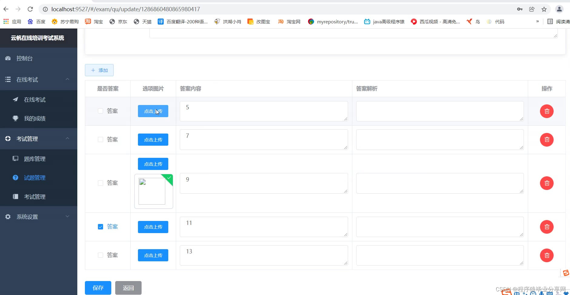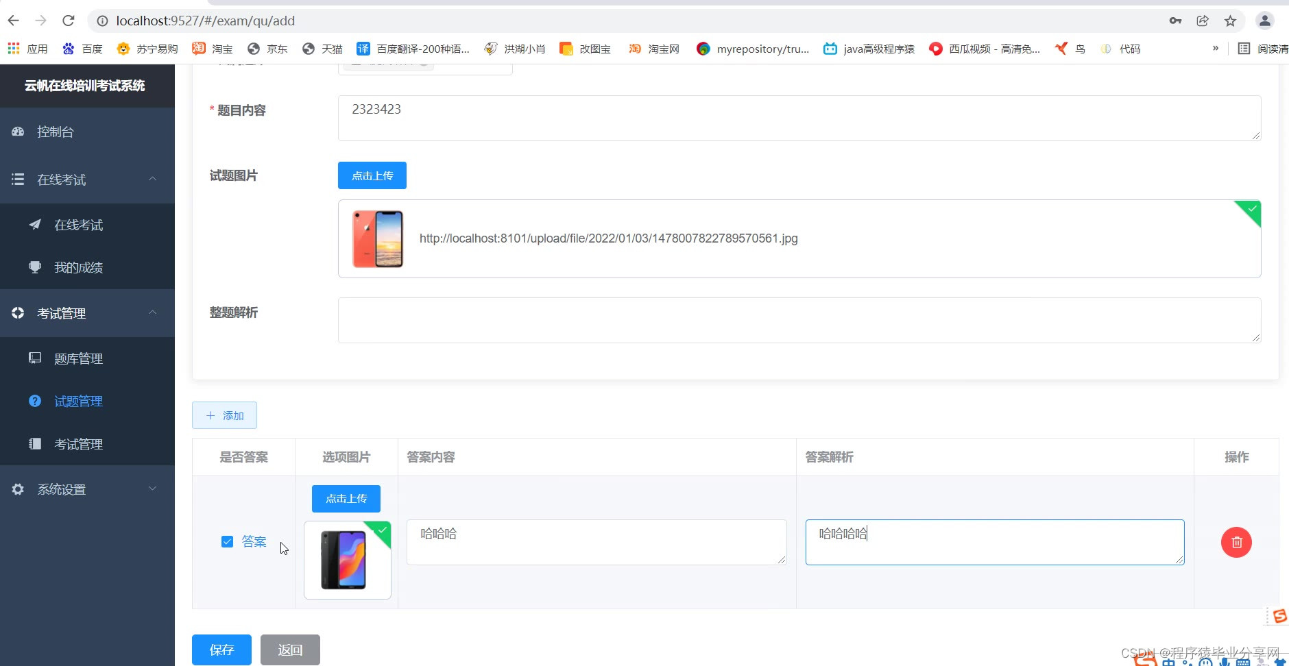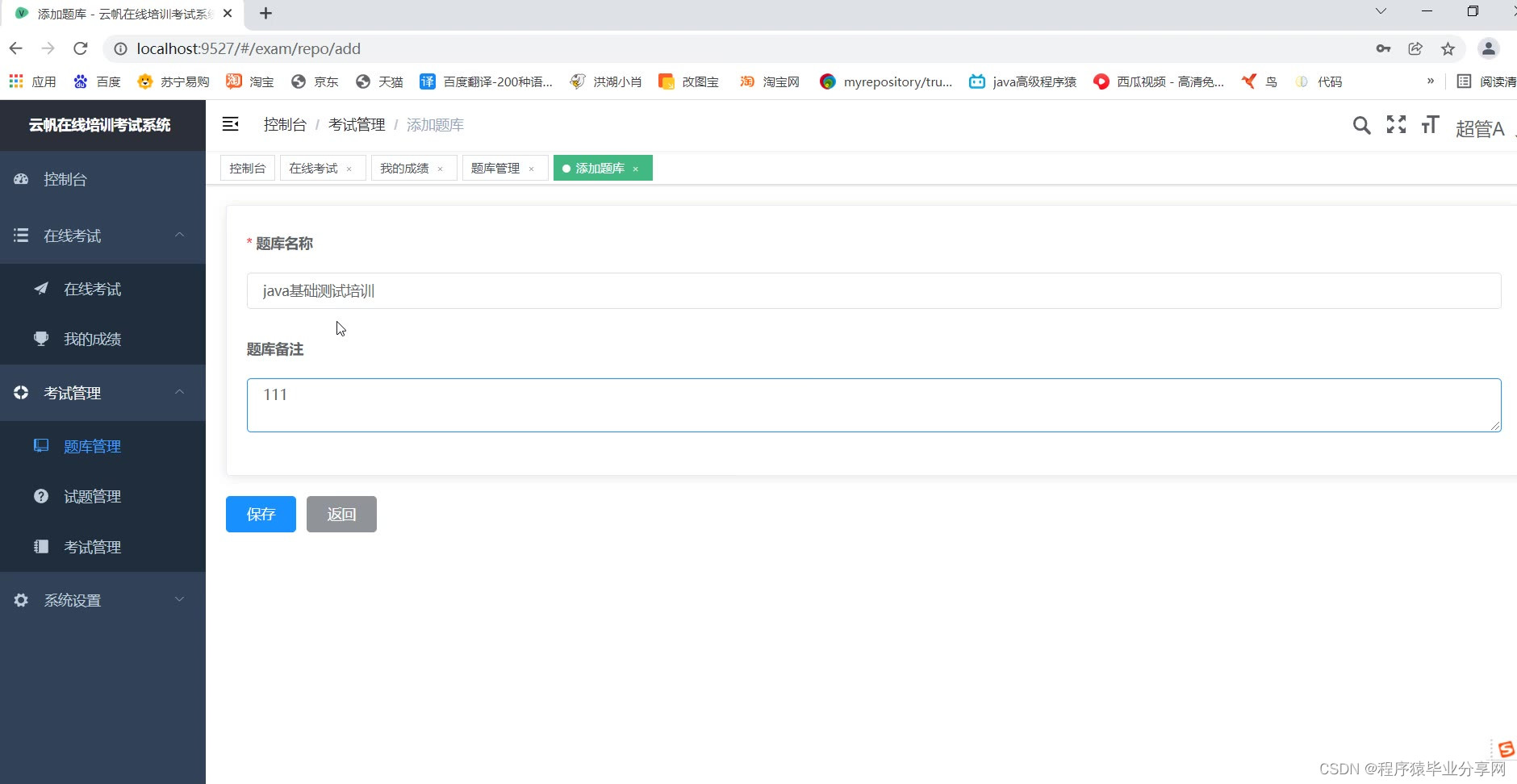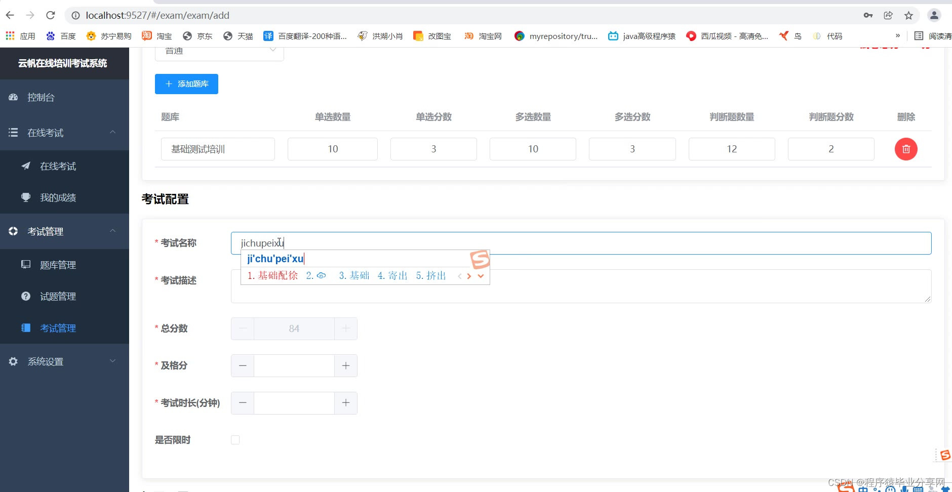 管理端:题库管理、试题管理、考试管理、用户部门管理、查看考试情况等等。
