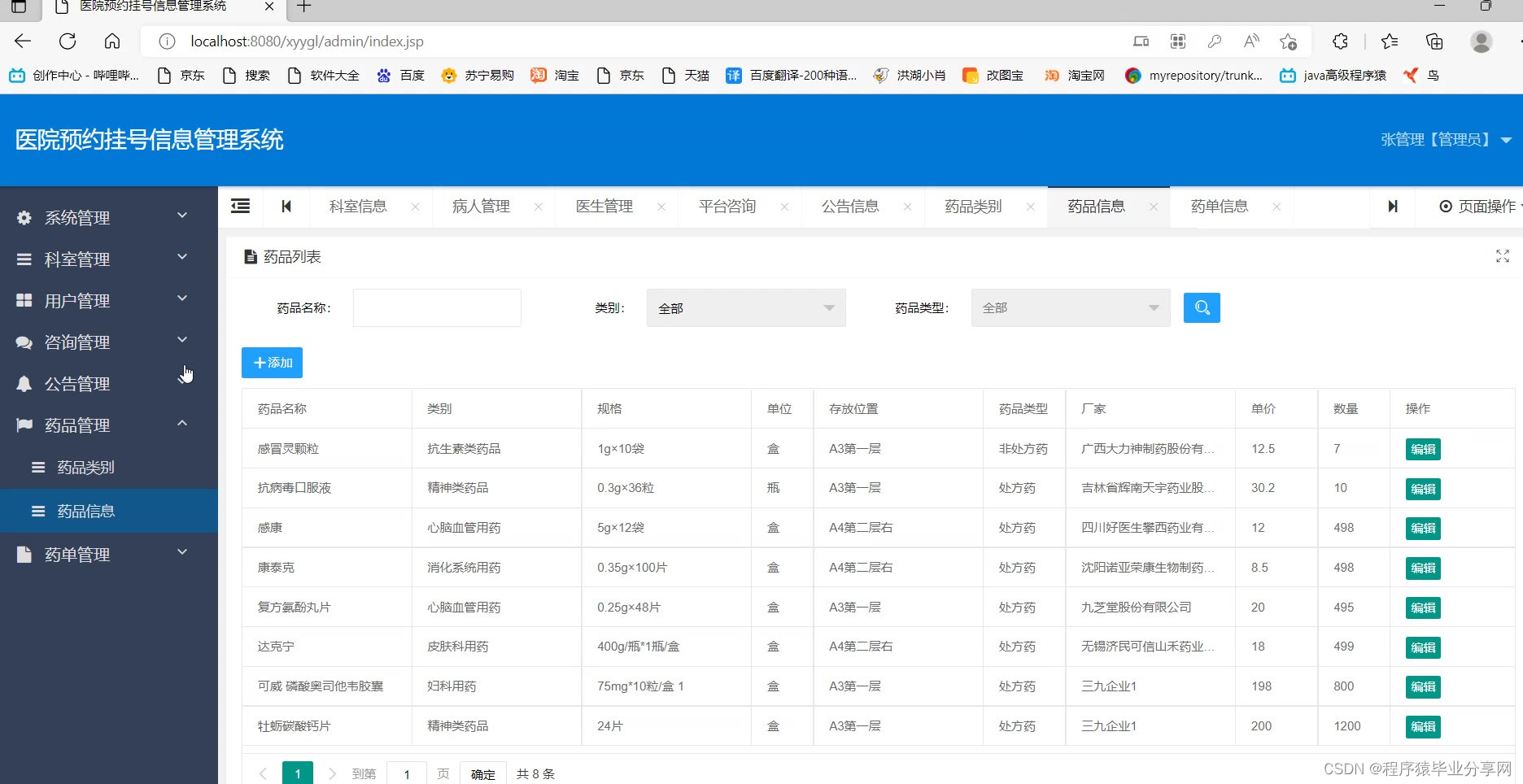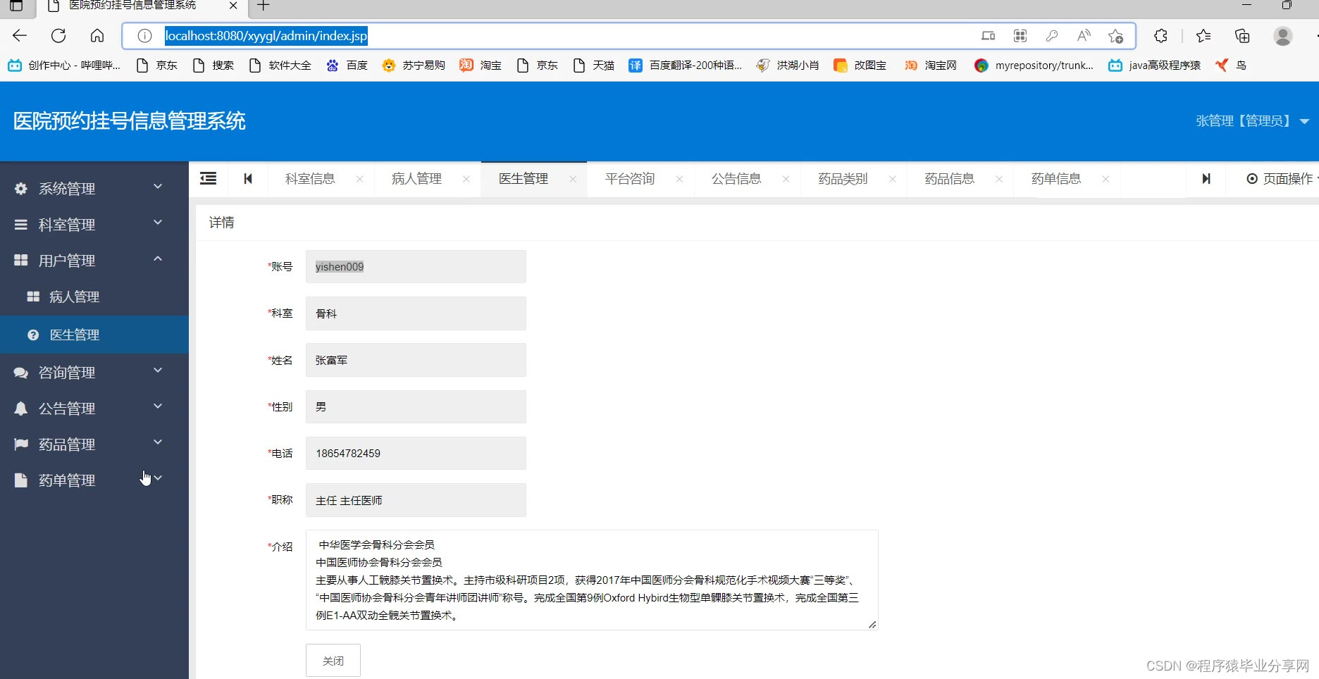 本医院预约挂号系统采用基于java三层架构和B/S模块进行开发。系统分为实体 类模块、数据库管理模块、后台管理模块和前台管理模块四个模块。主要面向管 理员用户和员工用户,在浏览器中实现进退药品管理、库存信息管理、采购信息 管理、药品信息管理和综合信息管理五大功能。系统对硬件环境要求不高,模块 清晰,界面设计友好美观,操作简单,方便实用,数据存储安全。