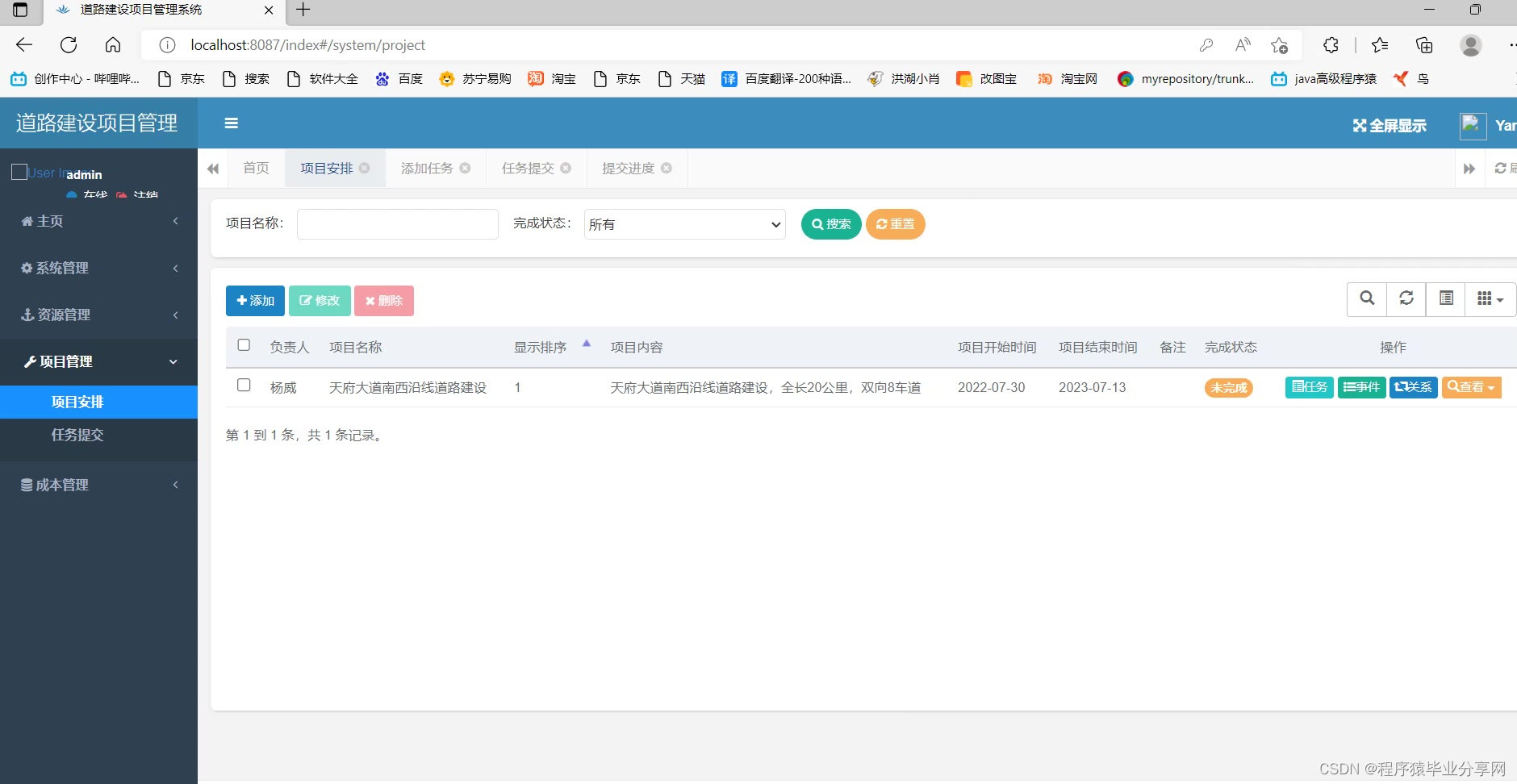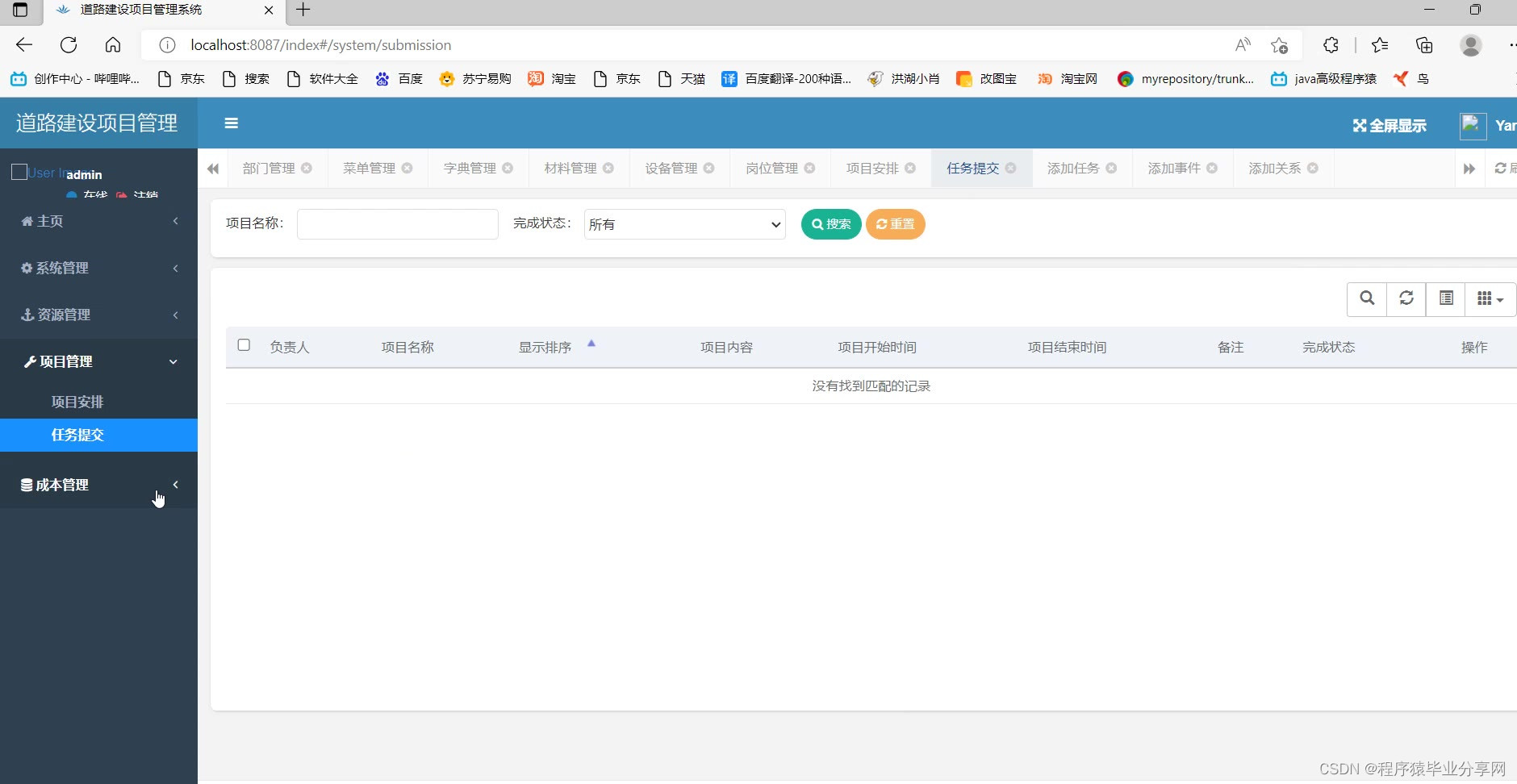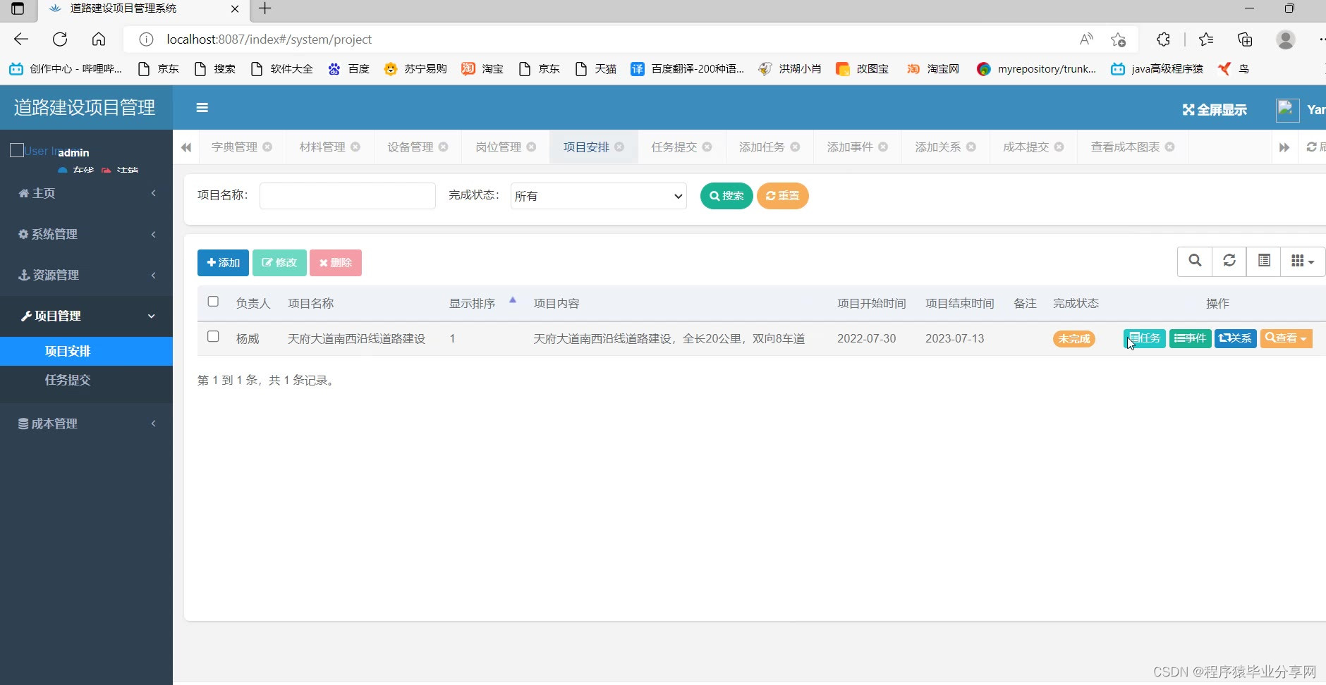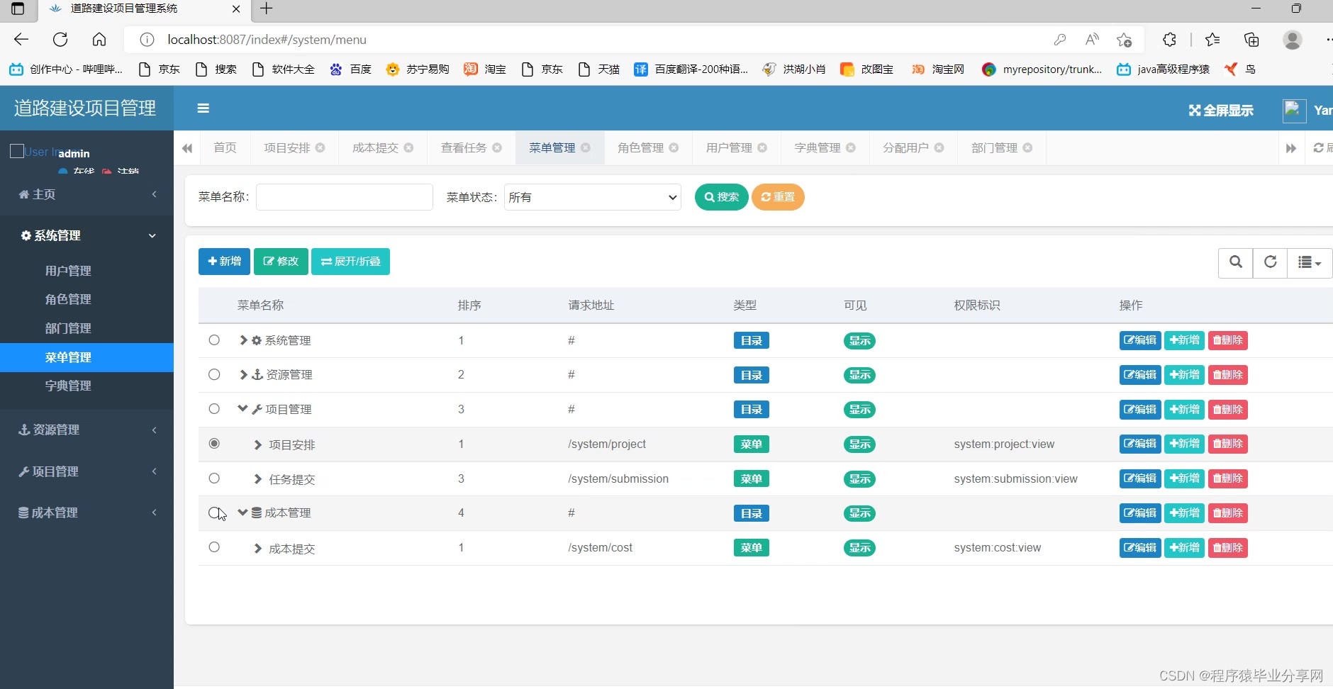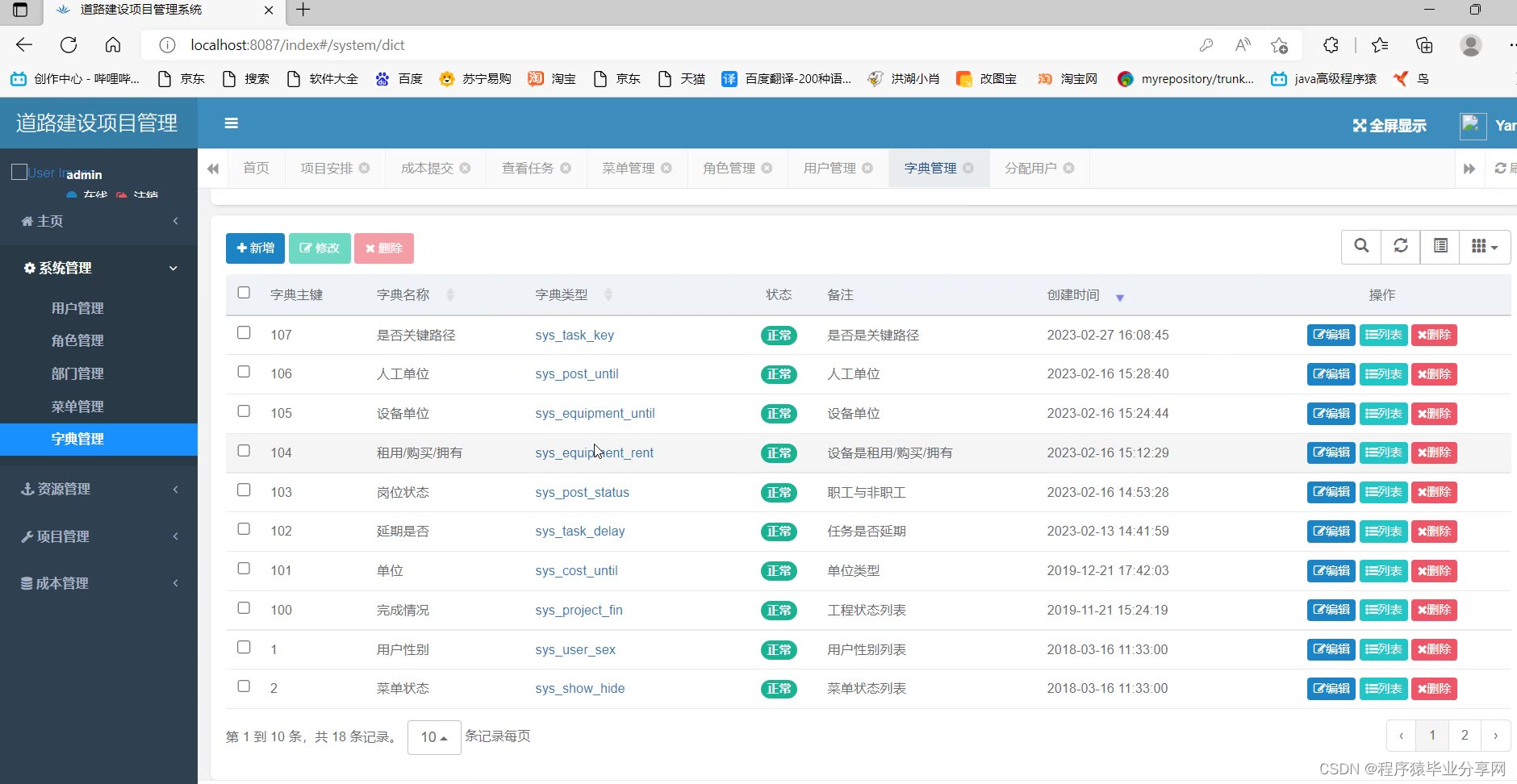 首先,对广东鸿高建设集团有限公司的道路建设项目进行了实地调研和分析,然后,在研究了当前主流的开发平台、技术以及数据库基础上,提出基于Spring Boot+MyBatis框架,采用Ajax、Maven等技术,采用MySQL5.7数据库完成系统的开发方案,运用面向对象分析法,最终实现一个具有用户管理、部门管理、项目安排、任务提交、设备管理、材料管理、岗位管理成本管理等功能的道路建设项目管理系统。为企业提供道路建设项目管理的信息化管理,实现科学规范的管理。
