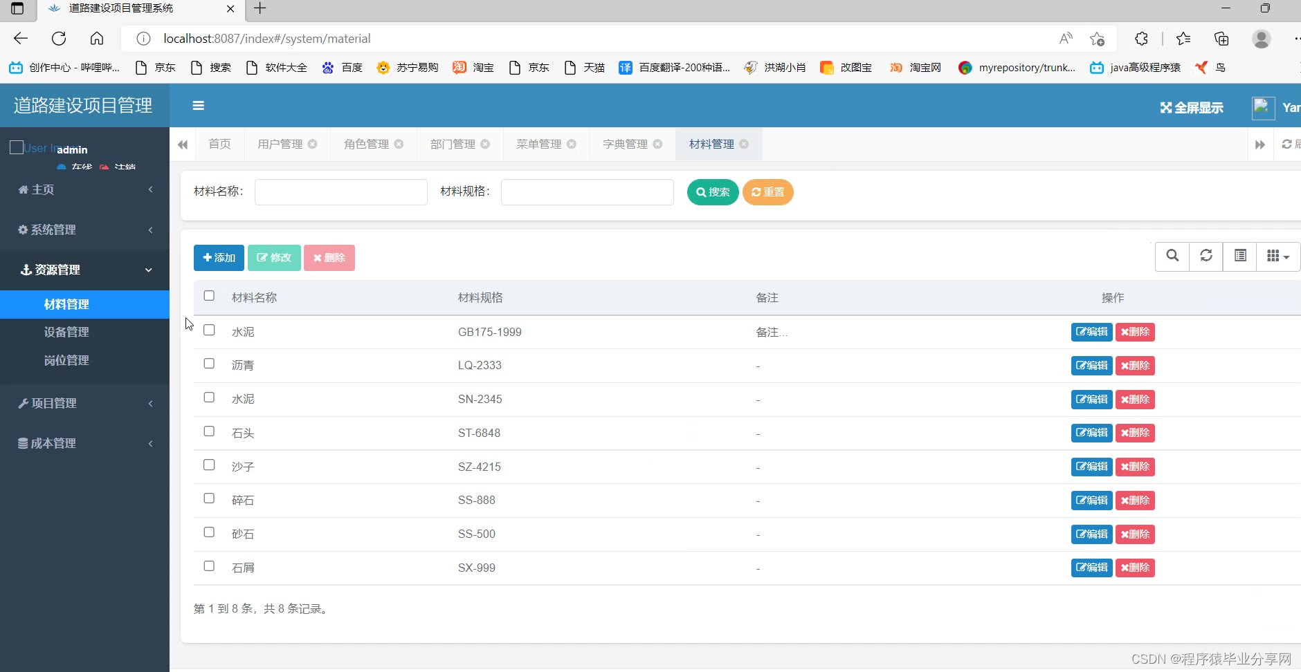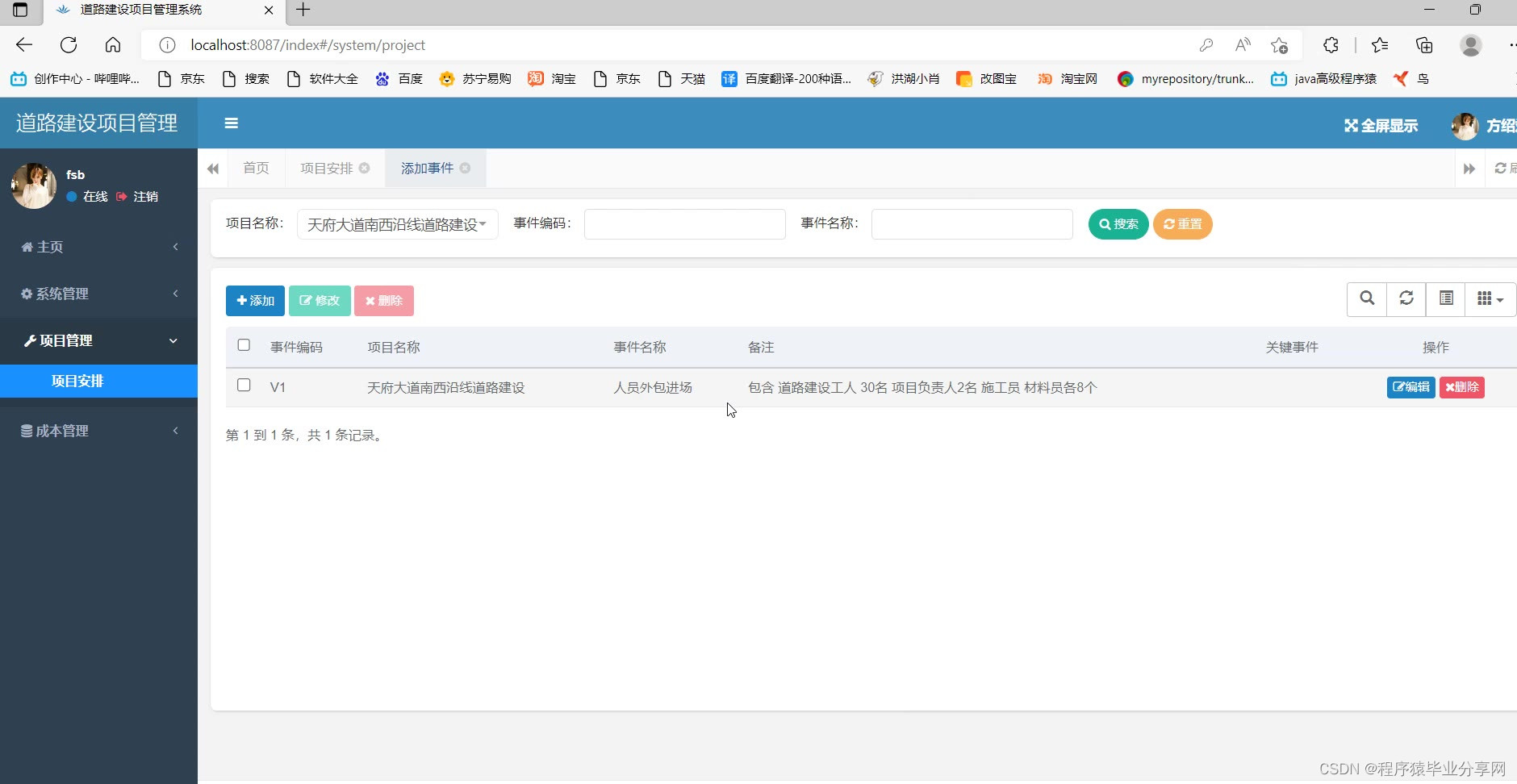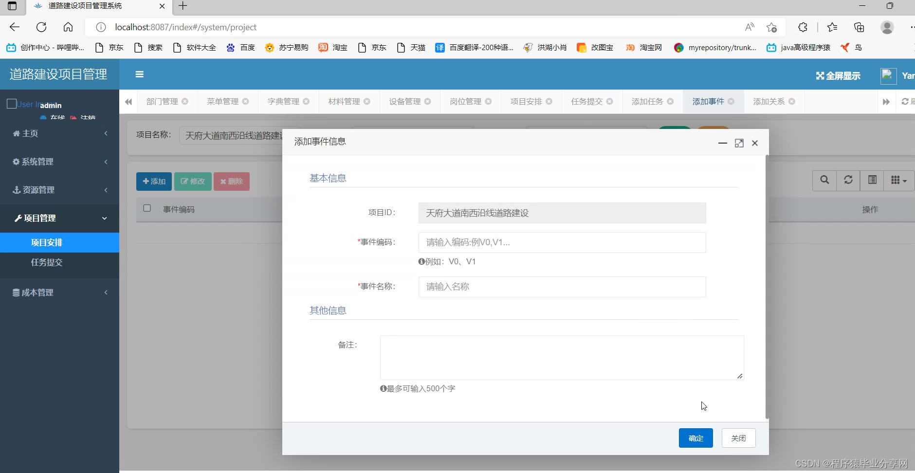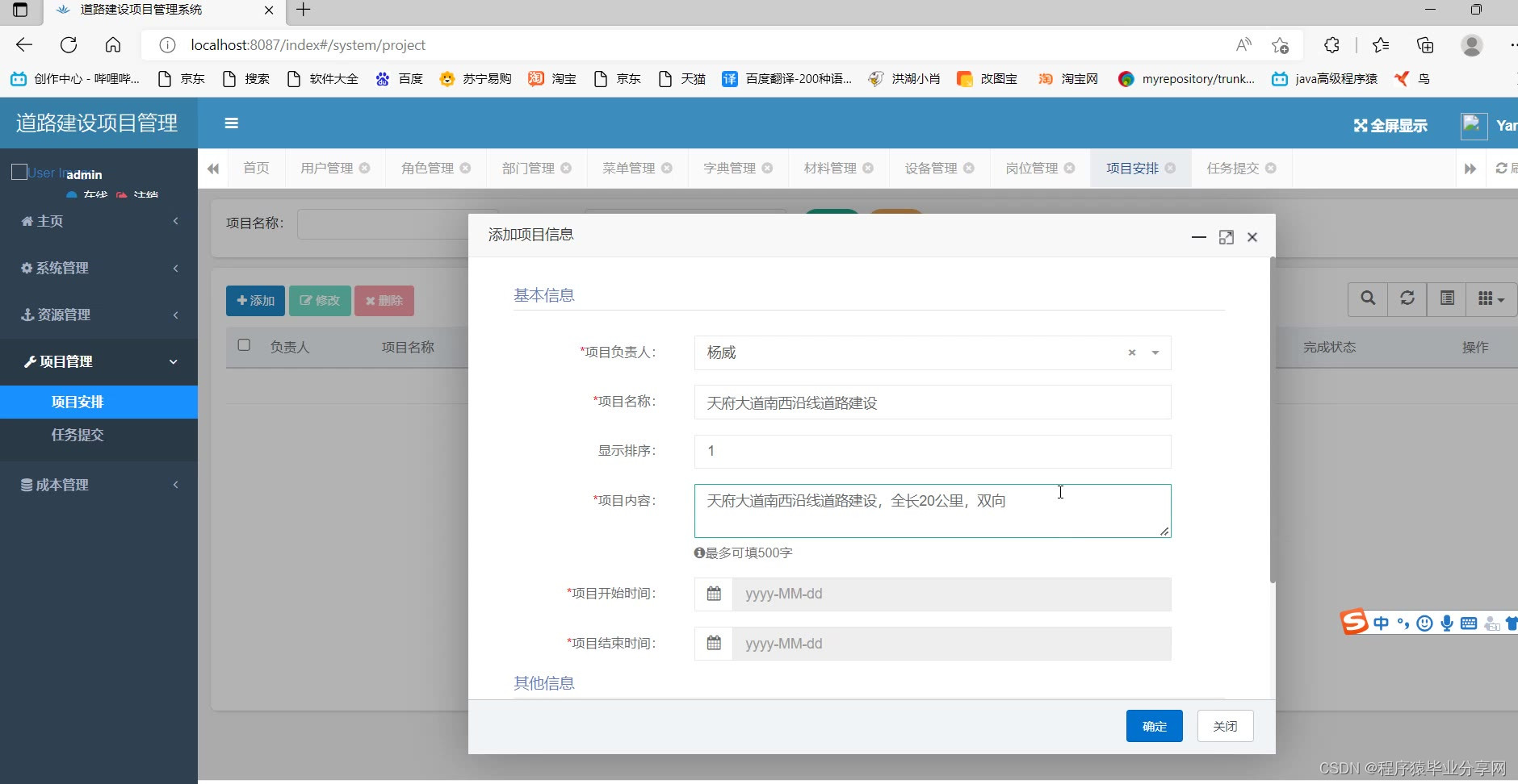 首先,对广东鸿高建设集团有限公司的道路建设项目进行了实地调研和分析,然后,在研究了当前主流的开发平台、技术以及数据库基础上,提出基于Spring Boot+MyBatis框架,采用Ajax、Maven等技术,采用MySQL5.7数据库完成系统的开发方案,运用面向对象分析法,最终实现一个具有用户管理、部门管理、项目安排、任务提交、设备管理、材料管理、岗位管理成本管理等功能的道路建设项目管理系统。为企业提供道路建设项目管理的信息化管理,实现科学规范的管理。