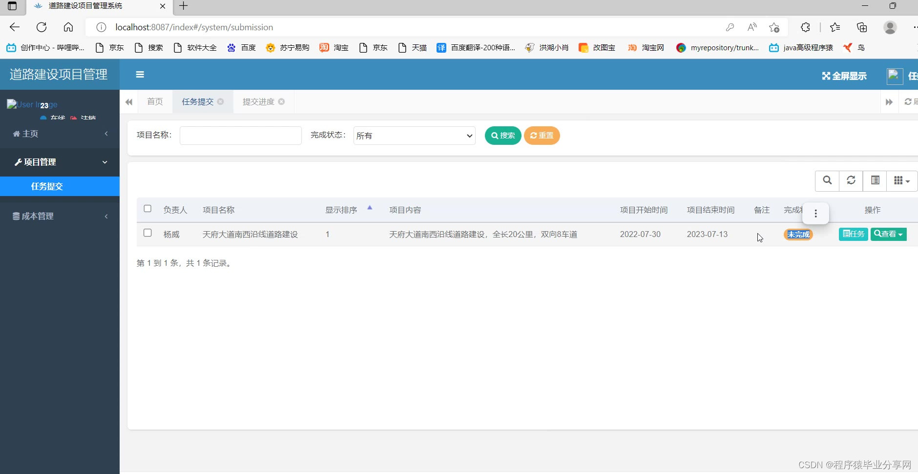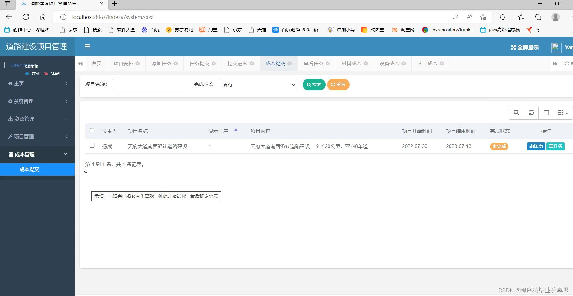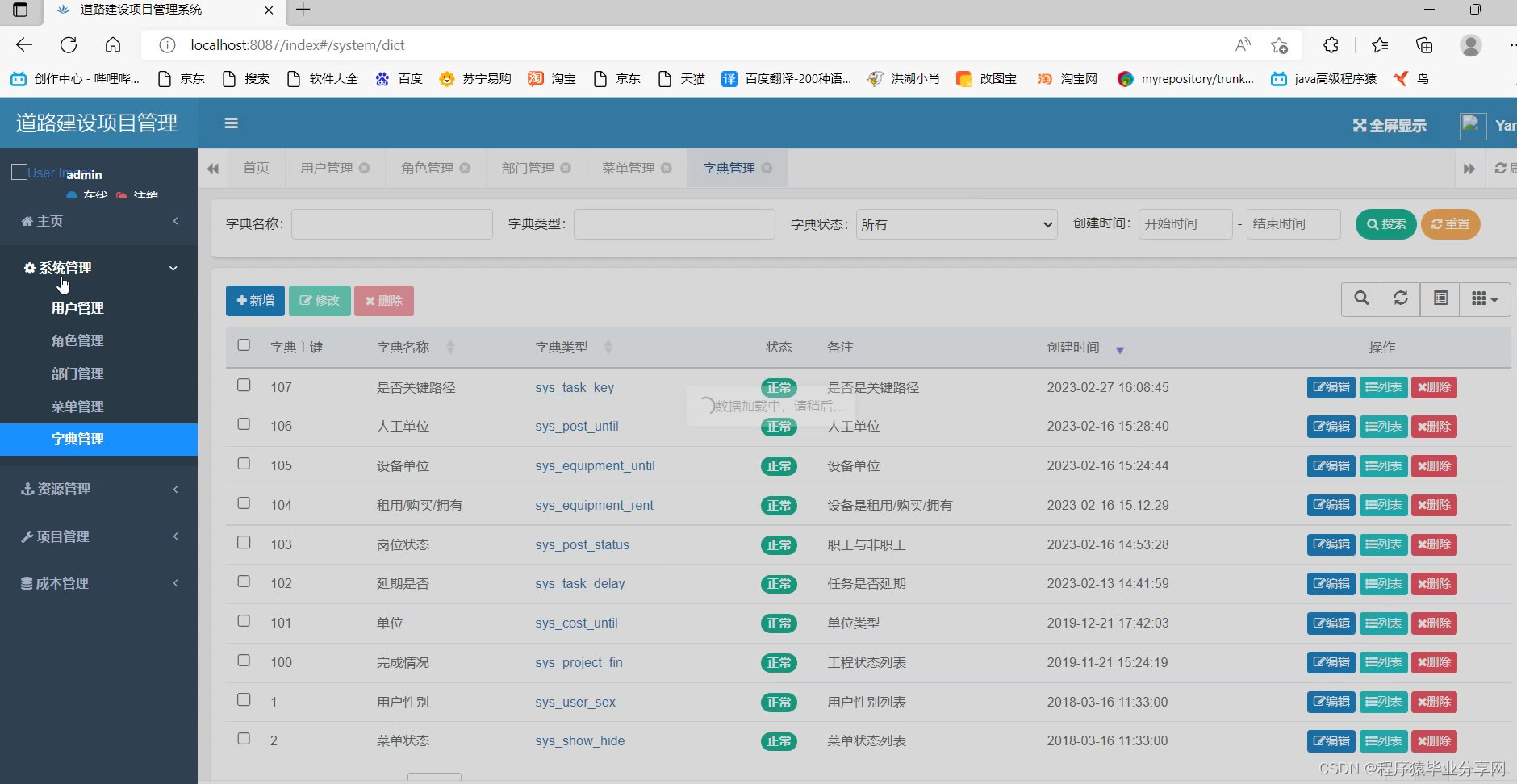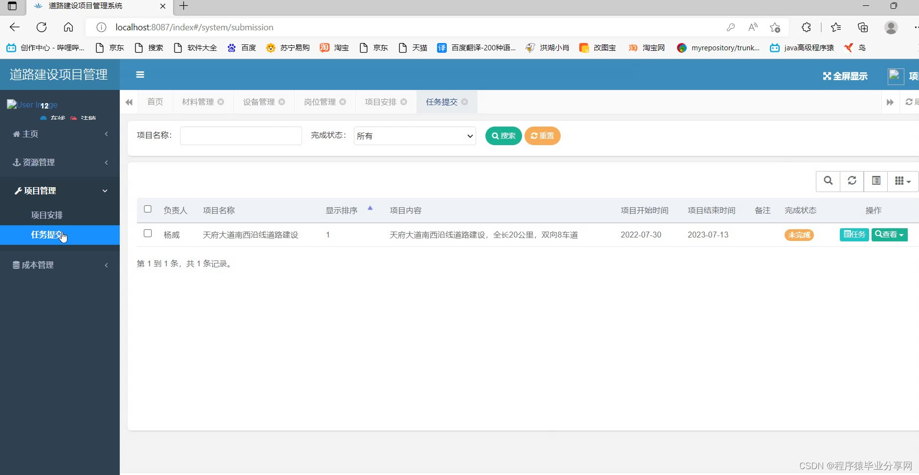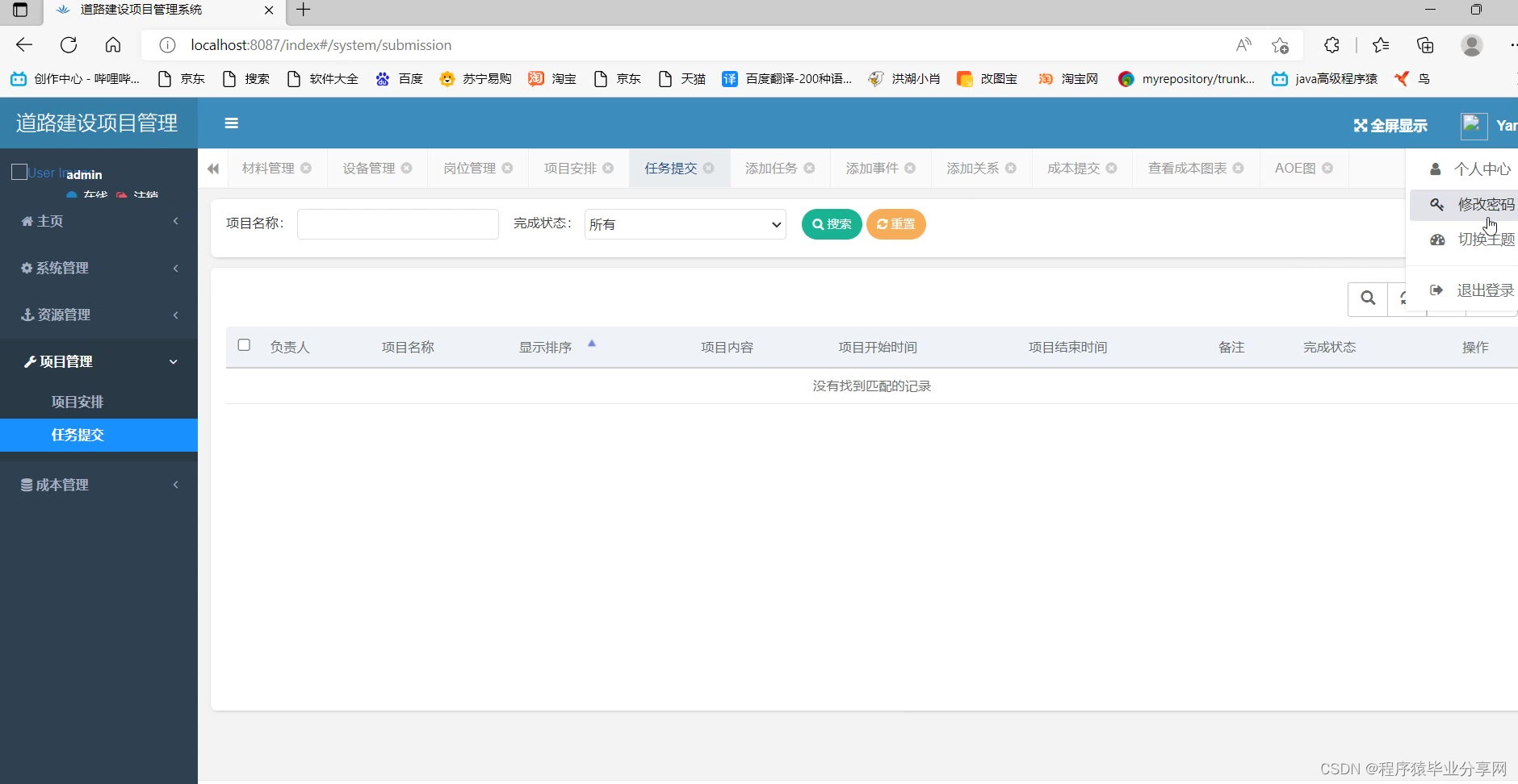首先,对广东鸿高建设集团有限公司的道路建设项目进行了实地调研和分析,然后,在研究了当前主流的开发平台、技术以及数据库基础上,提出基于Spring Boot+MyBatis框架,采用Ajax、Maven等技术,采用MySQL5.7数据库完成系统的开发方案,运用面向对象分析法,最终实现一个具有用户管理、部门管理、项目安排、任务提交、设备管理、材料管理、岗位管理成本管理等功能的道路建设项目管理系统。为企业提供道路建设项目管理的信息化管理,实现科学规范的管理。