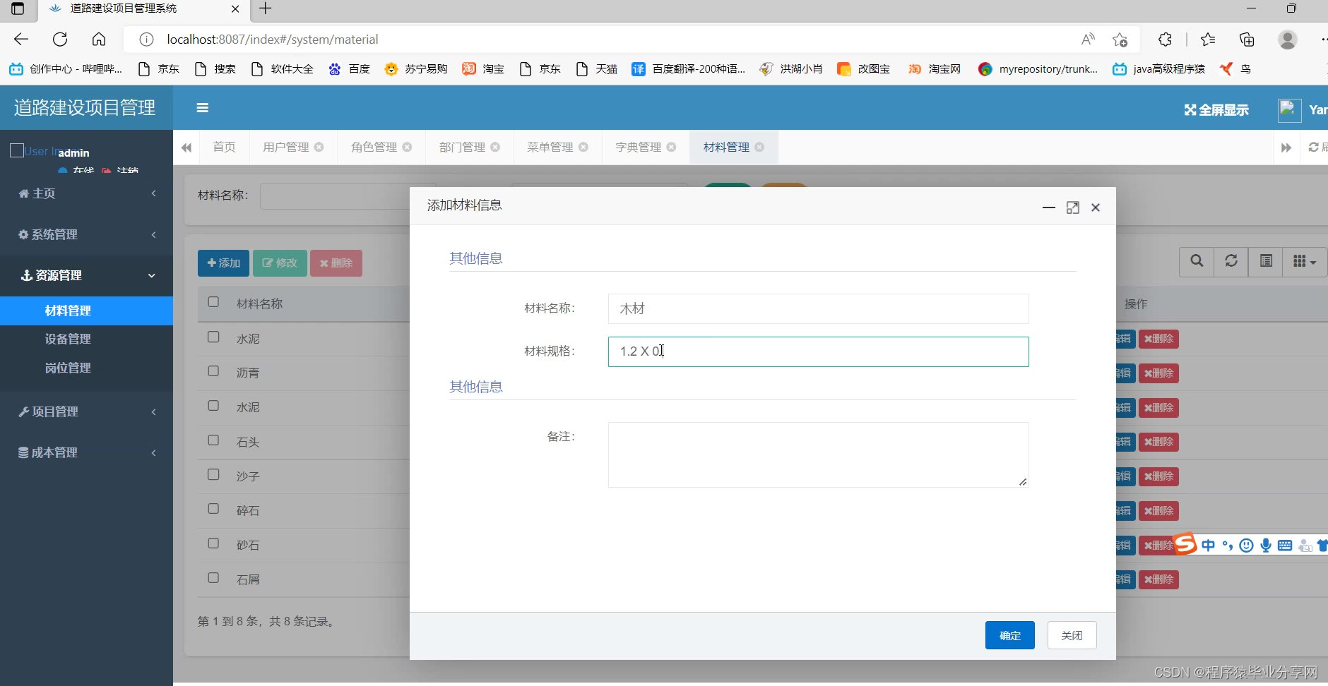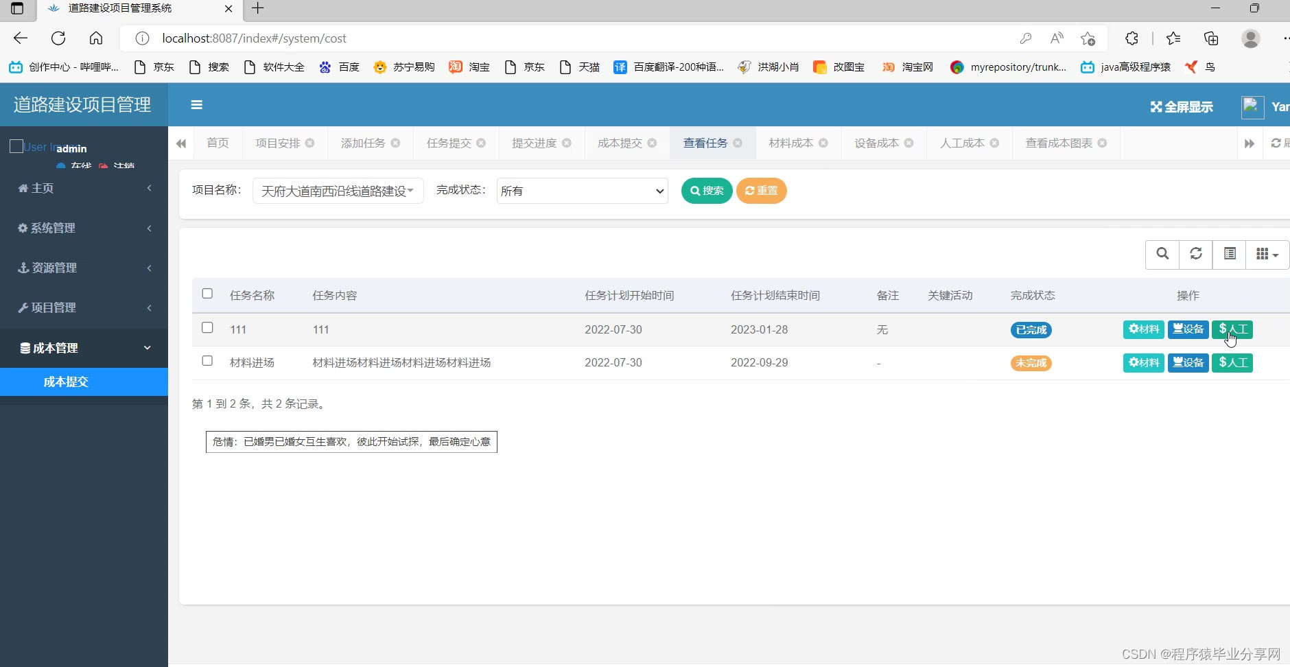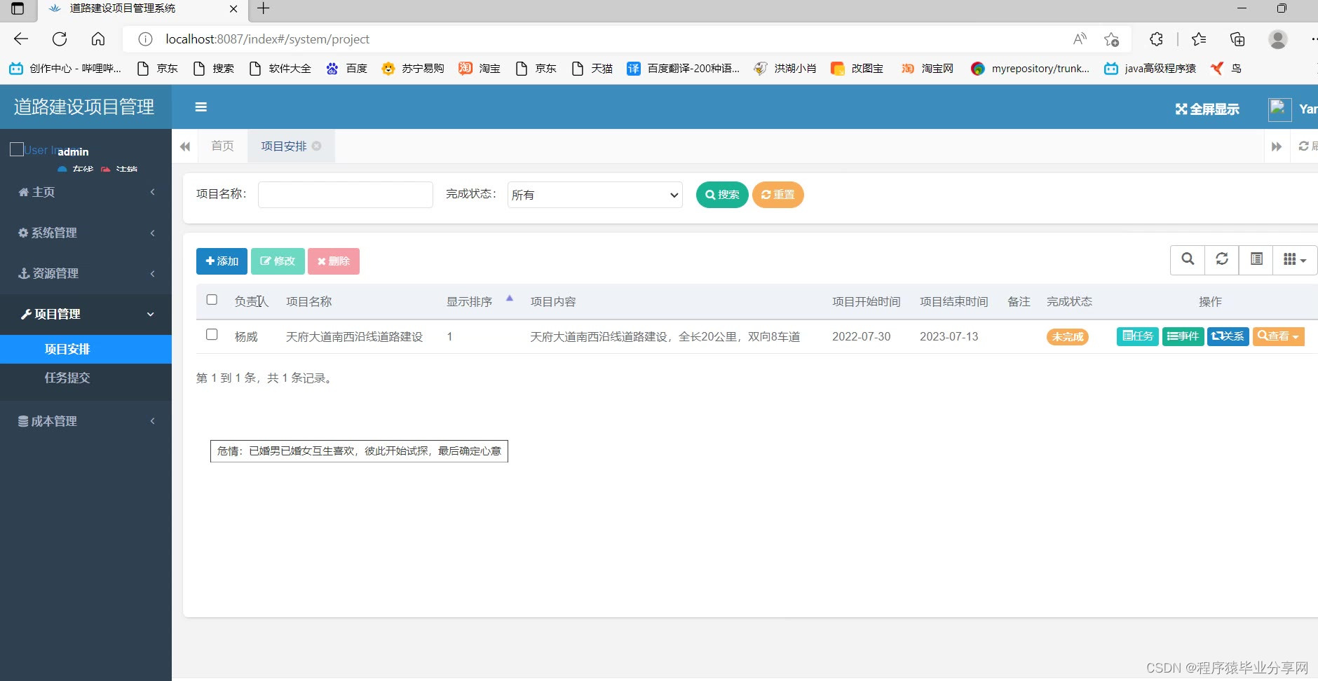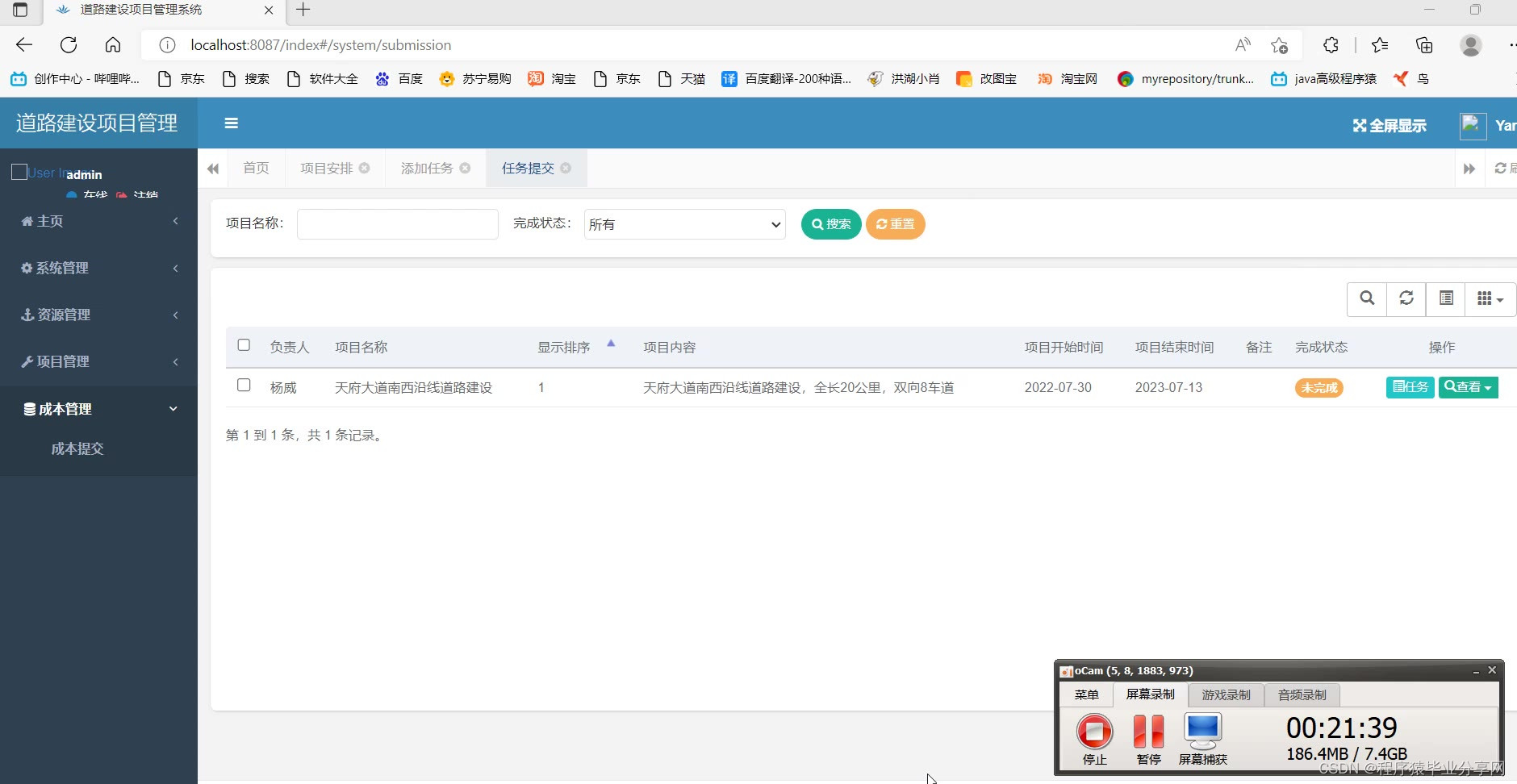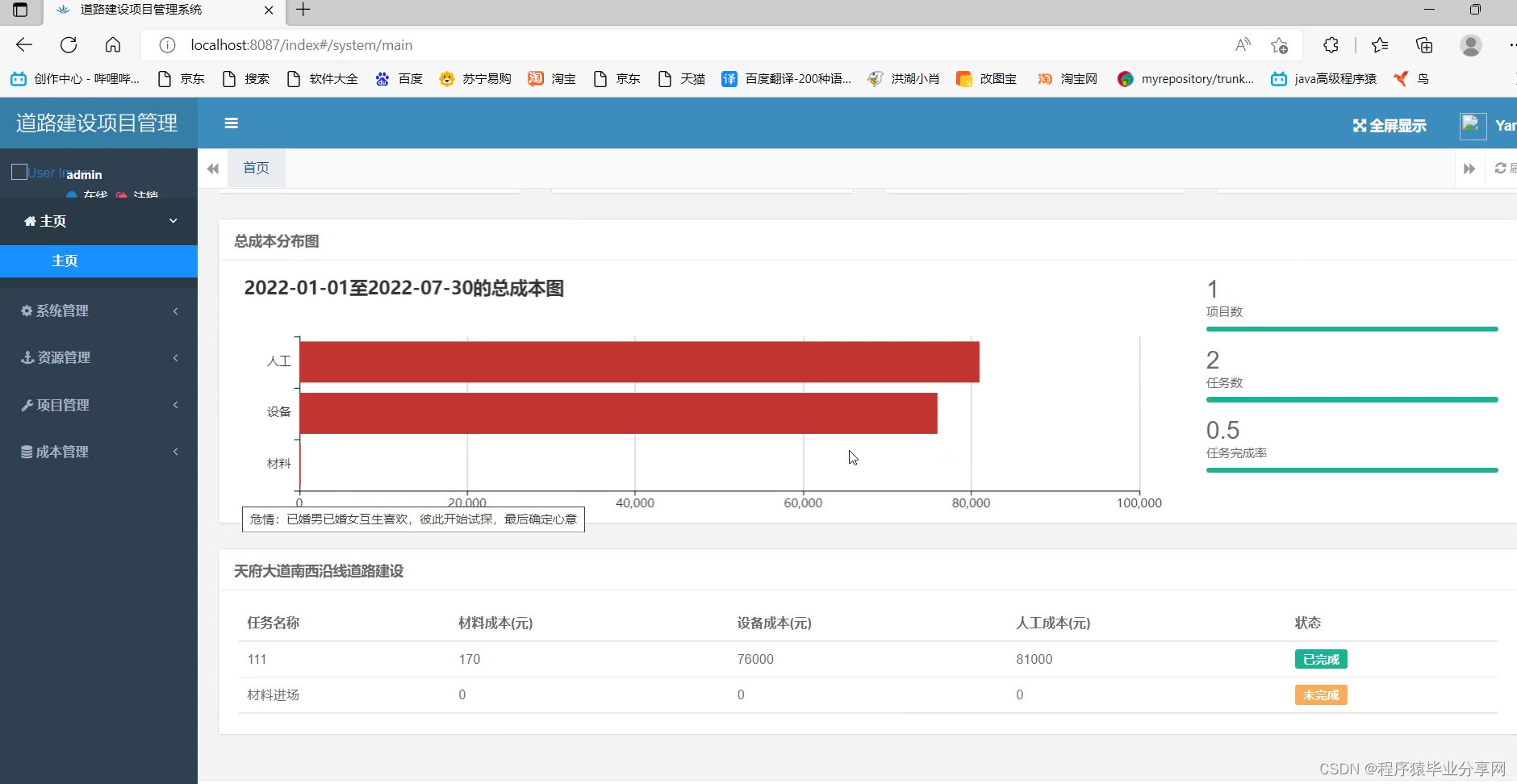 首先,对广东鸿高建设集团有限公司的道路建设项目进行了实地调研和分析,然后,在研究了当前主流的开发平台、技术以及数据库基础上,提出基于Spring Boot+MyBatis框架,采用Ajax、Maven等技术,采用MySQL5.7数据库完成系统的开发方案,运用面向对象分析法,最终实现一个具有用户管理、部门管理、项目安排、任务提交、设备管理、材料管理、岗位管理成本管理等功能的道路建设项目管理系统。为企业提供道路建设项目管理的信息化管理,实现科学规范的管理。