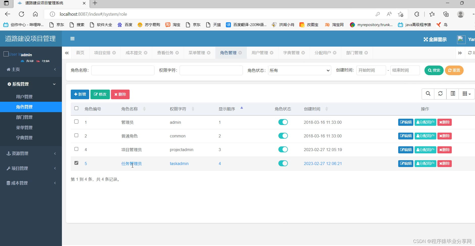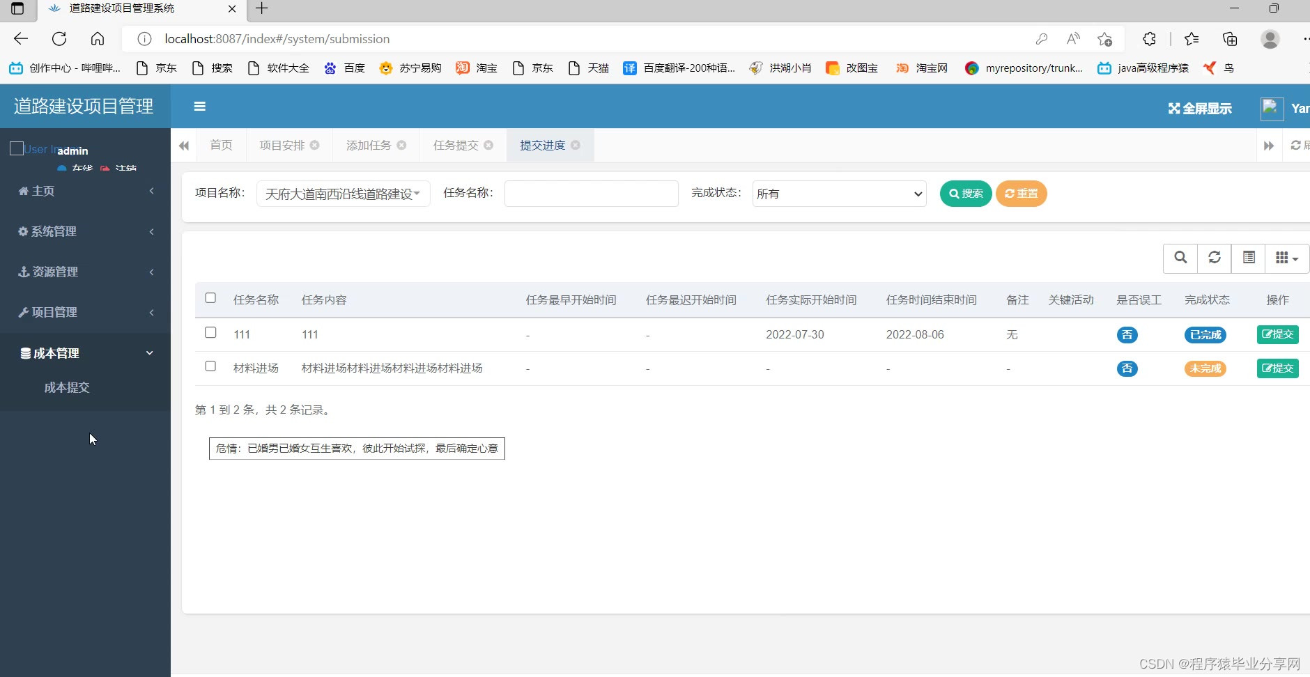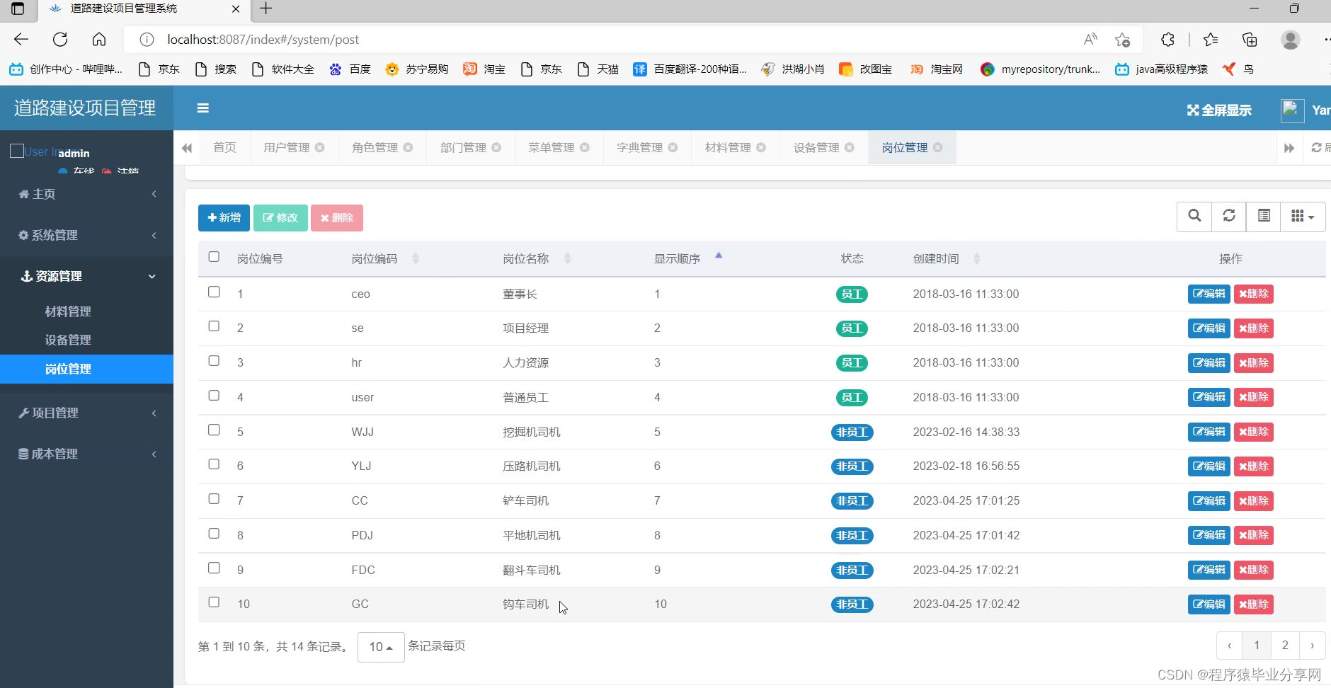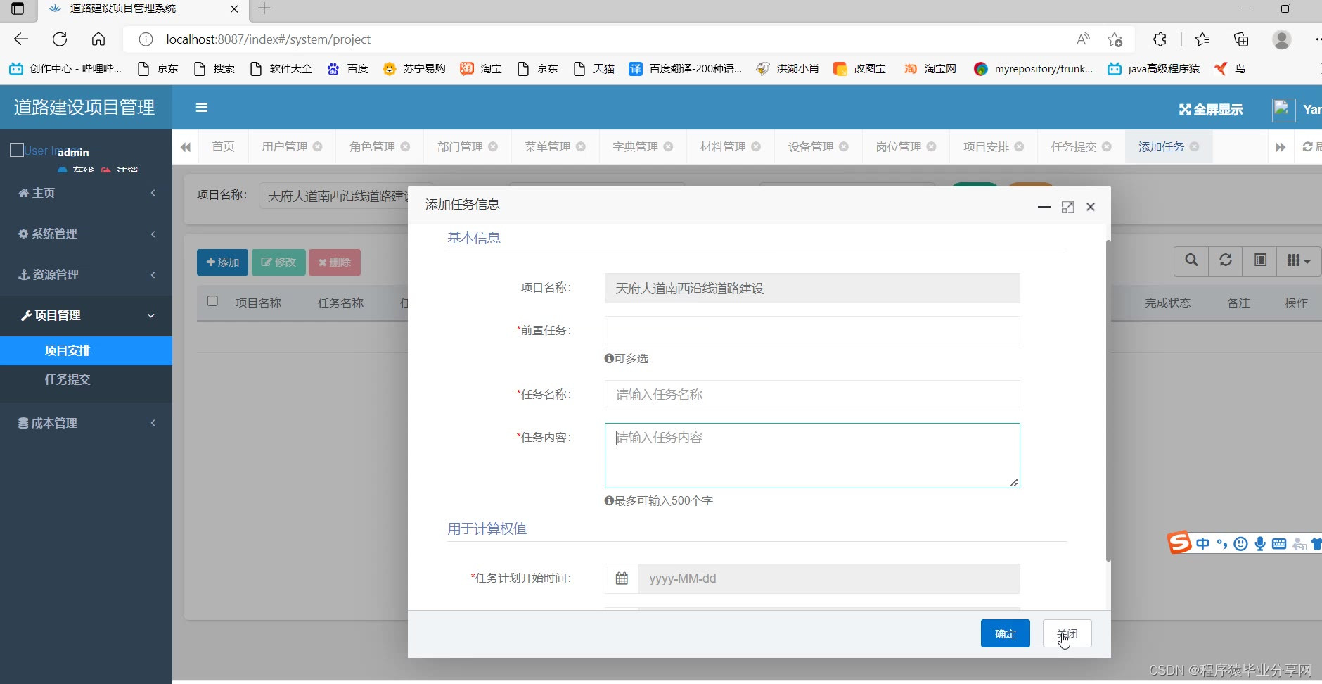 首先,对广东鸿高建设集团有限公司的道路建设项目进行了实地调研和分析,然后,在研究了当前主流的开发平台、技术以及数据库基础上,提出基于Spring Boot+MyBatis框架,采用Ajax、Maven等技术,采用MySQL5.7数据库完成系统的开发方案,运用面向对象分析法,最终实现一个具有用户管理、部门管理、项目安排、任务提交、设备管理、材料管理、岗位管理成本管理等功能的道路建设项目管理系统。为企业提供道路建设项目管理的信息化管理,实现科学规范的管理。