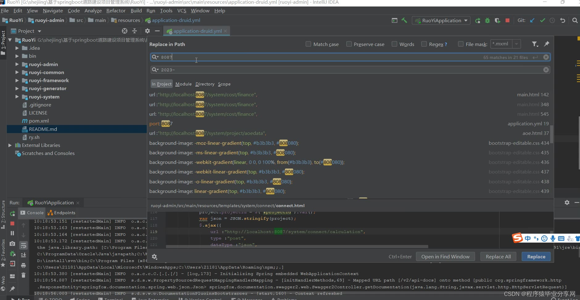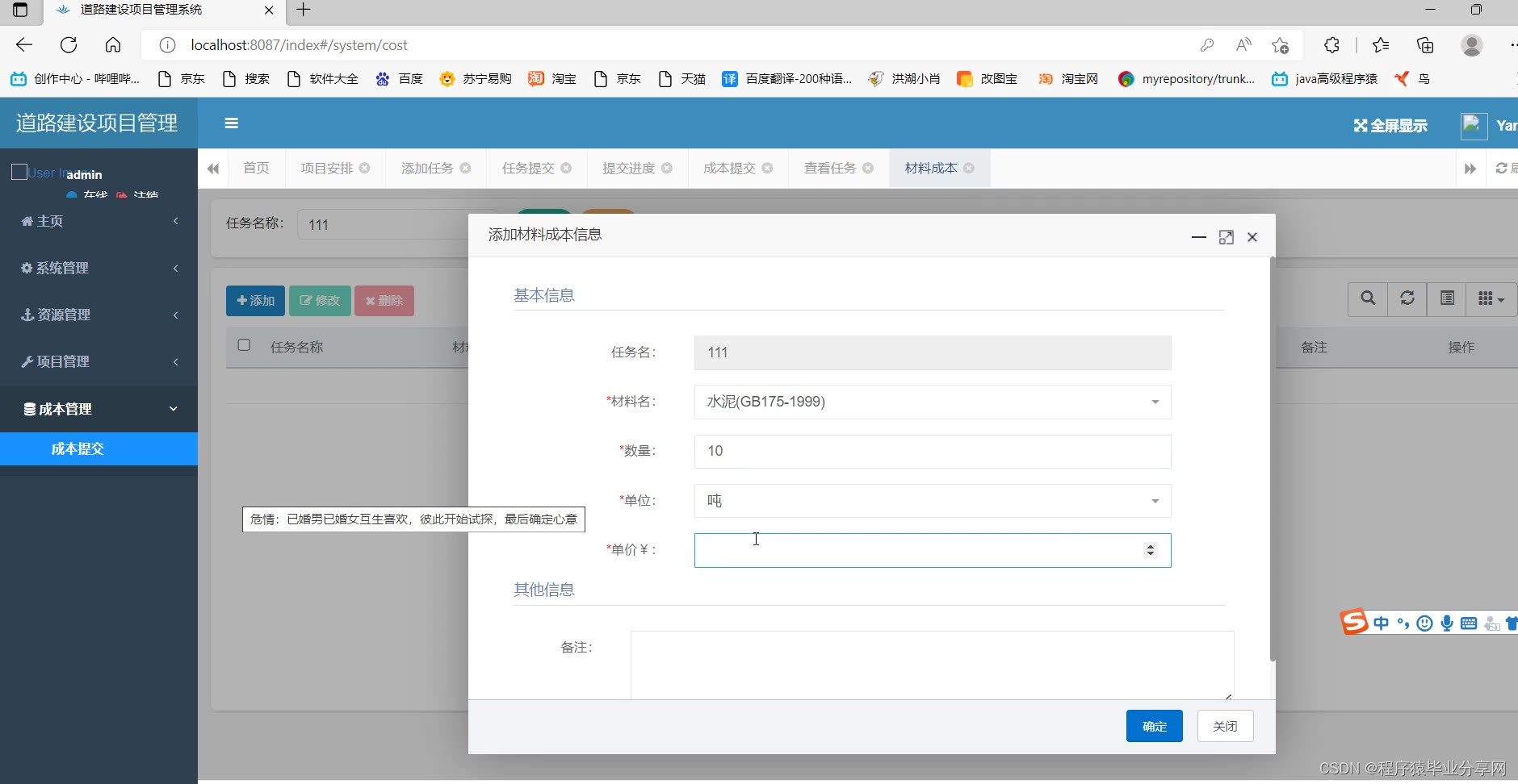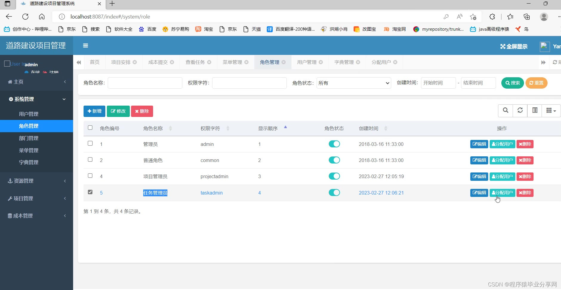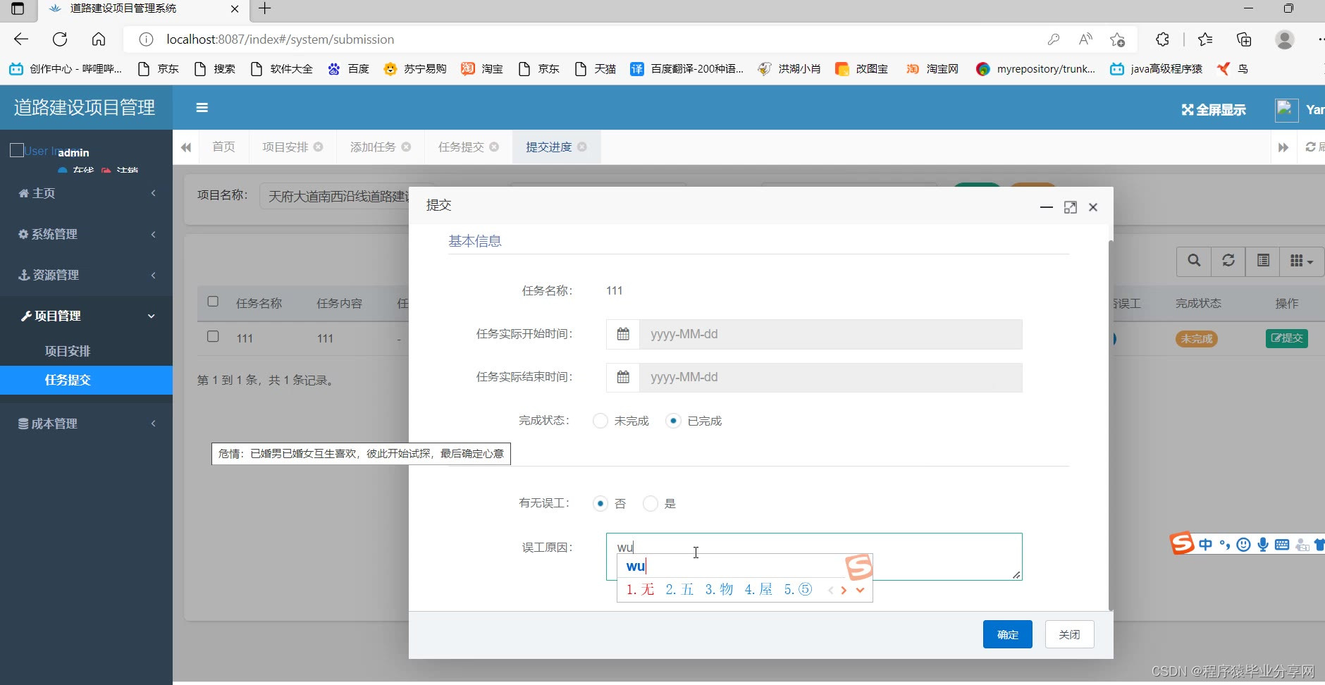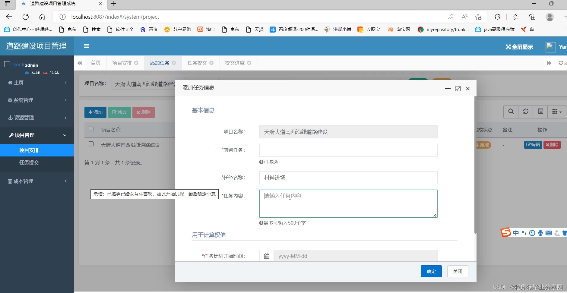 首先,对广东鸿高建设集团有限公司的道路建设项目进行了实地调研和分析,然后,在研究了当前主流的开发平台、技术以及数据库基础上,提出基于Spring Boot+MyBatis框架,采用Ajax、Maven等技术,采用MySQL5.7数据库完成系统的开发方案,运用面向对象分析法,最终实现一个具有用户管理、部门管理、项目安排、任务提交、设备管理、材料管理、岗位管理成本管理等功能的道路建设项目管理系统。为企业提供道路建设项目管理的信息化管理,实现科学规范的管理。