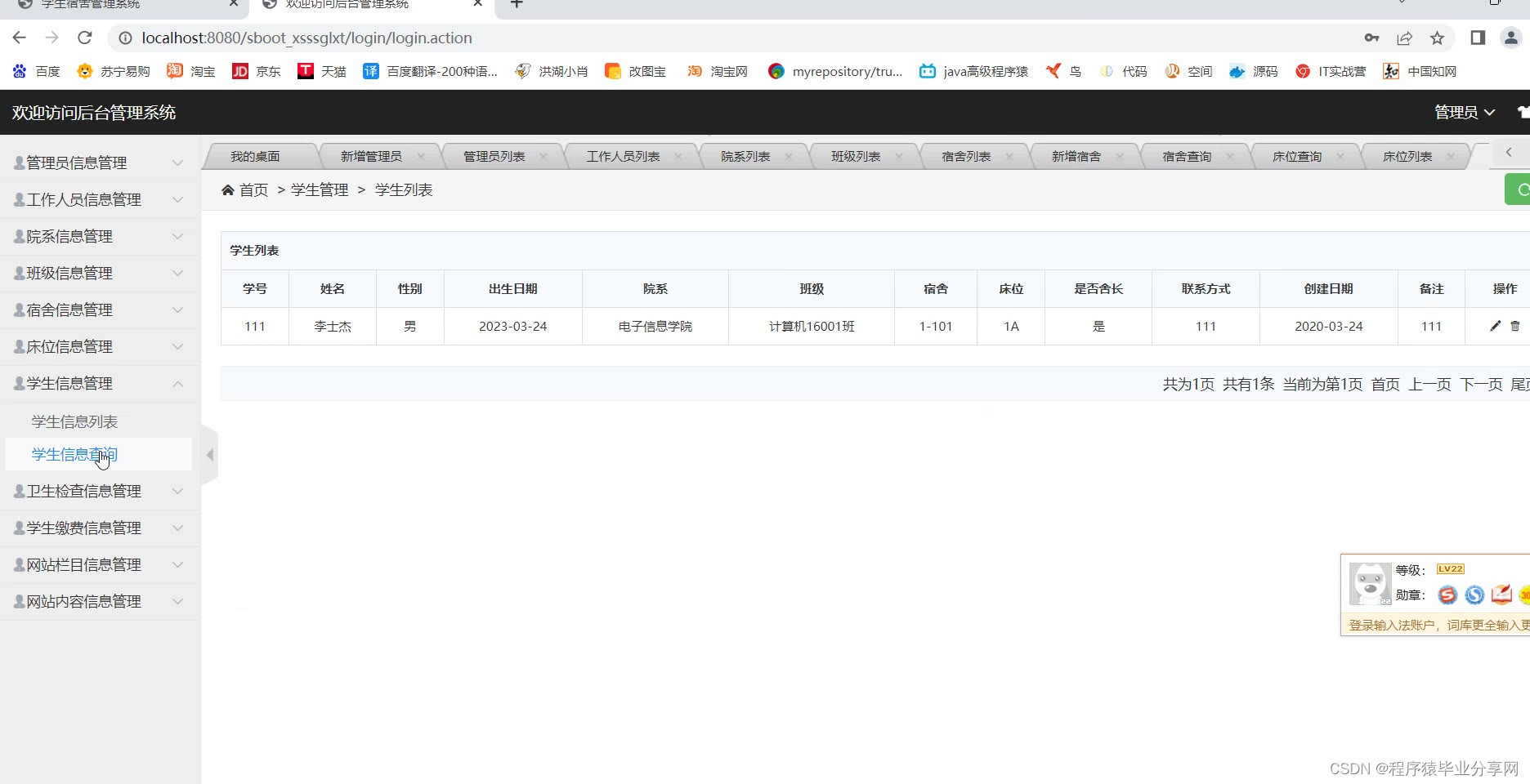 摘要:伴随着科技的发展,互联网已慢慢加入到大家的日常日常生活和学习中。大学生宿舍管理系统的运用愈来愈广泛,宿舍管理系统的功能也更加健全。伴随着社会的发展趋势,愈来愈多的宿舍管理系统运用到学生的生活中。与此同时也便捷了对学生的管理方法。文中主要是阐述了学生宿舍管理系统的功能以及建立的整个过程。