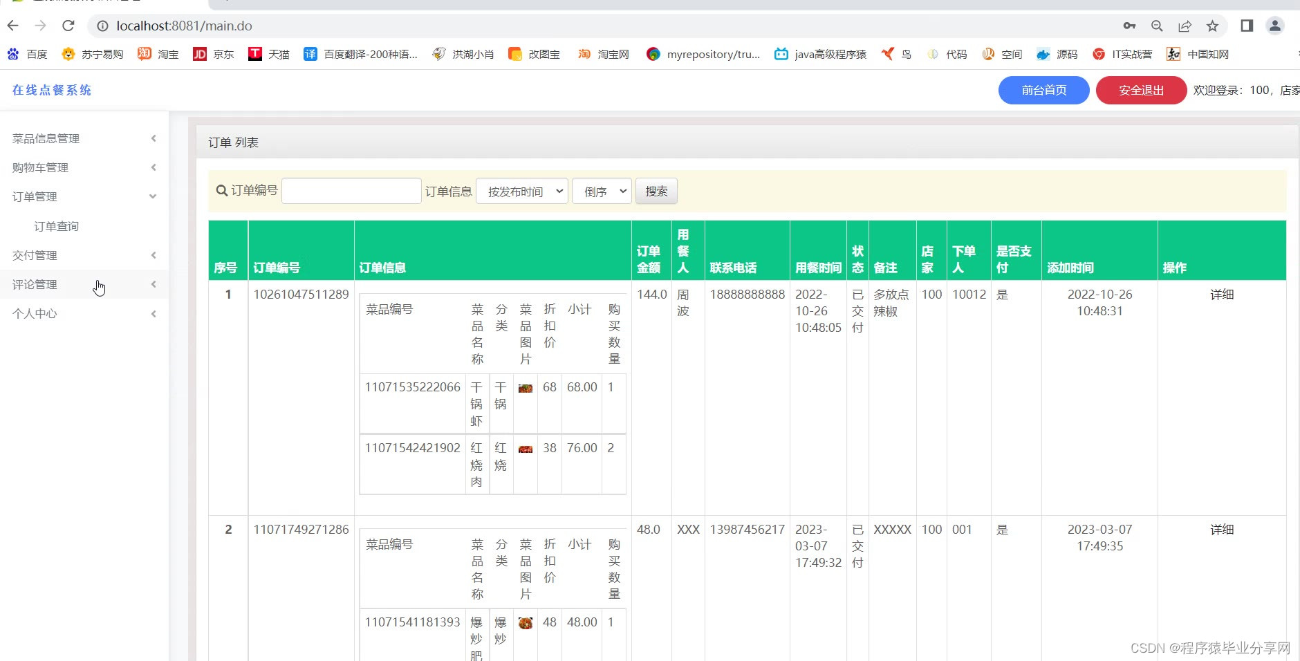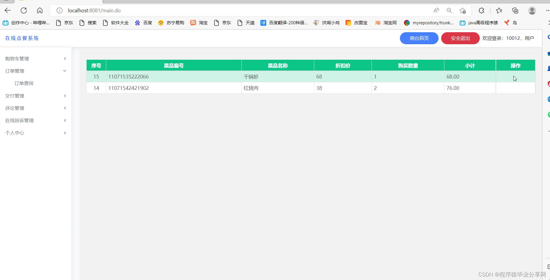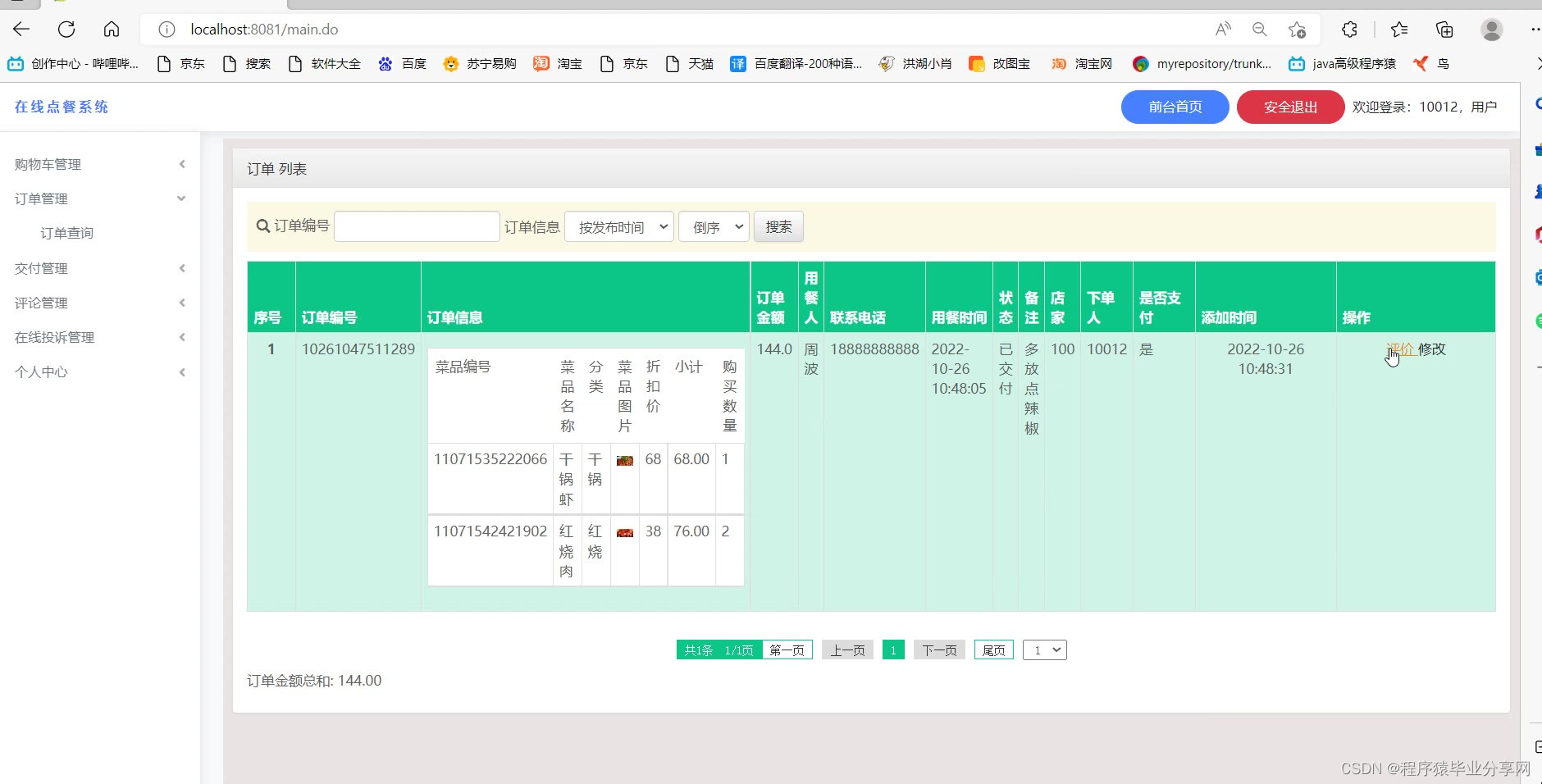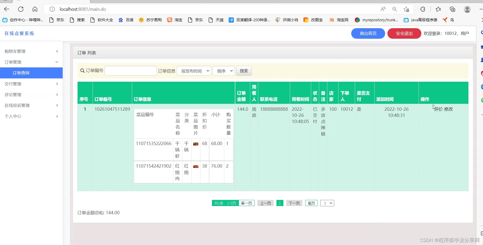 本点餐系统开发根据实际的市场需求调查,以人们具体订餐需要使用点餐服务进行作为开发系统出发点,从系统的需求分析到最终功能规划,从框架的搭建到各个模块功能的实现,本文基于springboot mybatis框架完整的实现了一个在线点餐系统,可以为消费者提供购买菜品、下单等多个功能。从测试结果来看,系统完整实现了所需功能,而且具有一定的 稳定性和可靠性,并能够为消费者提供良好的消费者体验。总之,本系统界面简洁、易操作、功能较多、安全性高、实用性强,是一个具有良好功能扩展性以及简单维护性的信息管理系统。该系统功能齐全,界面布局比较吸引人,功能比较全,操作简单,符合当今社会的发展趋势。