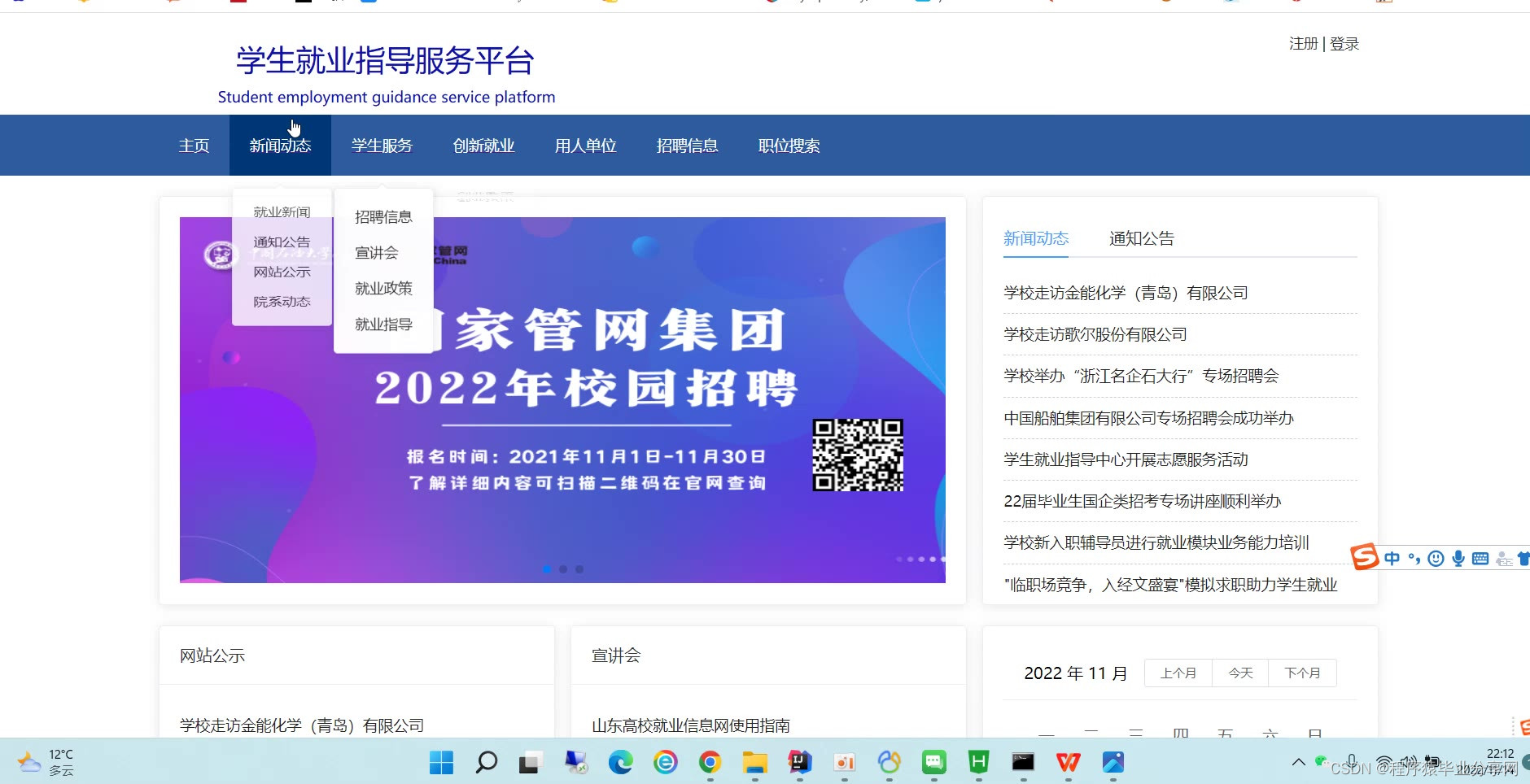The idea of this paper is as follows: First, introduce the background, source, significance, ultimate Student employment managementl and technology used to develop the system; Secondly, the system needs analysis; Thirdly, the system is designed in detail; Then, the implementation and testing of the system; Finally, the summary of the system and future prospects.