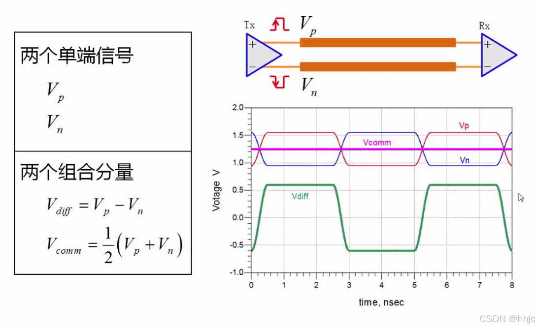 两个信号沿着各自的传输线传输,到达接收器时,接收器对两个信号进行差分检测,从两个信号的差值信号中提取信息,这个差值信号称为差分信号。如果不考虑两个信号之间的特殊关系,对于其中任意一个信号和普通的单端信号没有什么区别,在传输线上传输时也遵循单端信号传输的各种规律。