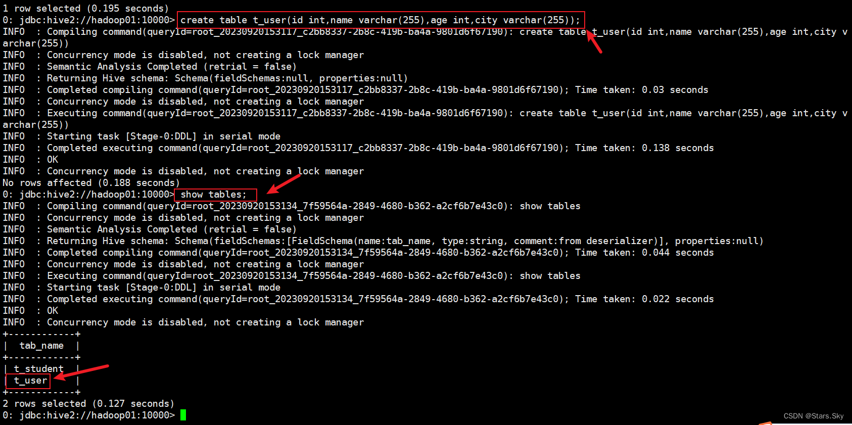 在 hive 中创建一张表 t_user。注意:字段的类型顺序要和文件中字段保持一致。