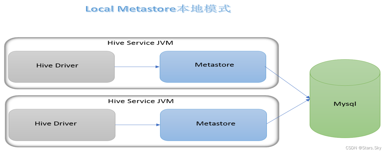 本地模式(Local Metastore)下,Metastore 服务与主 HiveServer 进程在同一进程中运行,但是存储元数据的数据库在单独的进程中运行,并且可以在单独的主机上。metastore 服务将通过 JDBC 与 metastore 数据库进行通信。