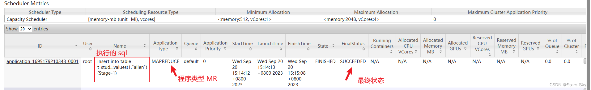 首先登陆 Hadoop YARN 上观察是否有 MapReduce 任务执行痕迹。 YARN Web UI:http://hadoop01:8088/cluster