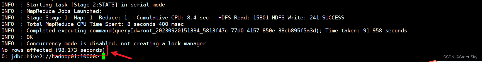 最终插入一条数据,历史 98 秒的时间。查询表数据,显示数据插入成功: