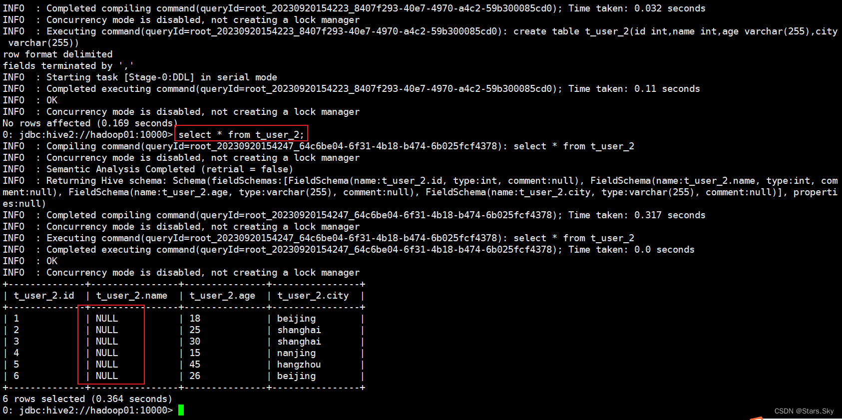此时发现,有的列显示 null,有的列显示正常。name 字段本身是字符串,但是建表的时候指定 int,类型转换不成功;age 是数值类型,建表指定字符串类型,可以转换成功。说明 hive 中具有自带的类型转换功能,但是不一定保证转换成功。