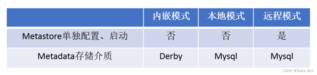 metastore 服务配置有 3 种模式:内嵌模式、本地模式、远程模式。区分 3 种配置方式的关键是弄清楚两个问题: