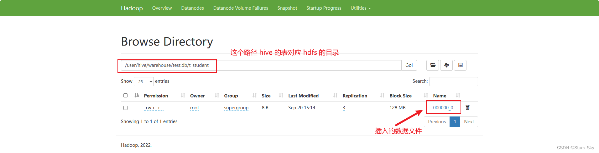 然后登陆 Hadoop HDFS 浏览文件系统,根据 Hive 的数据模型,表的数据最终是存储在 HDFS 和表对应的文件夹下的。
