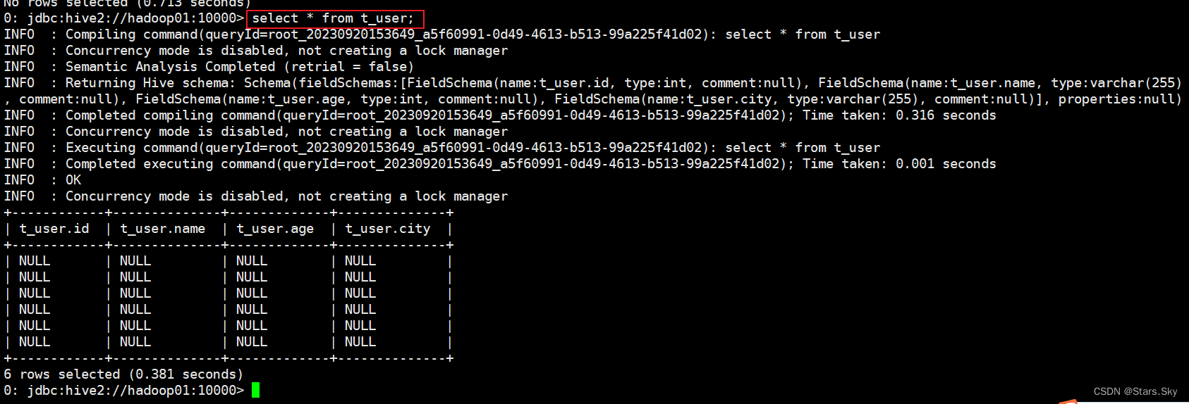 执行数据查询操作,发现表中并没有数据。猜想 1:难道数据文件要放置在表对应的 HDFS 路径下才可以成功?使用 HDFS 命令将数据移动到表对应的路径下。