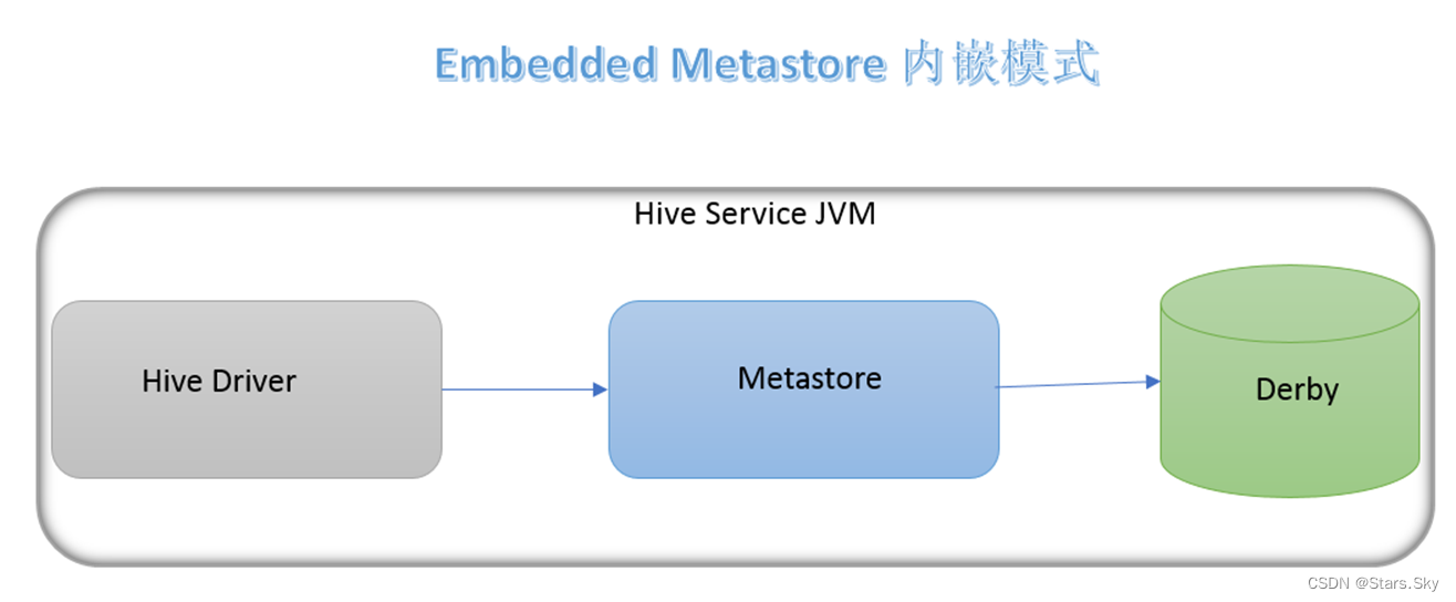 内嵌模式(Embedded Metastore)是 metastore 默认部署模式。此种模式下,元数据存储在内置的 Derby 数据库,并且 Derby 数据库和 metastore 服务都嵌入在主 HiveServer 进程中,当启动 HiveServer 进程时,Derby 和 metastore 都会启动。不需要额外起 Metastore 服务。但是一次只能支持一个活动用户,适用于测试体验,不适用于生产环境。