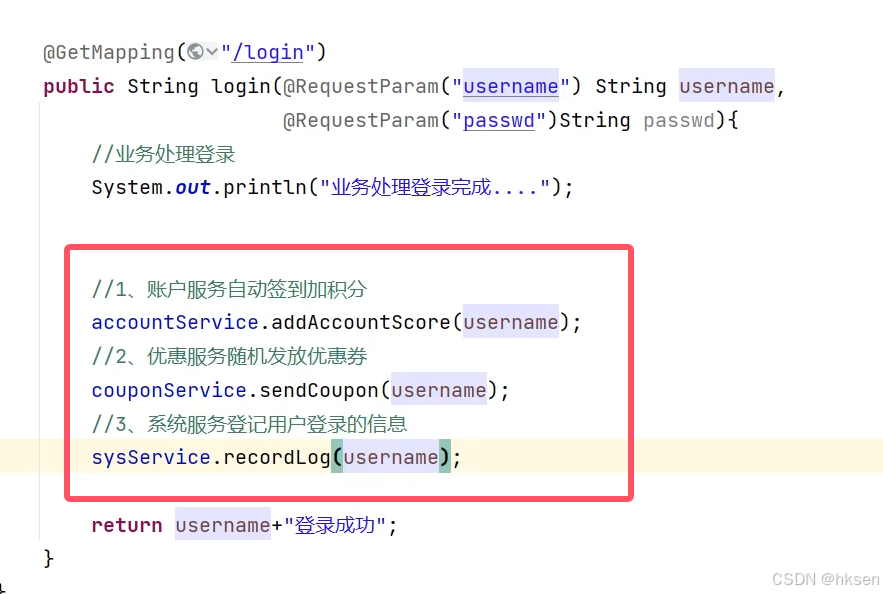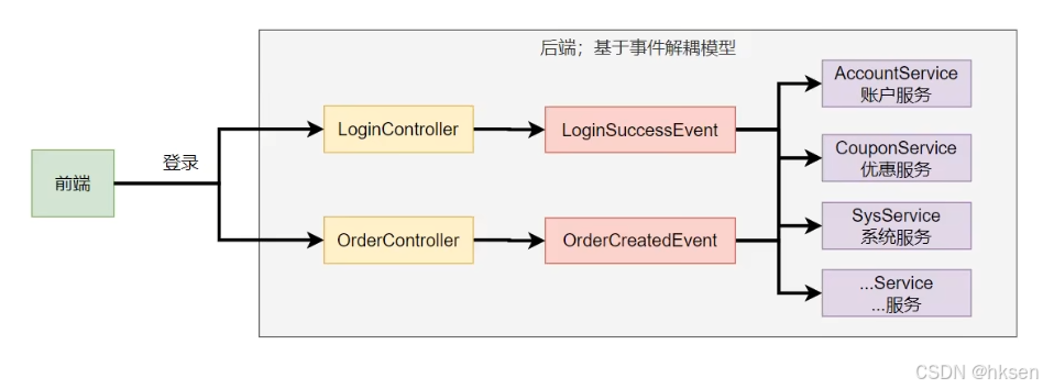 - 用户登录后,我们基于用户登录的信息,会调用账户服务、优惠服务、系统服务....,一般的代码应该是这样去写的,注入各种各样的服务,如果后续还有操作,继续往下增加对应的业务,但设计模式中我们应该新增开发,对修改要关闭,利用事件以后,我们只需要发送一个事件,其余服务监听这个事件做对应的操作即可