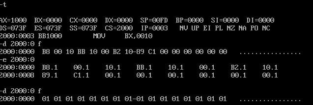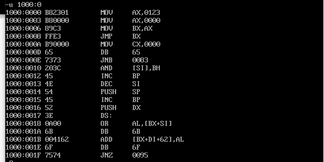 -u 1000:0 (表示将1000:0开始的机器码翻译成汇编指令)
