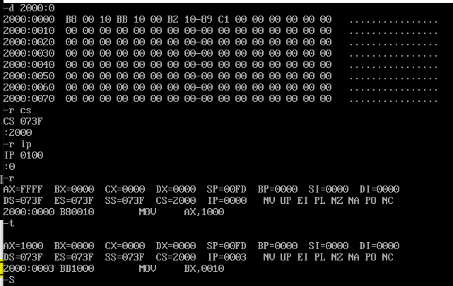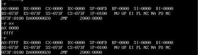 r 可以查看CPU中所有寄存器中的内容,它还将CS:IP所指向的机器码翻译成汇编指令,还可以改变寄存器中的内容