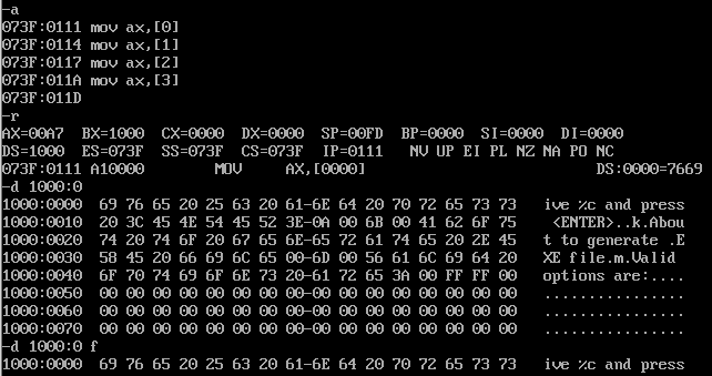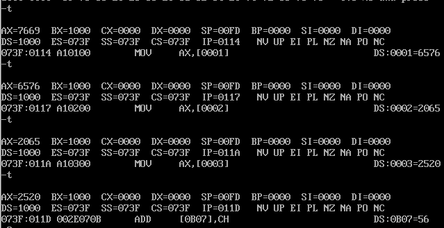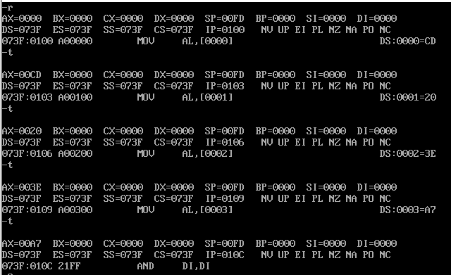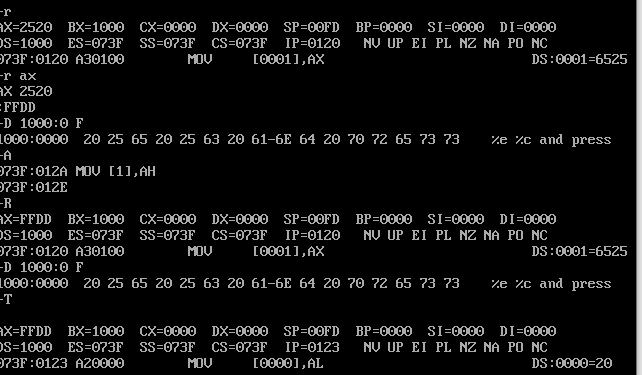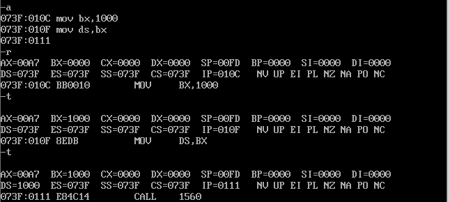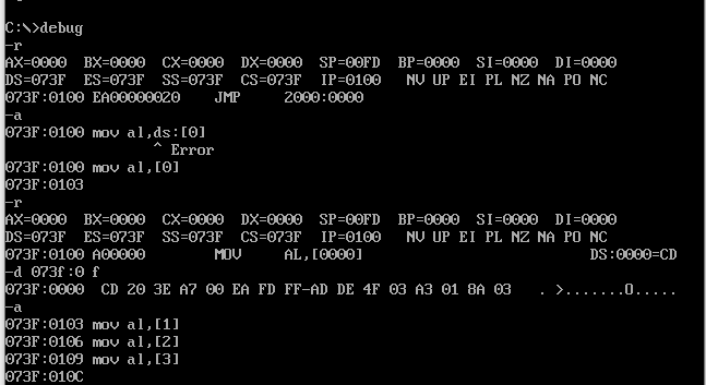 mov al,ds:[0] mov移动指令 CPU中的AL寄存器,内存地址(冒号左边ds段地址寄存器:冒号右边是偏移地址) 两个方括号是将段地址ds和偏移地址进行组合得到的物理地址,得到里面的内容