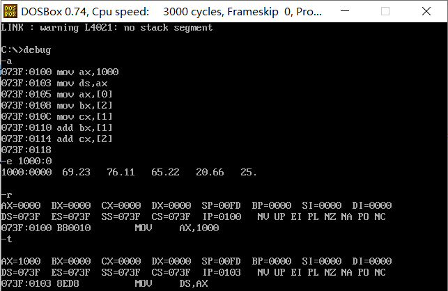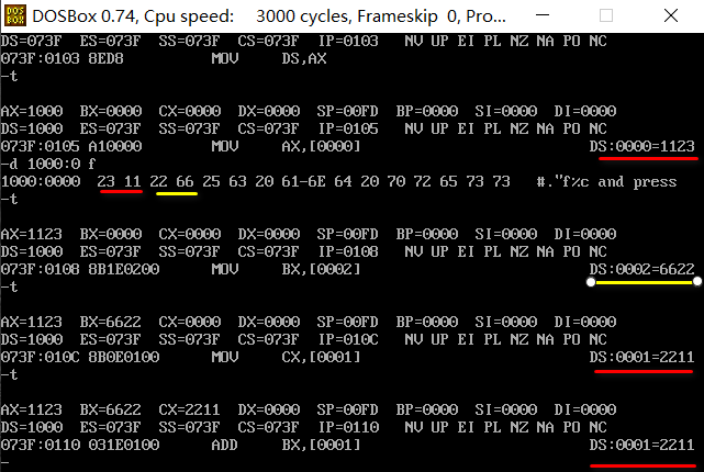 mov cx,ds:[1] 10002H 22H ——》 [1]=2211H cx=2211H+6622H=8833H