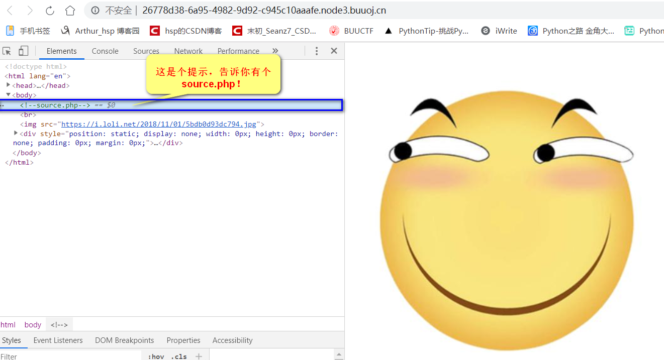 2、出现一个滑稽头像并按快捷键F12查看源码,出现提示信息source.php